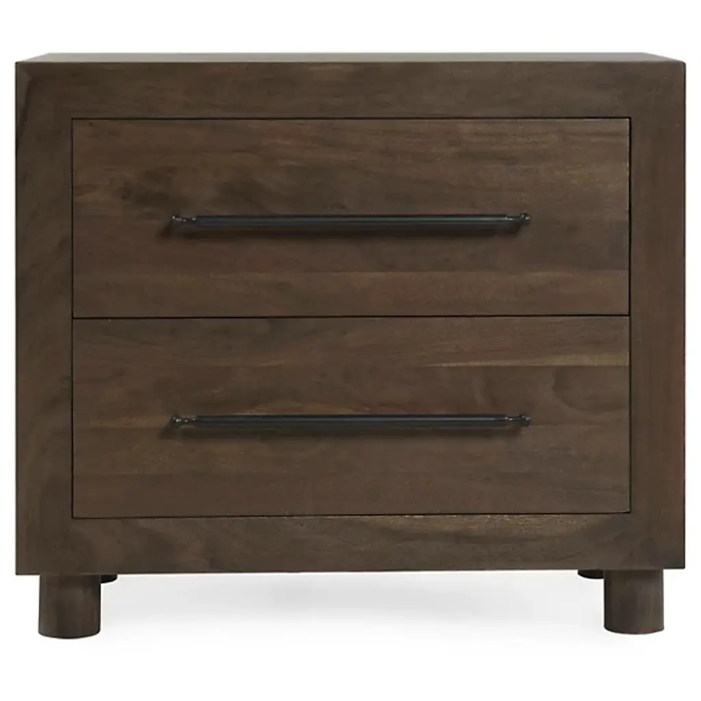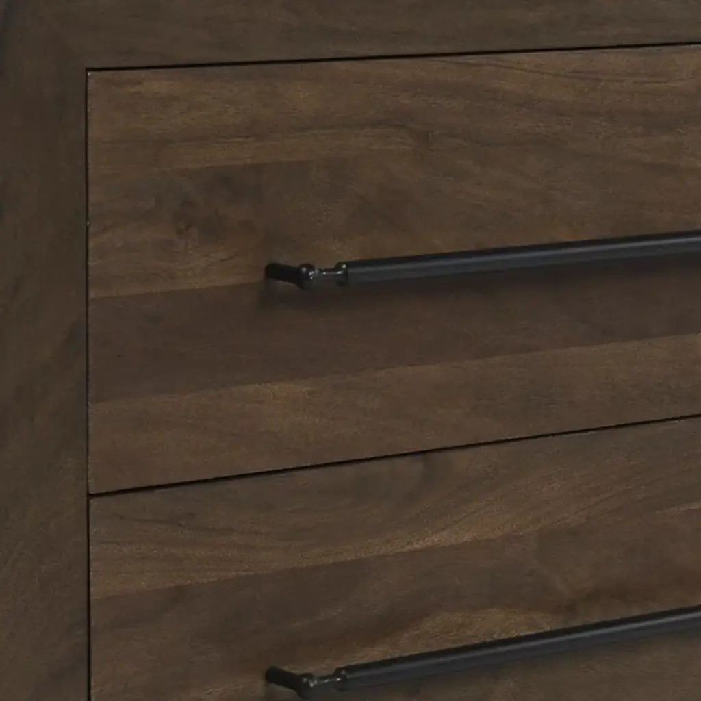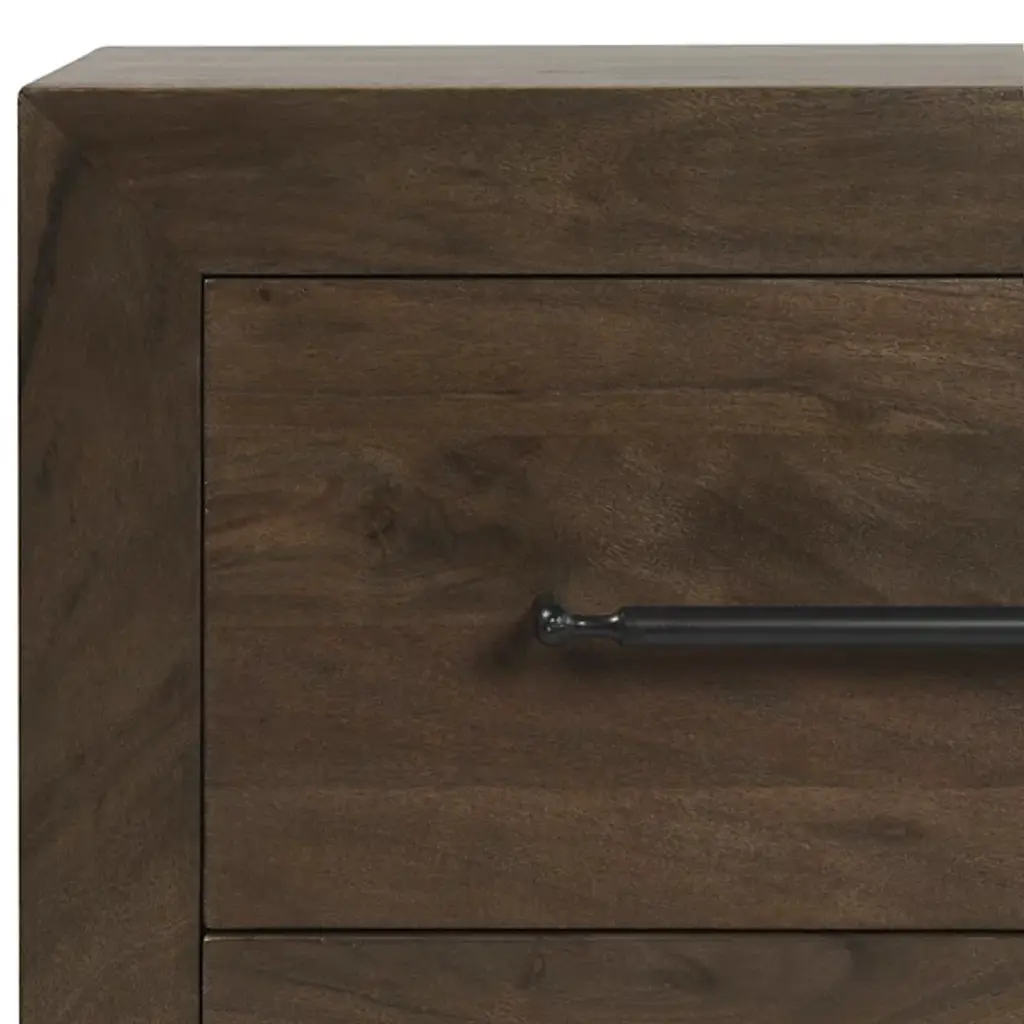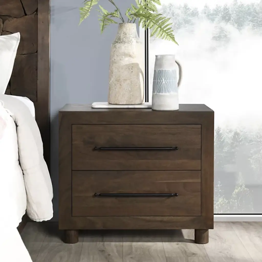 The Jaxon Nightstand from Classic Home integrates two roomy drawers with full-extension glides for bedside organization. The acacia wood body stands on sturdy legs that lift it off the ground for a lighter presence. Its metal bar pulls stretch across each drawer front, making access effortless. The multi-step hand finishing highlights the wood's organic patterns. This nightstand puts essential items within arm's reach while maintaining organized storage. The proportions work well beside both platform and traditional bed heights.