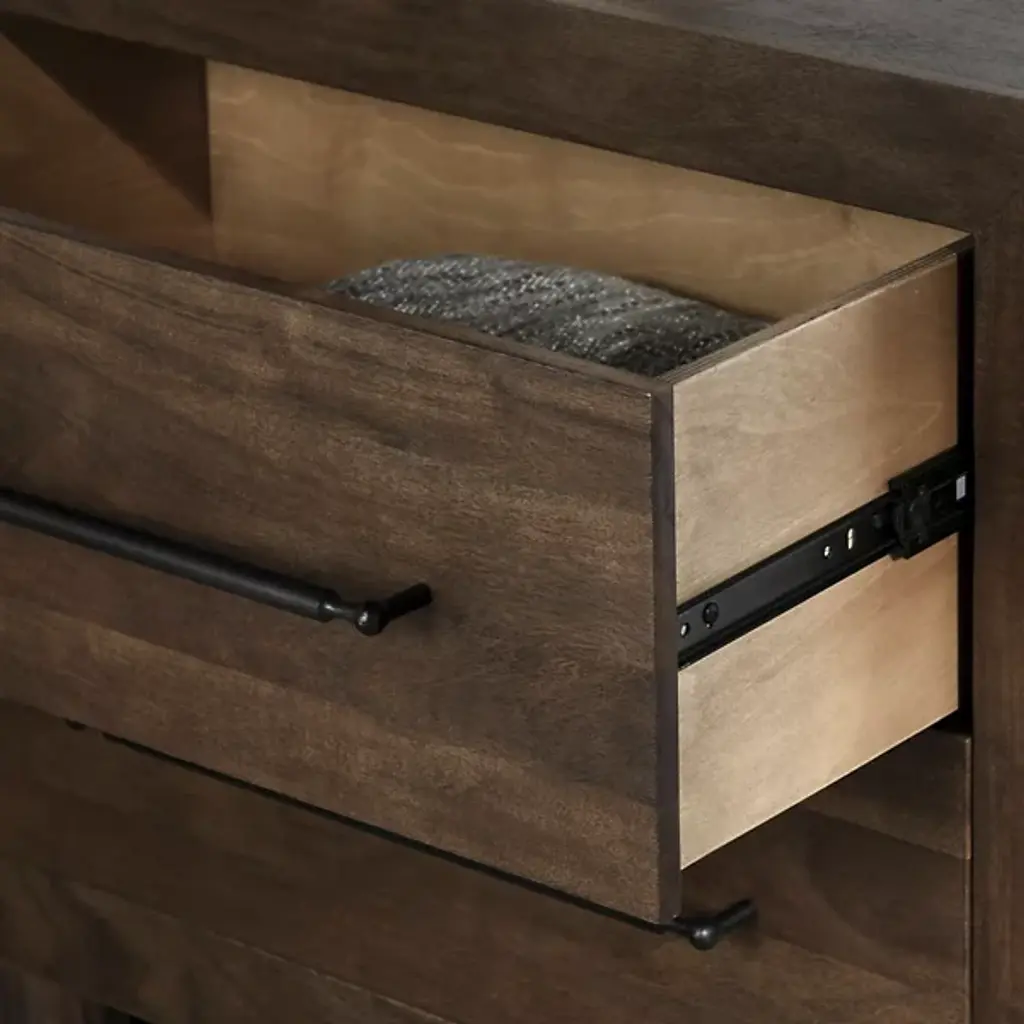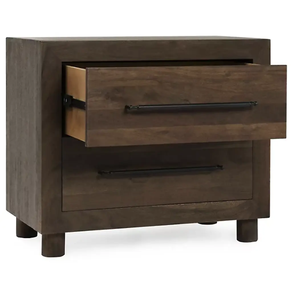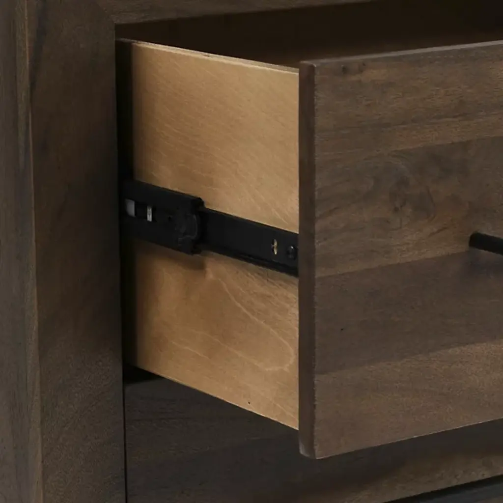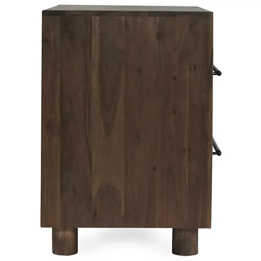 The Jaxon Nightstand from Classic Home integrates two roomy drawers with full-extension glides for bedside organization. The acacia wood body stands on sturdy legs that lift it off the ground for a lighter presence. Its metal bar pulls stretch across each drawer front, making access effortless. The multi-step hand finishing highlights the wood's organic patterns. This nightstand puts essential items within arm's reach while maintaining organized storage. The proportions work well beside both platform and traditional bed heights.