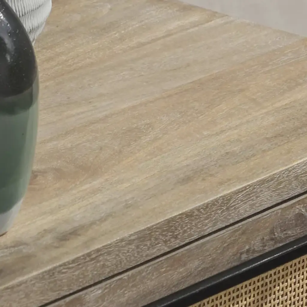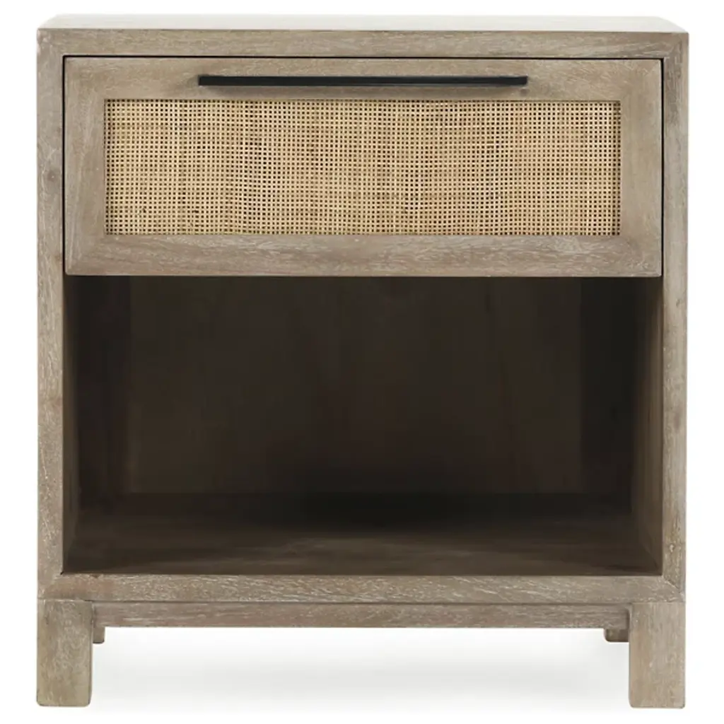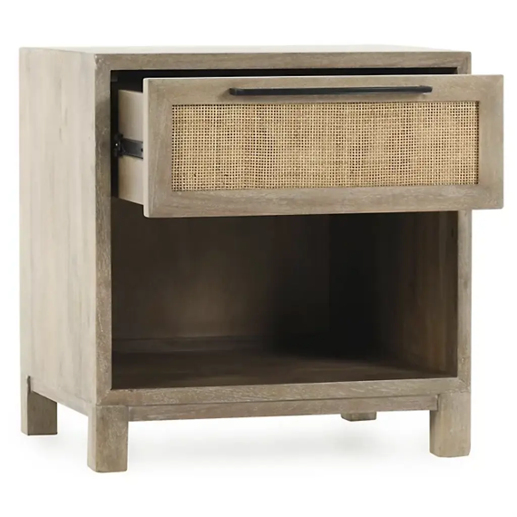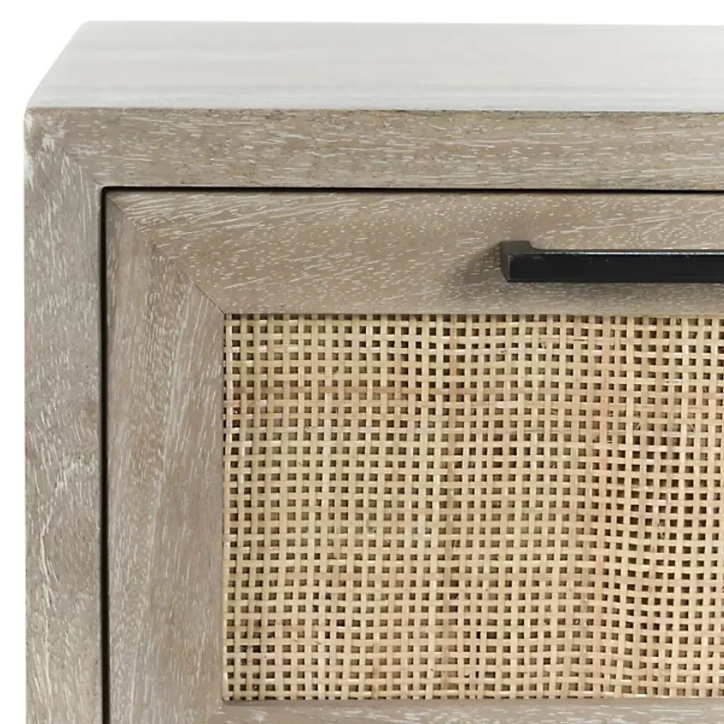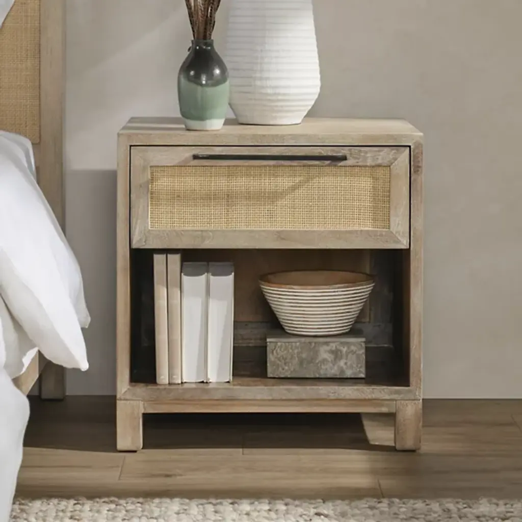 The Jensen Nightstand from Classic Home incorporates traditional cane weaving into its drawer front, bringing artisanal detail to bedside storage. The mango wood frame provides lasting sturdiness, while adjustable levelers ensure stability on uneven floors. An open compartment below offers quick access to frequently used items. The single drawer keeps personal items organized and out of sight. This nightstand merges useful storage with handcrafted details. Its balanced proportions work well in both compact and spacious bedrooms.