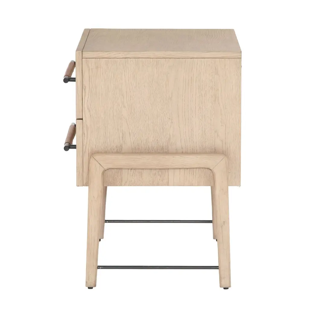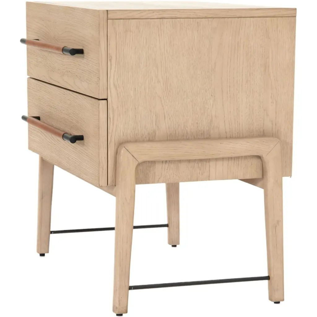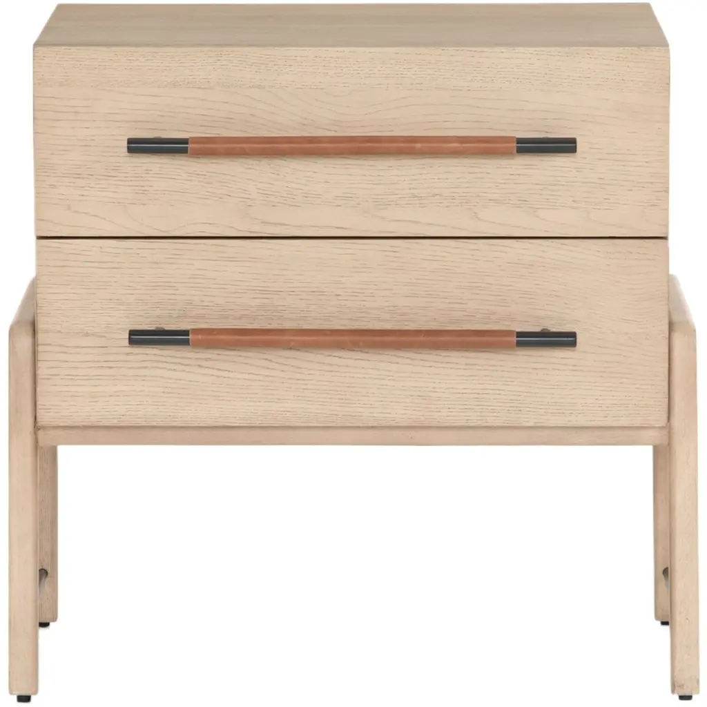The Jeremiah Nightstand presents a refined silhouette, crafted from oak with dual drawers that offer ample storage. Each drawer is adorned with iron hardware, elegantly wrapped in top-grain leather, adding a touch of sophistication to its design. This nightstand seamlessly blends functionality with style, making it a perfect addition to any bedroom setting.