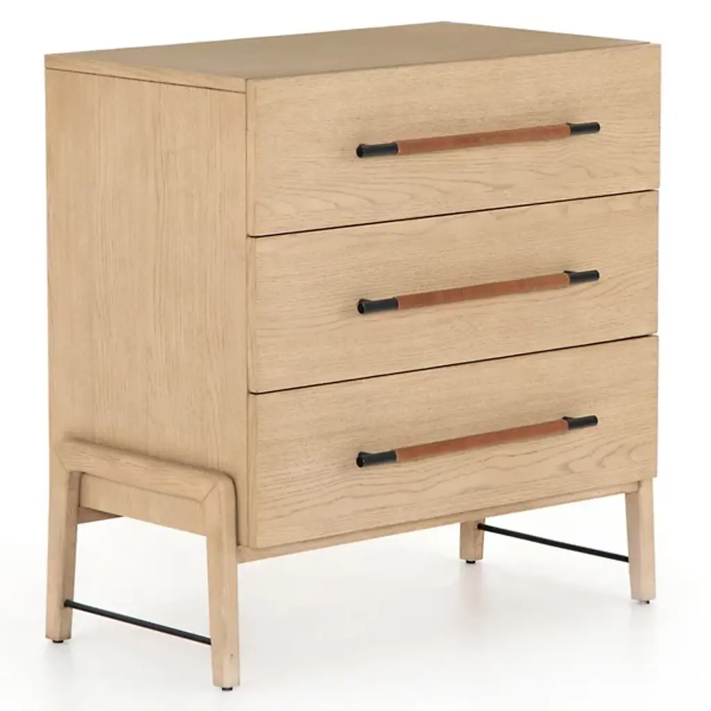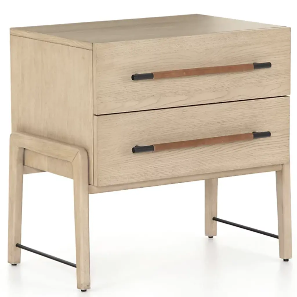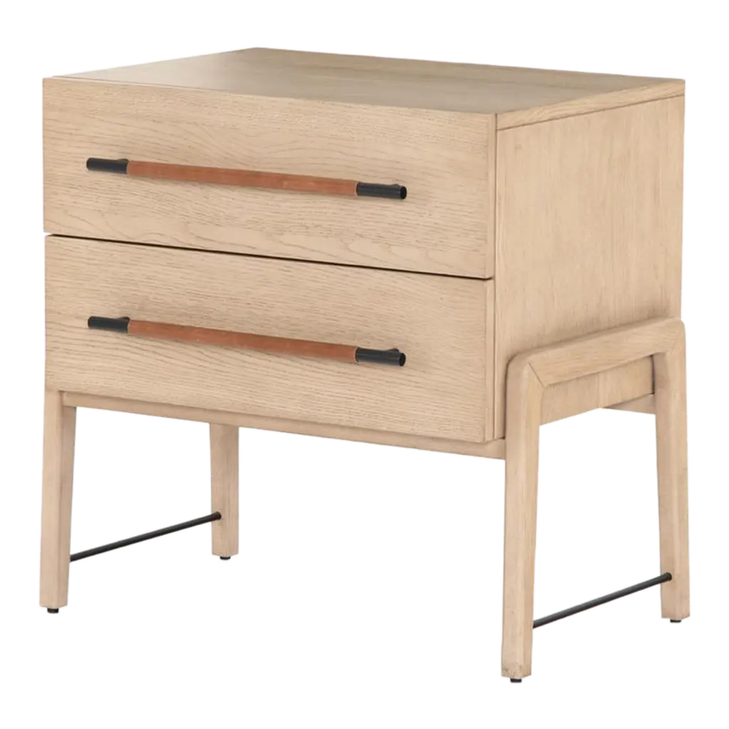 The Jeremiah Nightstand presents a refined silhouette, crafted from oak with dual drawers that offer ample storage. Each drawer is adorned with iron hardware, elegantly wrapped in top-grain leather, adding a touch of sophistication to its design. This nightstand seamlessly blends functionality with style, making it a perfect addition to any bedroom setting.