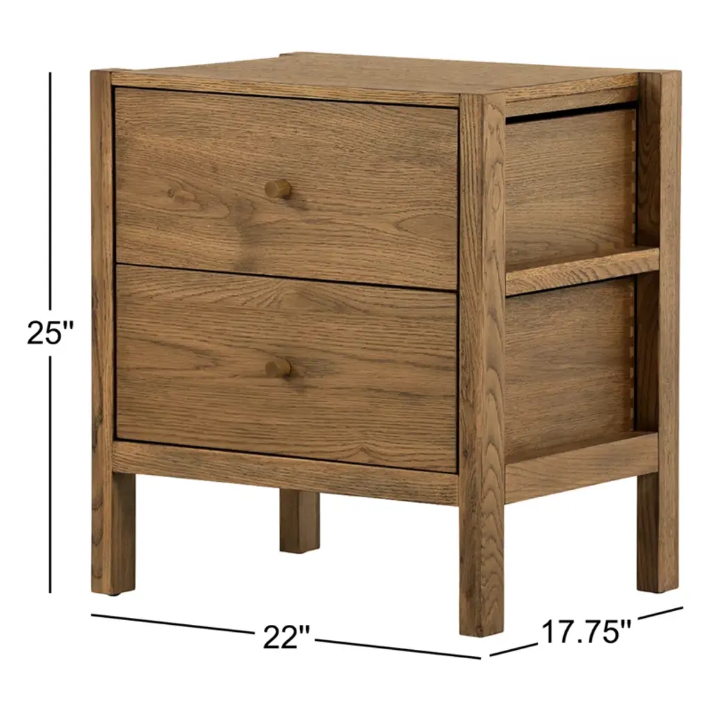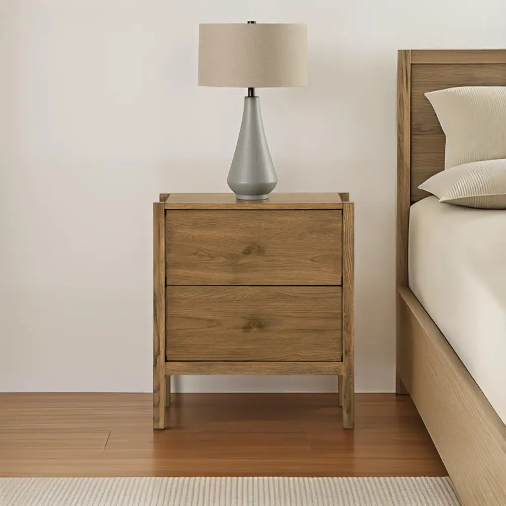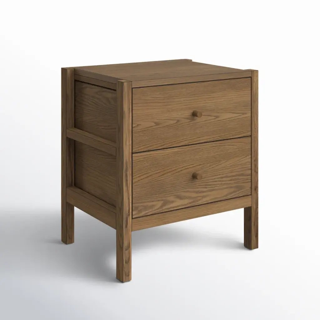 This mid-century inspired two-drawer nightstand is the perfect blend of form and function for your bedroom. Handcrafted with warm finish that highlights the natural beauty of the wood. The exposed framework and minimalist design provide a touch of sophistication to your space. With two spacious drawers, it offers ample storage for your bedside essentials, while the wooden handles add a subtle touch of elegance. Enjoy this timeless piece that seamlessly complements your home's decor.