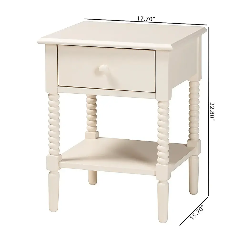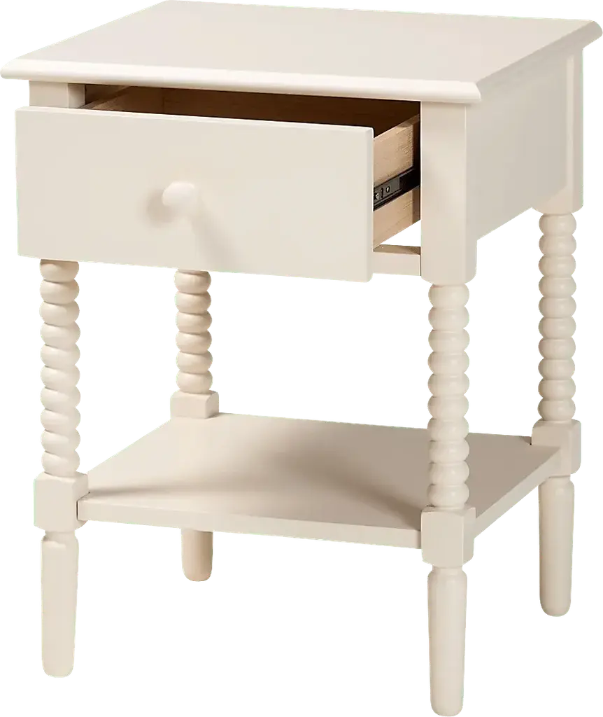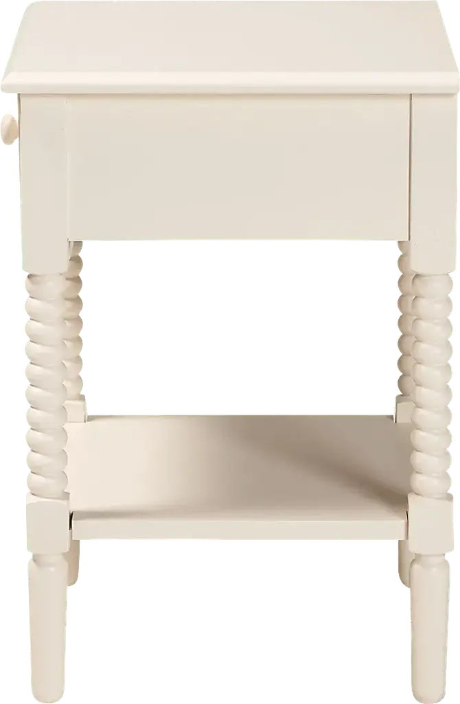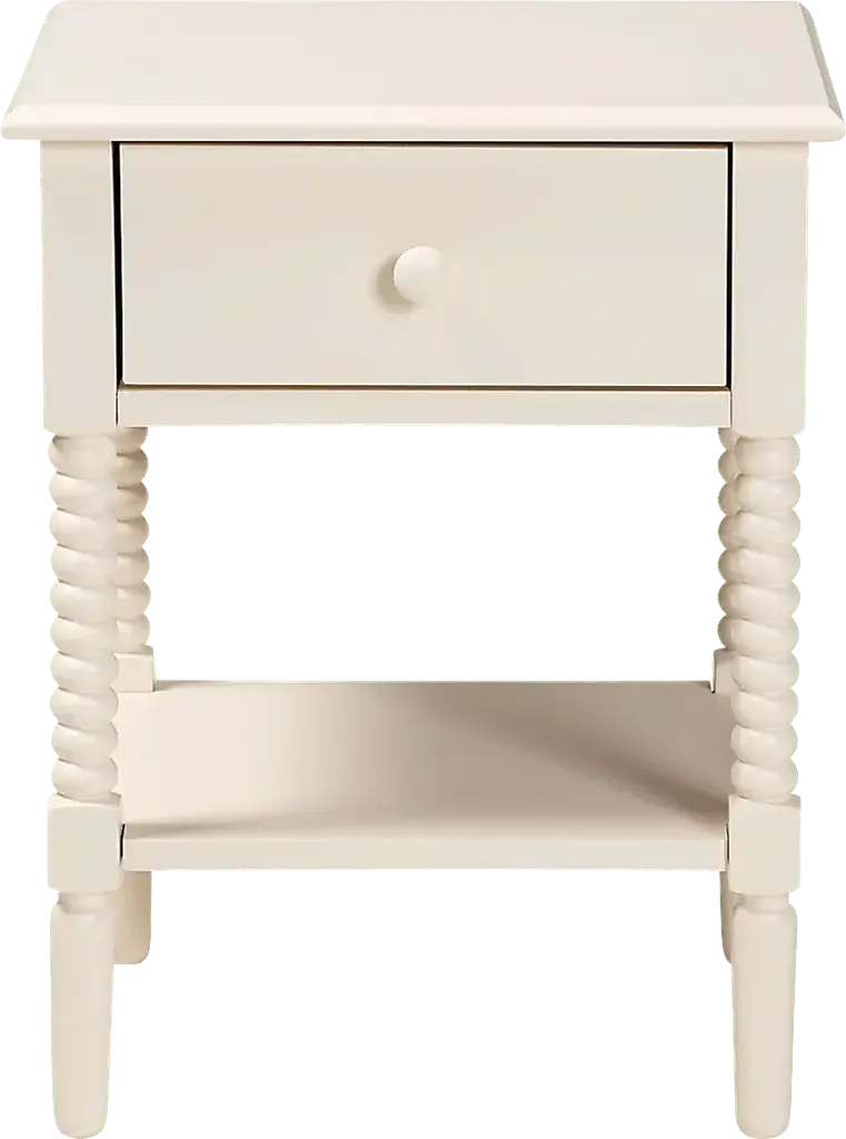 Enduring beauty is steeped within the intricate details of the stunning Jetexe ivory nightstand. This inspired farmhouse piece is crafted from sturdy wood. The drawer and open shelf offer space to organize bedside essentials, while reserving the tabletop for nightly use. The Jetexe features spindle legs for captivating visual allure rich with traditional charm. The round drawer knob accentuates the flowing design of the piece, making the Jetexe a blissful bedroom accessory. Customer assembly is required.