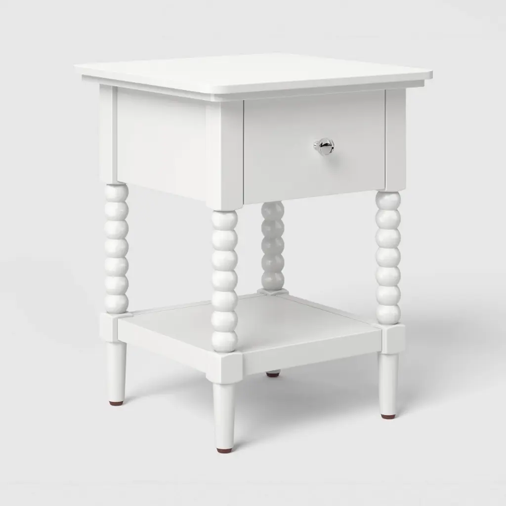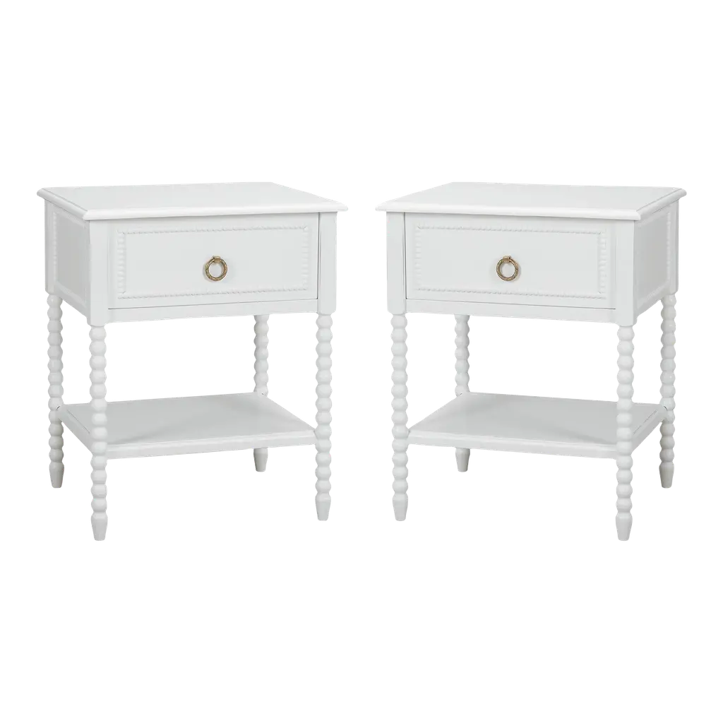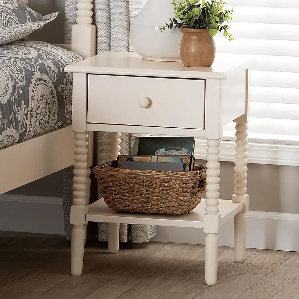 Enduring beauty is steeped within the intricate details of the stunning Jetexe ivory nightstand. This inspired farmhouse piece is crafted from sturdy wood. The drawer and open shelf offer space to organize bedside essentials, while reserving the tabletop for nightly use. The Jetexe features spindle legs for captivating visual allure rich with traditional charm. The round drawer knob accentuates the flowing design of the piece, making the Jetexe a blissful bedroom accessory. Customer assembly is required.