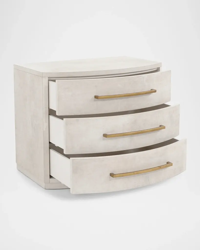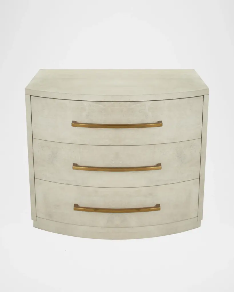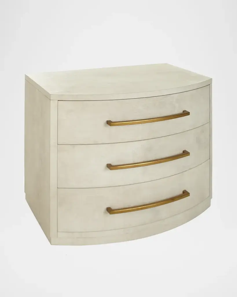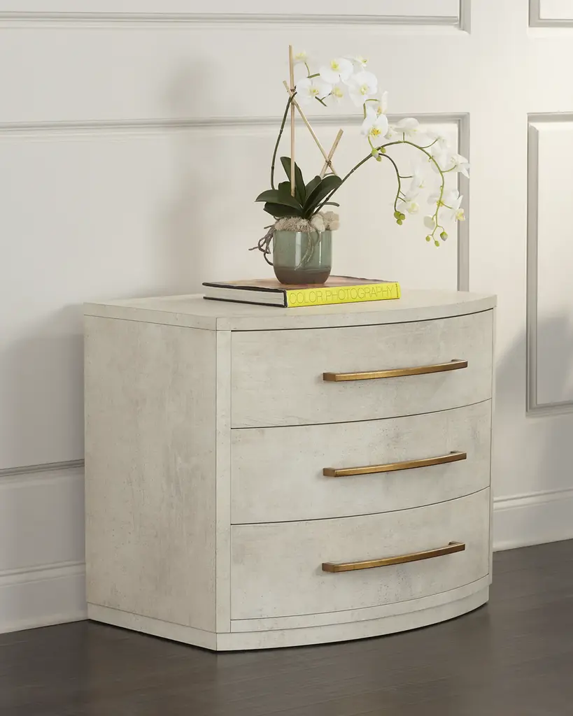 This three-drawer nightstand with an elegant, curved front is finished in tiza gesso. It features soft-closing drawers with elongated, curved handles in antique gold. Handcrafted night stand. Beech solids/wood composite. Steel hardware. Overall, 33.3"W x 22"D x 28"T. Drawers, 29.5"W x 15.5"D x 5.5"T. For indoor use only. Imported. Boxed weight, approximately 203 lbs. Shipping Direct from Vendor, usually ships within 30 business days. About the John-Richard Collection Founded in 1980 in Greenwood, Mississippi, the John-Richard Collection is known for a strong design staff that travels the world for inspiration. Channeling cultural and historical influences, the company creates distinctive artisan-crafted furniture, lighting, wall art, mirrors, and decorative accessories that make a lasting impression. What's more, an eye for future trends in luxury home furnishing sets the John-Richard Collection apart. They skillfully blend the best of what is new in home fashion with the great designs of the past, resulting in updated designs that fit perfectly with an array of styles.