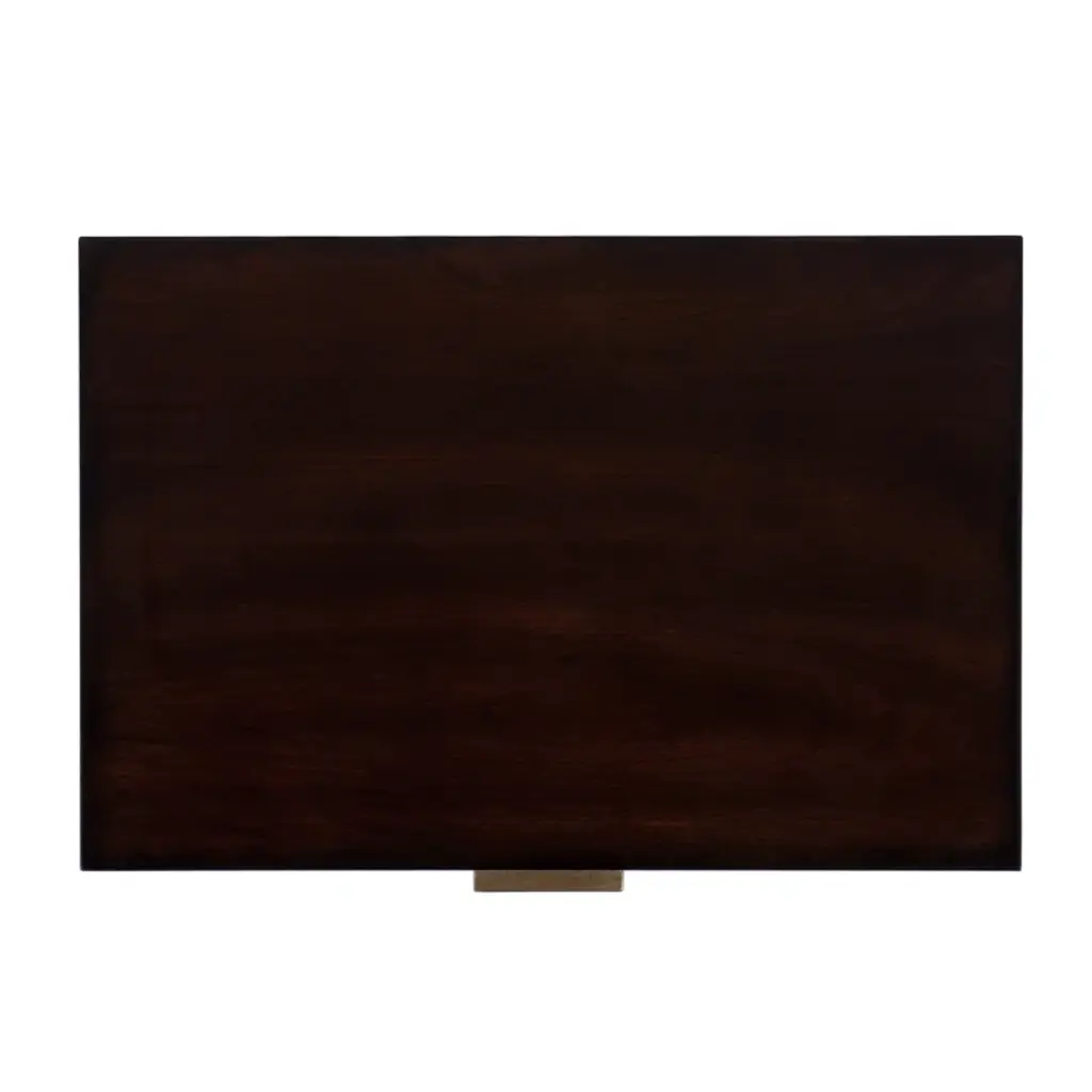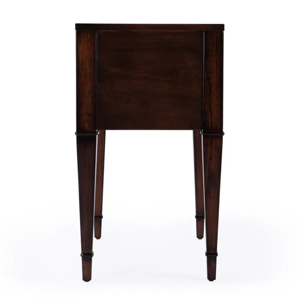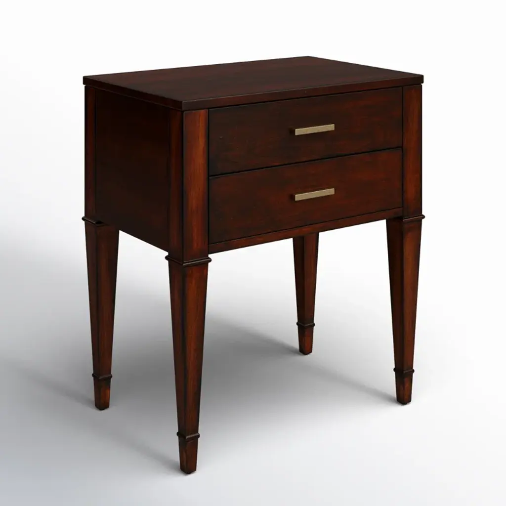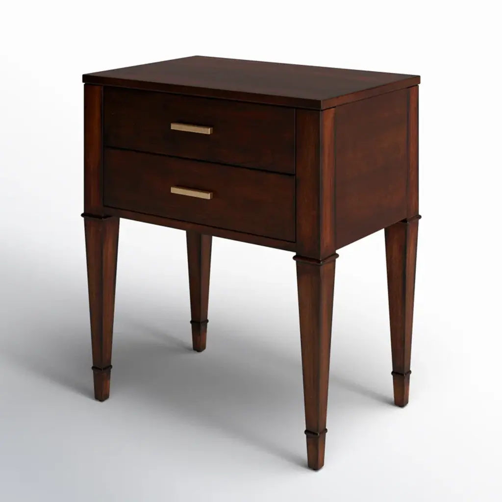 With gorgeous square tapered legs, this mid-century style design has an added modern flair with its gold hardware and its luxurious brown finish. Features 2 spacious drawers for storage perfect for all your essentials.