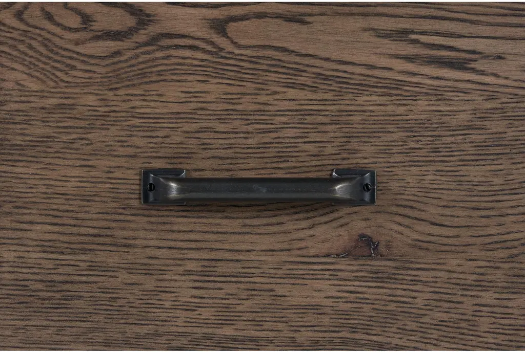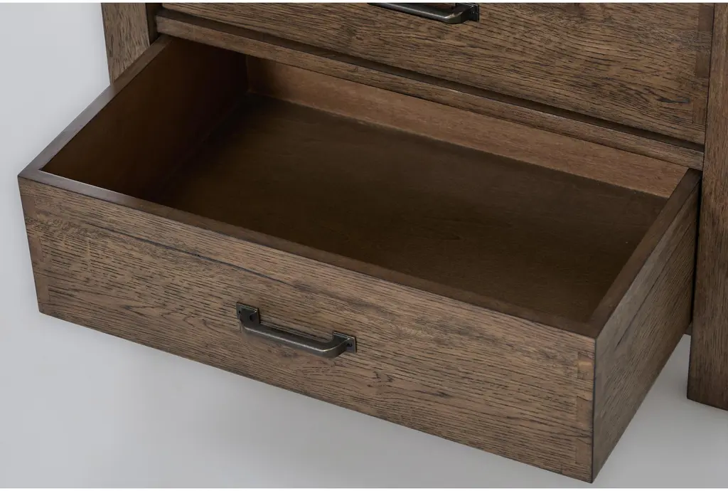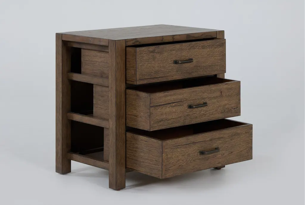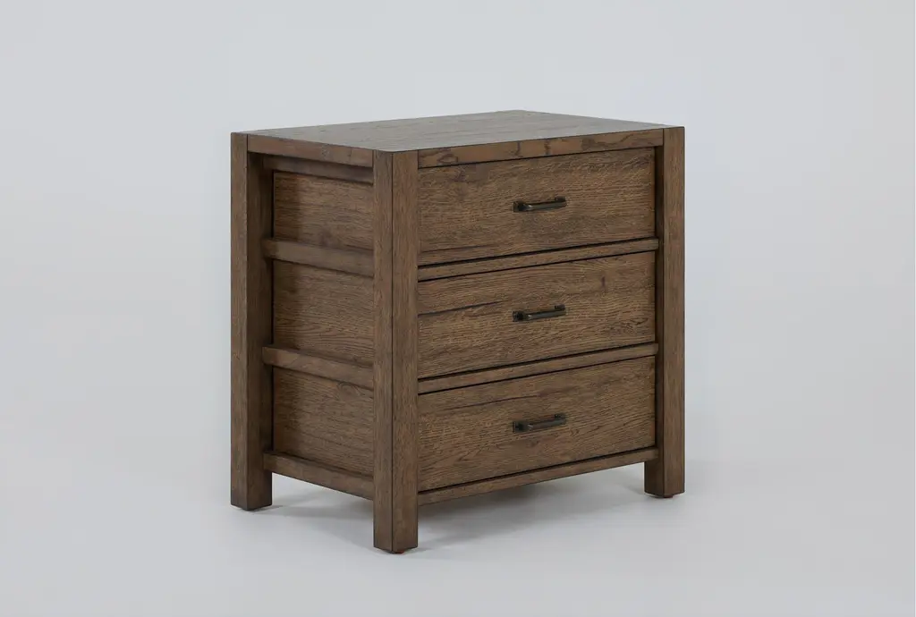 Designed and developed by Living Spaces to evoke a sense of craft and history, our Kai 3-drawer nightstand brings a handmade American-inspired aesthetic to your space. In addition to solid hardwood, this piece features knotty oak veneer with imperfections and characteristics that show the wood's natural beauty and wear for an authentic rustic look. Simple yet thoughtful, the design is made to intentionally reveal its construction. Drawers with no side panels, exposed joints and antiqued hardware all contribute to its unique charm. You'll find USB charging and felt lining in select drawers to help protect your items.