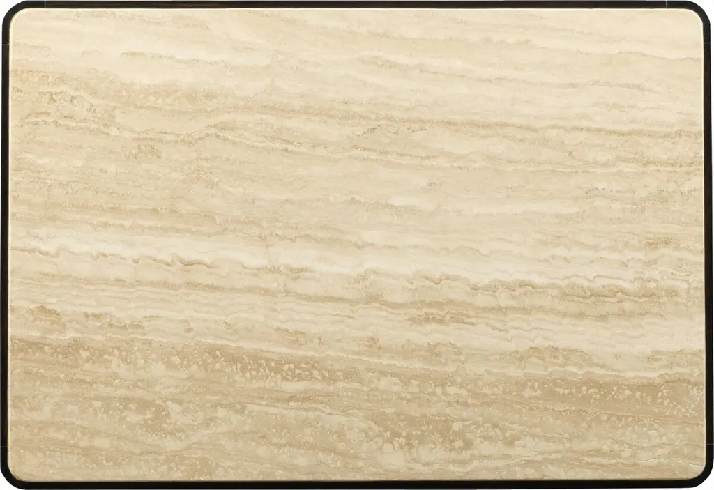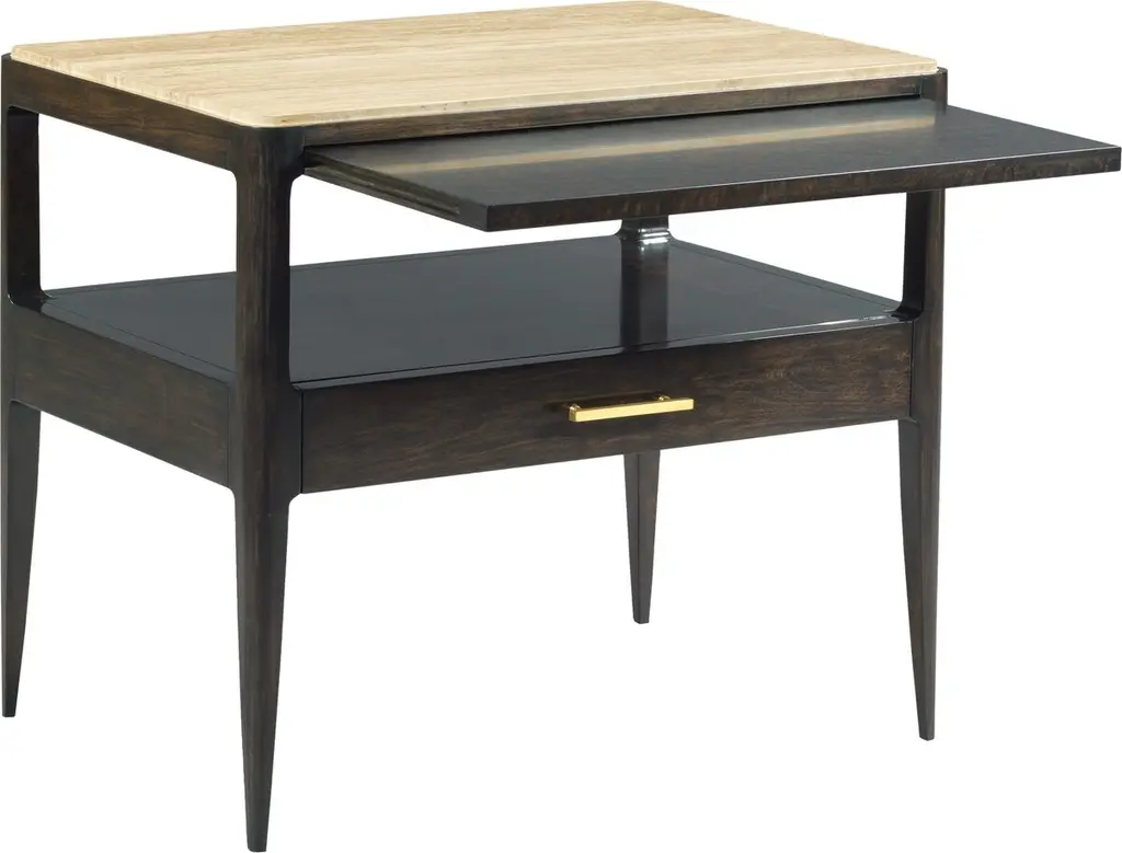 This side table will bring timeless elegance to a living room, a bedroom, or any other space. The travertine top provides a tonal and textural contrast to the dark wood. Below the top is a pullout shelf; there's also a drawer so that you can stash items within reach but out of sight.