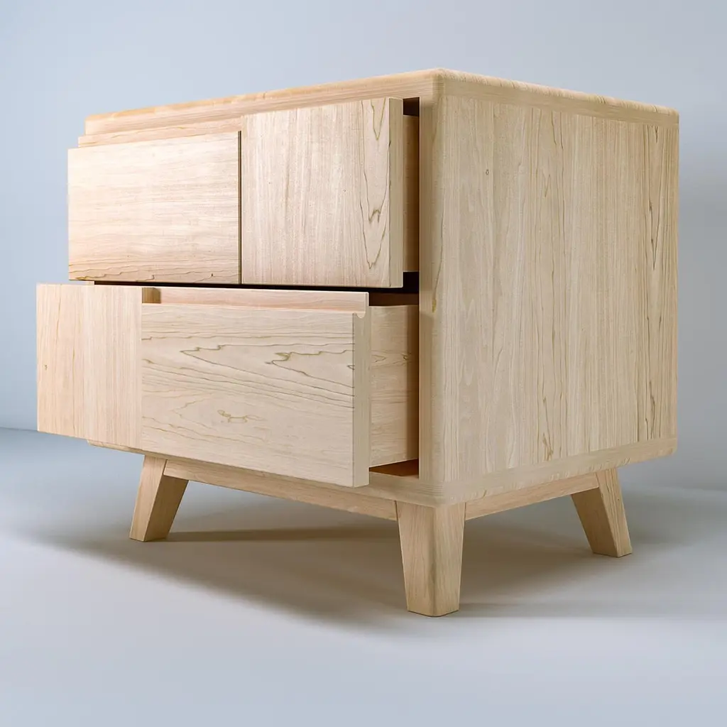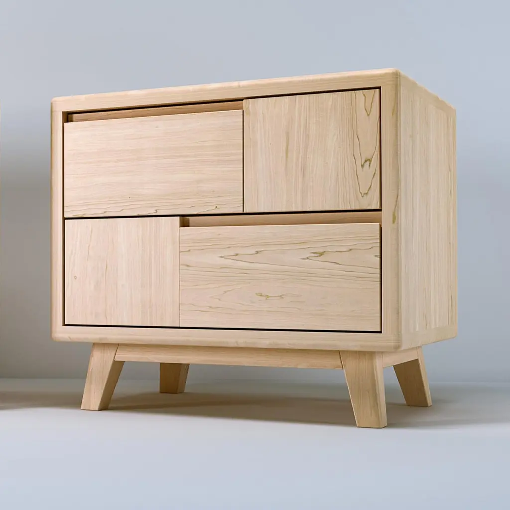 A Scandinavian-style design of dramatic appeal, this bedside table creates the perfect stage for a luxurious lamp with its simple yet visually captivating silhouette. Handcrafted of solid maple, the frame with rounded edges encloses two self-closing drawers with solid beech interior and geometric front panels featuring strategically placed grooves for opening. Finished with a clear water-based coating, a beeswax polish is applied by hand to create a matte satin effect. Fully customizable in different sizes, essences and finishes, please contact the Concierge for details.