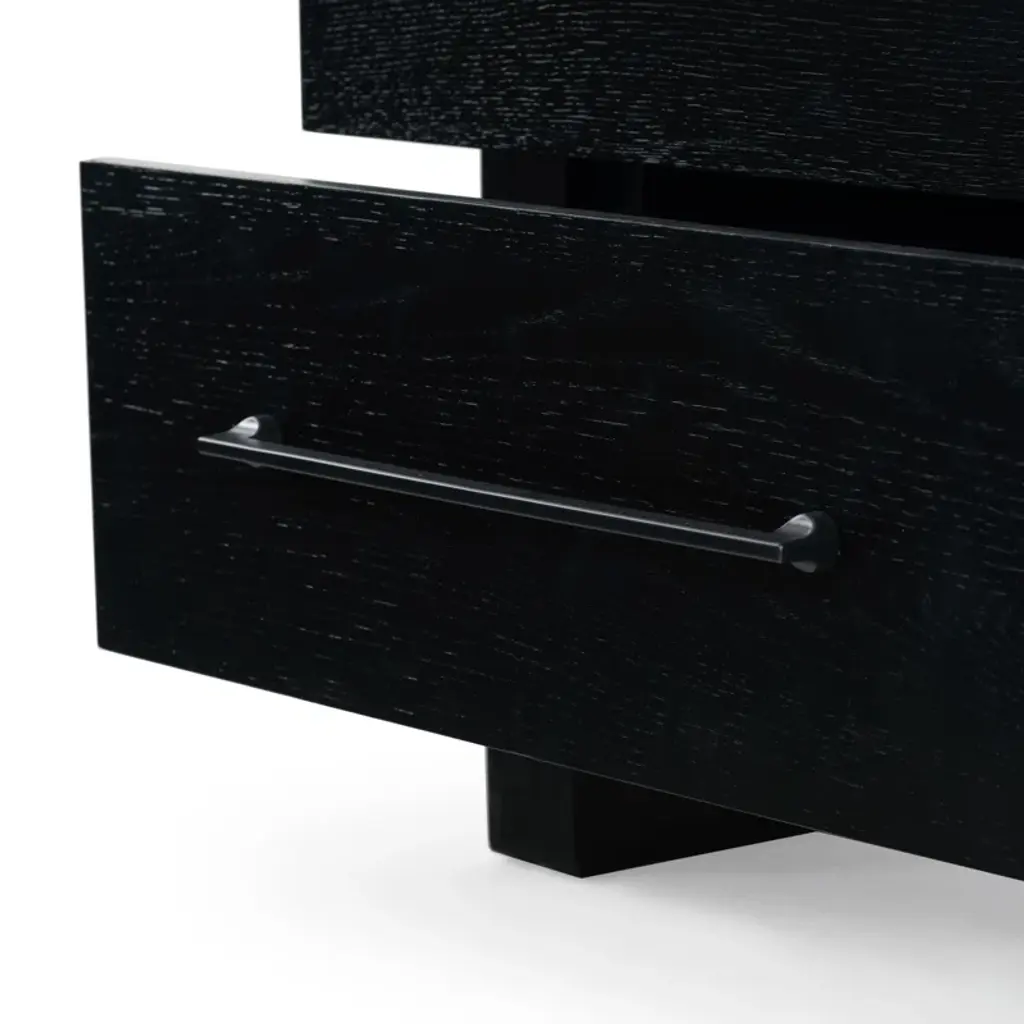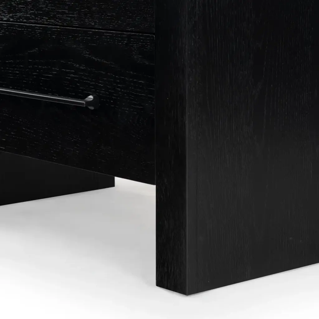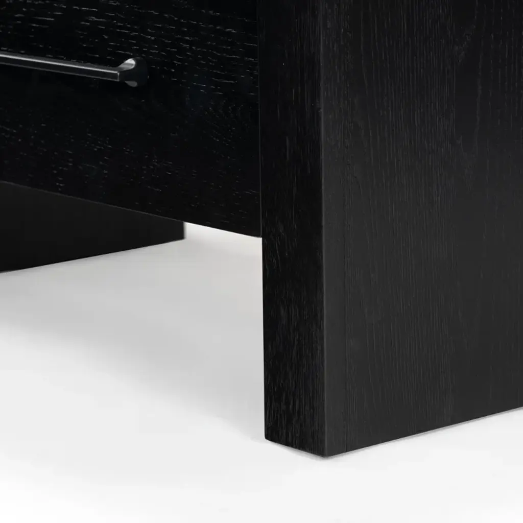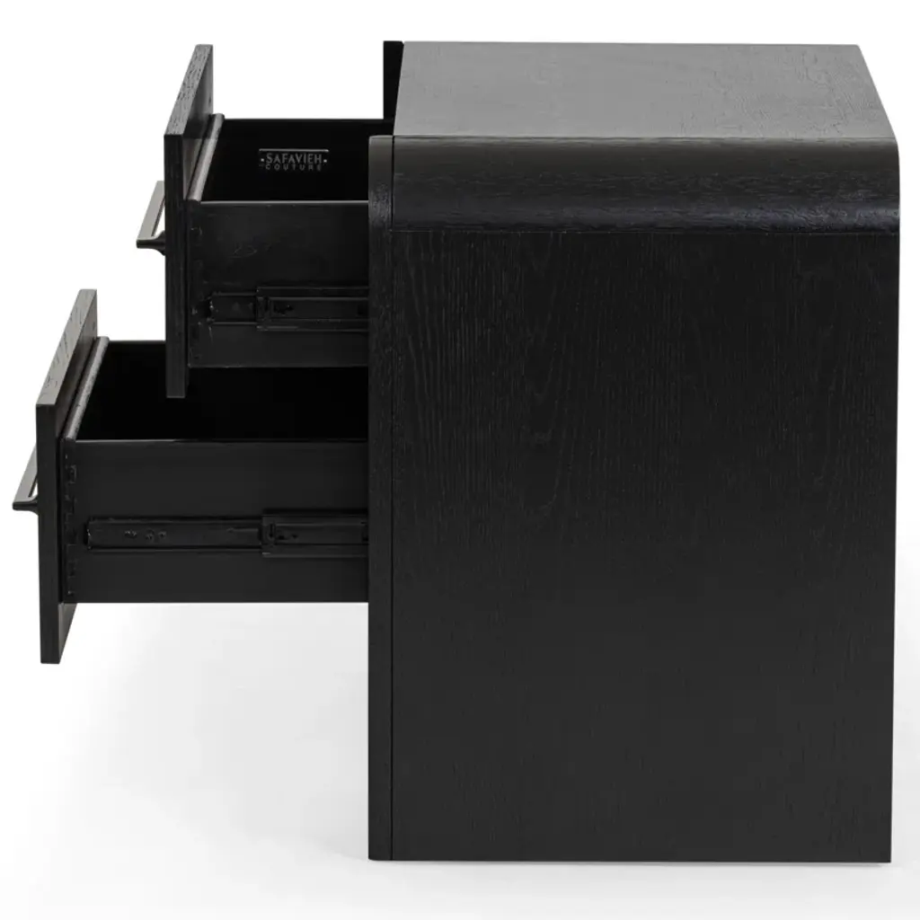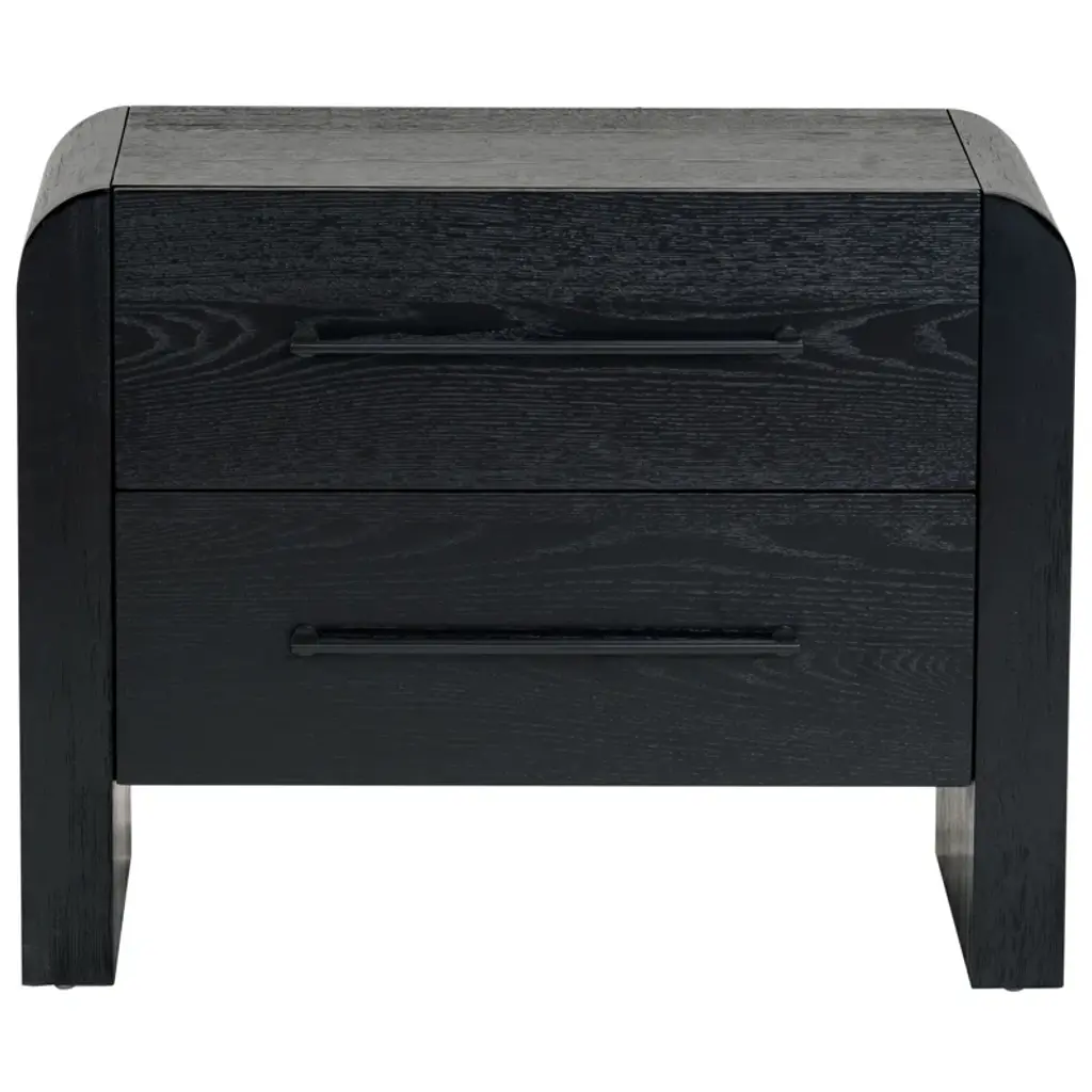 Introducing the striking Katrina Wood 2-Drawer Nightstand, meticulously crafted to add an elegant touch to your bedroom decor. This masterpiece is artfully designed in a sophisticate classic black hue, promising to stand out in any room setting, while still offering a serene ambiance. Posing an impressive built using solid rubber wood, the nightstand promises unparalleled resilience without compromising on aesthetics. The notable detail of Oak veneer provides an added depth and dimension that is sure to captivate onlookers. Opening up to two spacious drawers, this piece offers ample storage for all your bedside essentials while keeping clutter at bay. The nightstand also boasts zinc metal elements that add subtle glitz and further enrich its overall design. Grace your living space with the Katrina Wood 2-Drawer Nightstand - a fusion of style, function, and durability, which pays homage to contemporary design while still keeping an aura of timelessness. Get ready to redefine your living space with a piece that isn't just a showstopper, but a true game-changer!