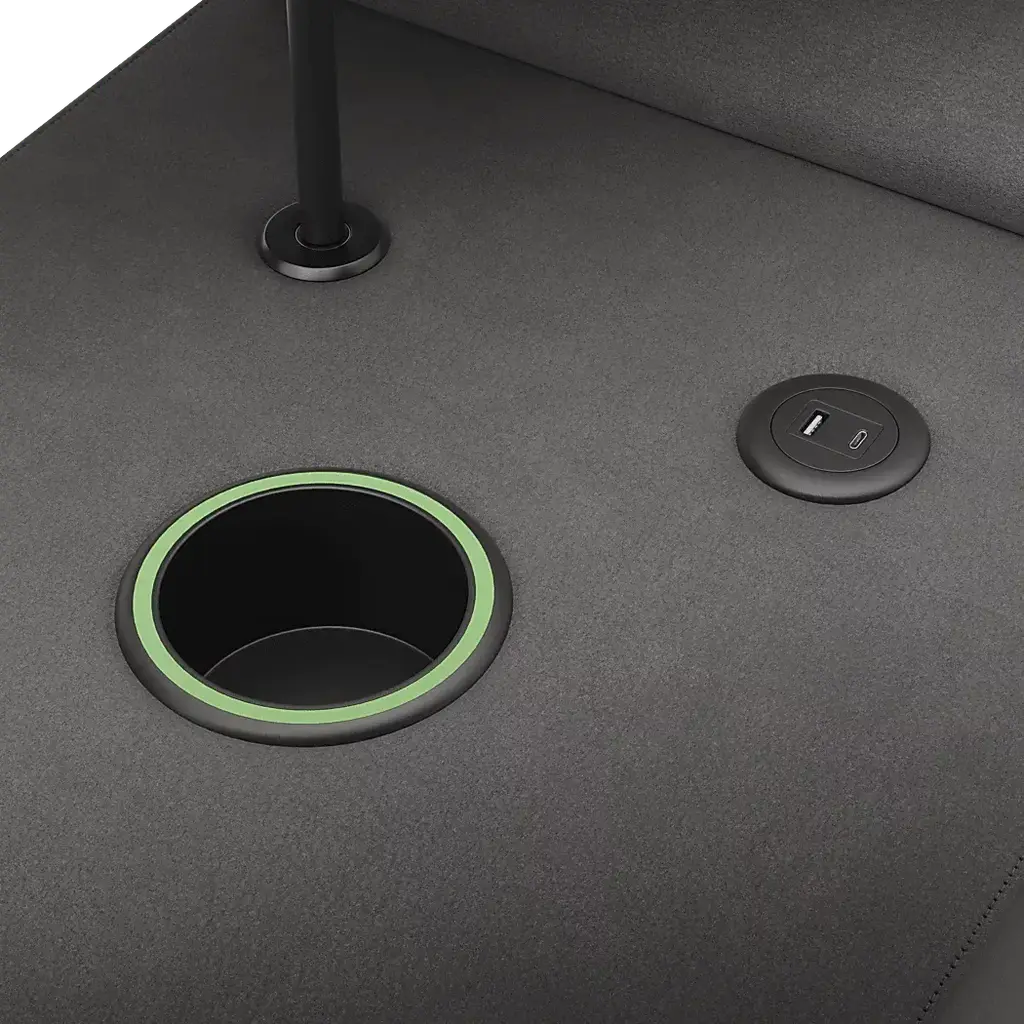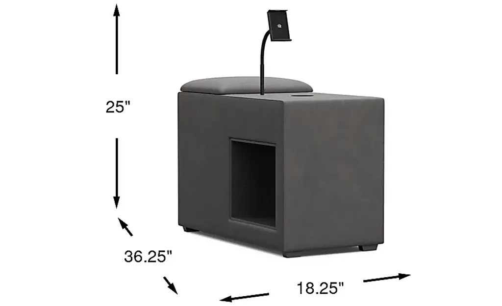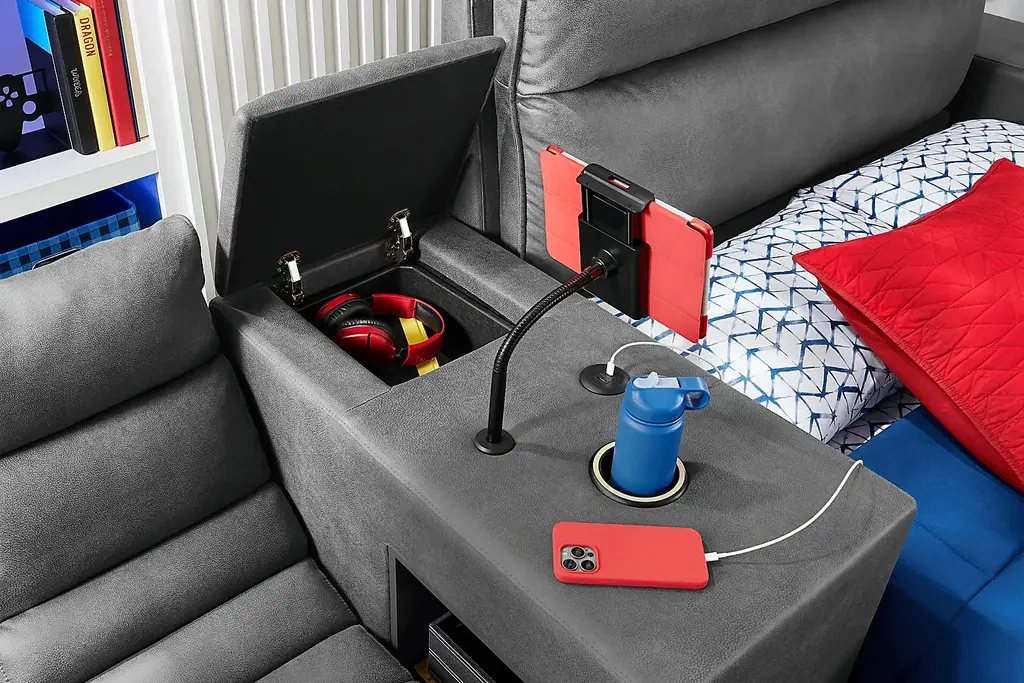 Your forecast calls for a 100% chance of style and super smart bedside storage when you bring the Cloud9 collection home. Perfect for older kids, teens and young adults, the piece's sleek silhouette is complemented by padded panels wrapped in plush suede-soft charcoal colored microfiber upholstery. More than just good looking, the nightstand's top surface is loaded with built-in amenities like an adjustable phone holder with wireless charging, dual USB charging port and glow in the dark cup holder. The lift-top panel opens to reveal hidden storage, perfect for cords, electronics or whatever else your kids can fit inside. However, the multitude of multiuse features wouldn't complete without the open side cubby's extra space for books, journals or grab-and-go essentials, making this nightstand a true multitasker for modern life. Upholstery: 100% Polyester