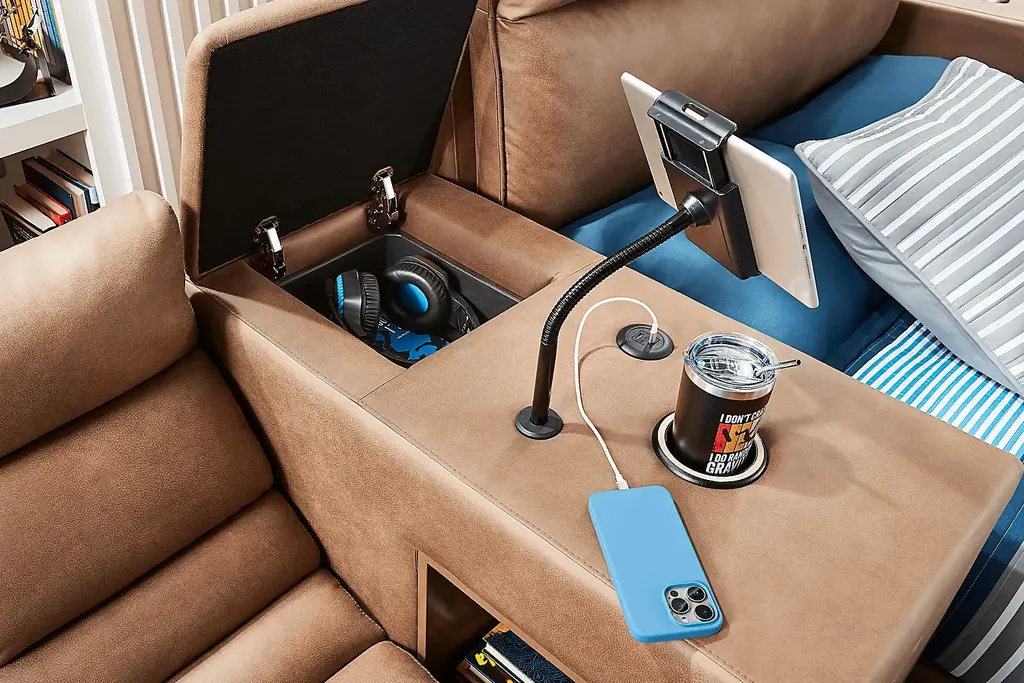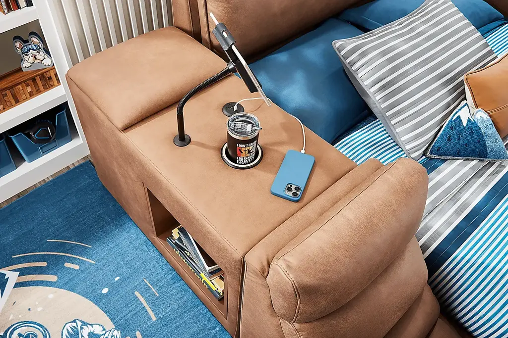 Your forecast calls for a 100% chance of style and super smart bedside storage when you bring the Cloud9 collection home. Perfect for older kids, teens and young adults, the piece's sleek silhouette is complemented by padded panels wrapped in plush suede-soft saddle colored microfiber upholstery. More than just good looking, the nightstand's top surface is loaded with built-in amenities like an adjustable phone holder with wireless charging, dual USB charging port and glow in the dark cup holder. The lift-top panel opens to reveal hidden storage, perfect for cords, electronics or whatever else your kids can fit inside. However, the multitude of multiuse features wouldn't complete without the open side cubby's extra space for books, journals or grab-and-go essentials, making this nightstand a true multitasker for modern life. Upholstery: 100% Polyester