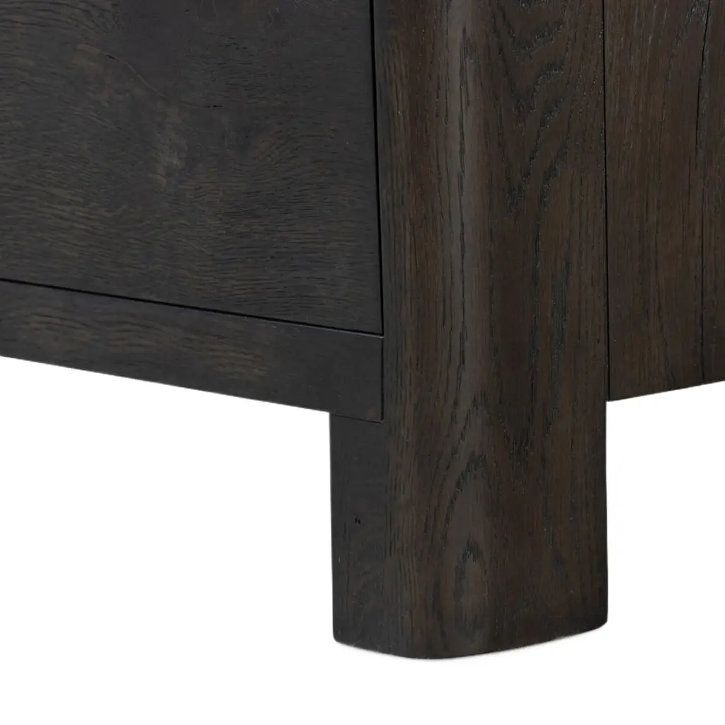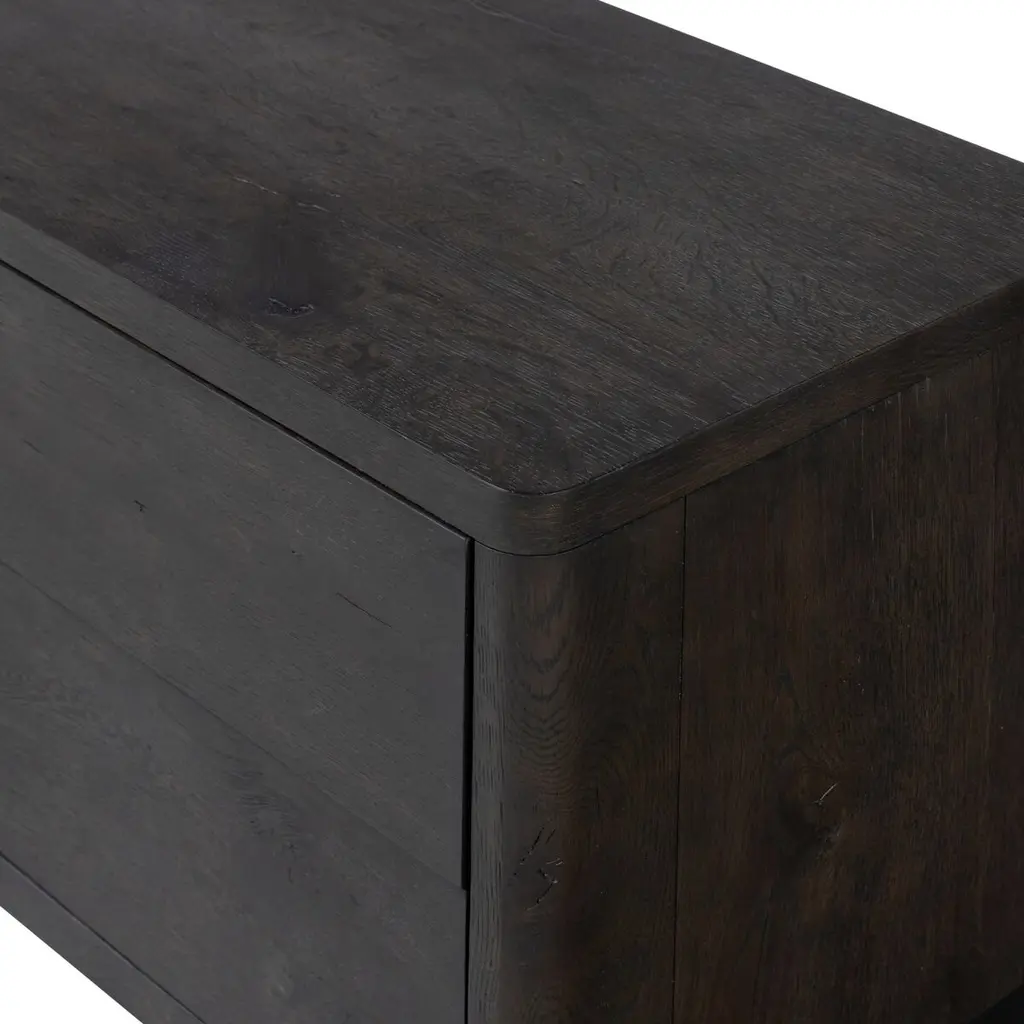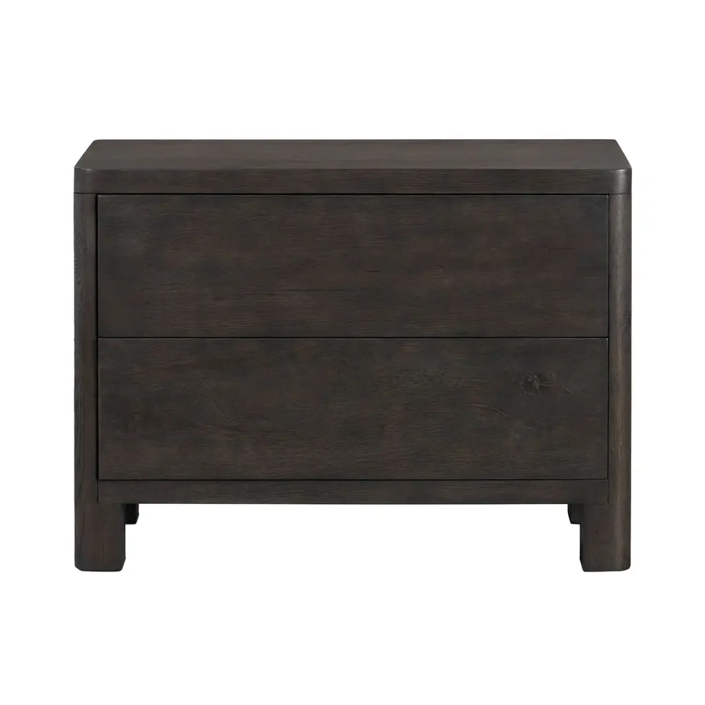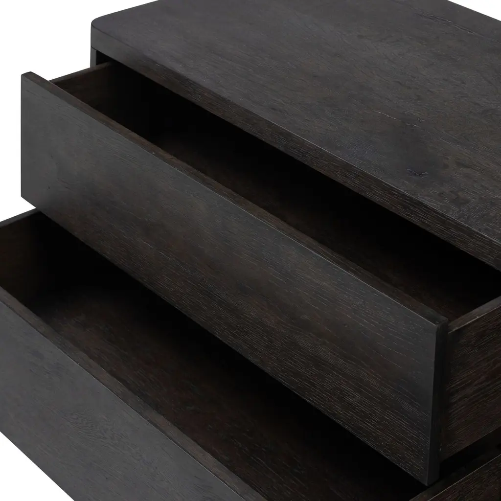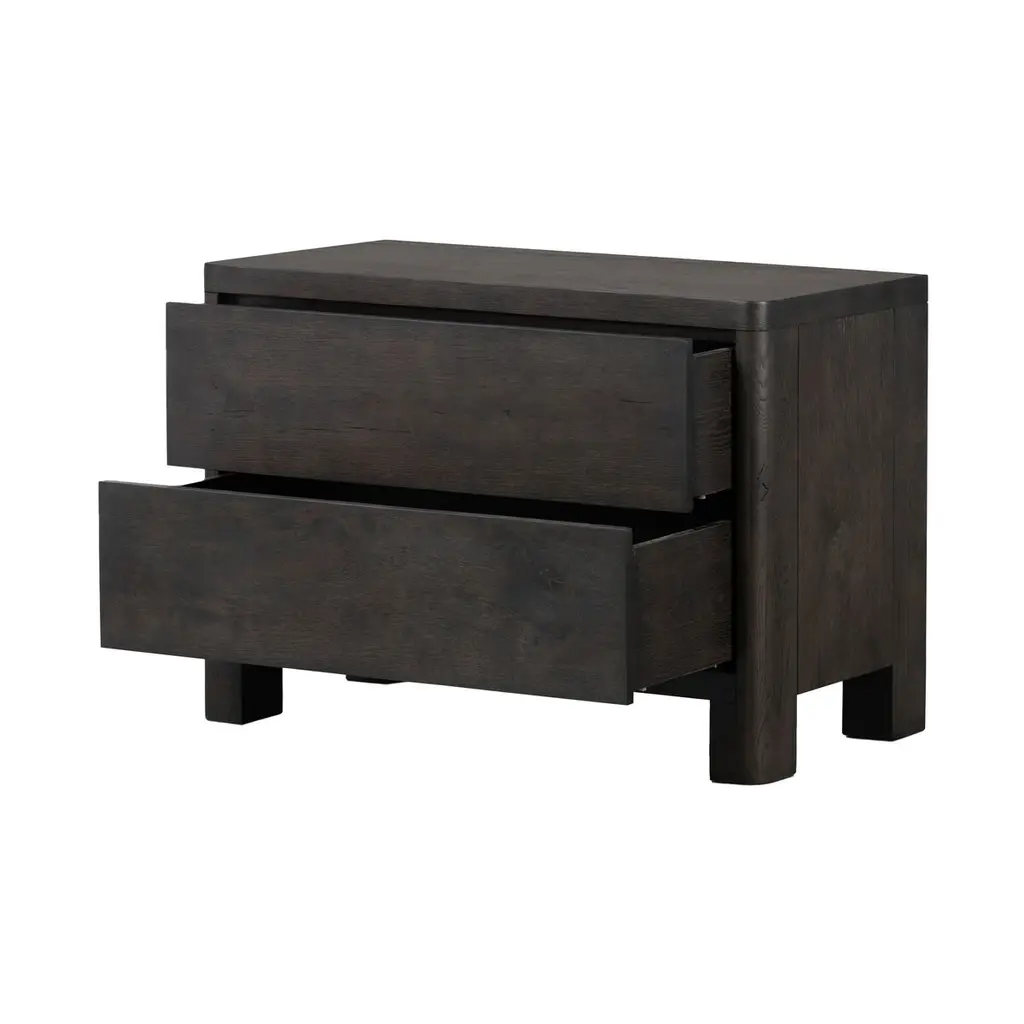 Topped with a thick plank of solid oak, this extra-wide nightstand blends modern lines and warm character with two roomy drawers, slightly curved corners, and solid square legs. Seamless drawer fronts have a push-latch mechanism, offering a sleek and functional design. Crafted with precision, this nightstand combines the durability of solid oak and veneer to create a timeless piece for any bedroom.