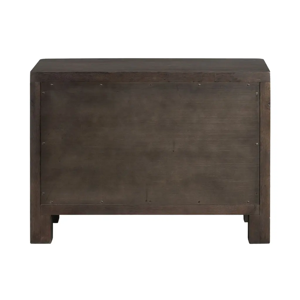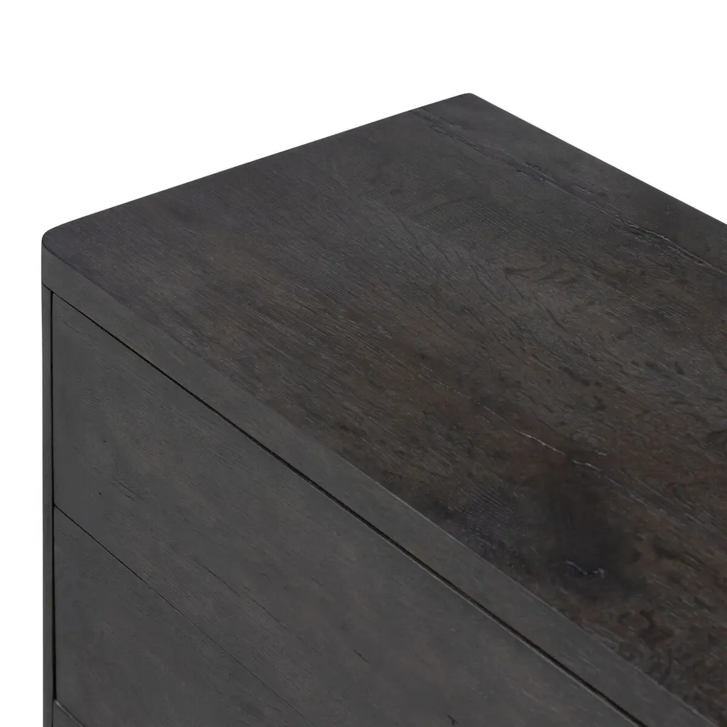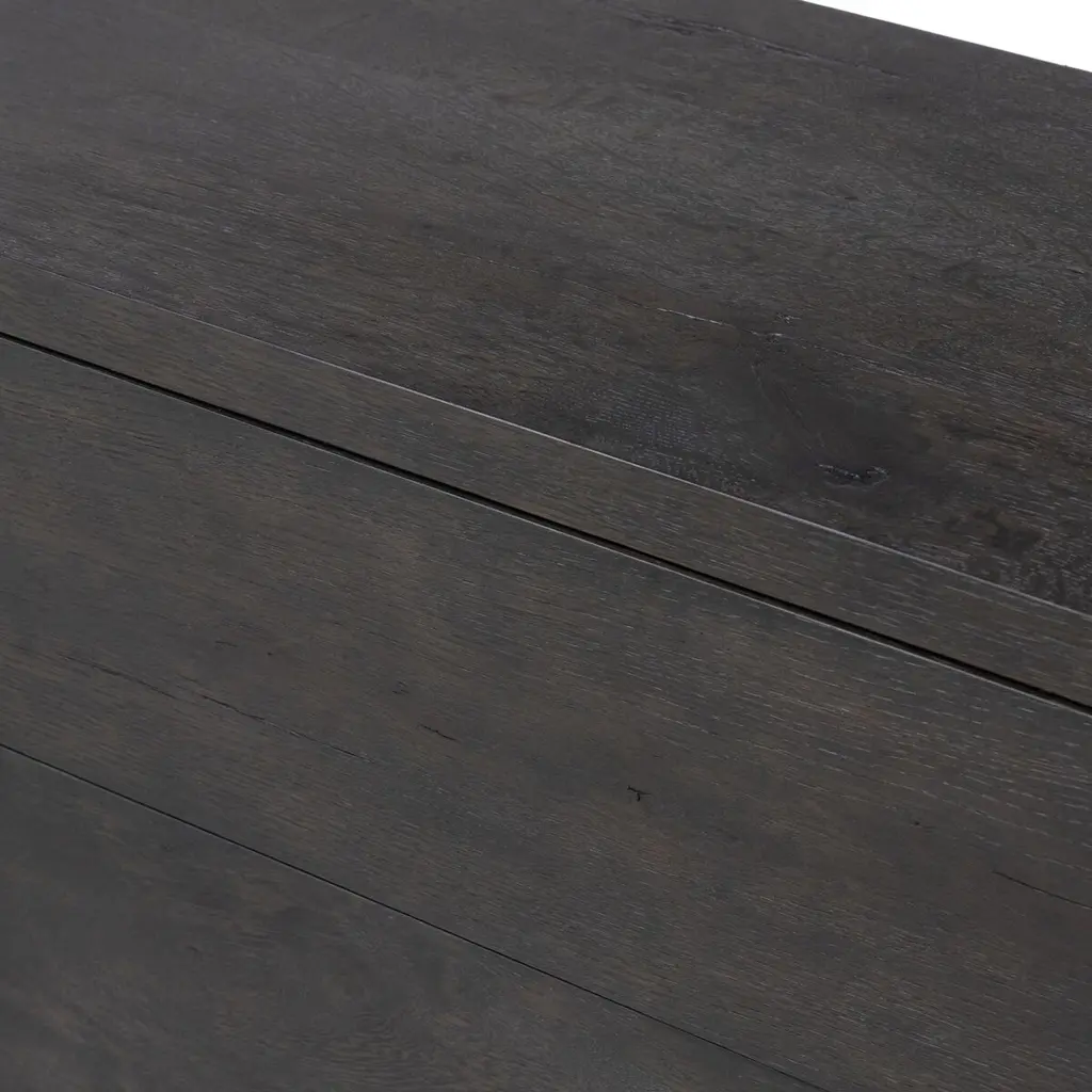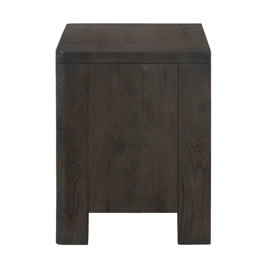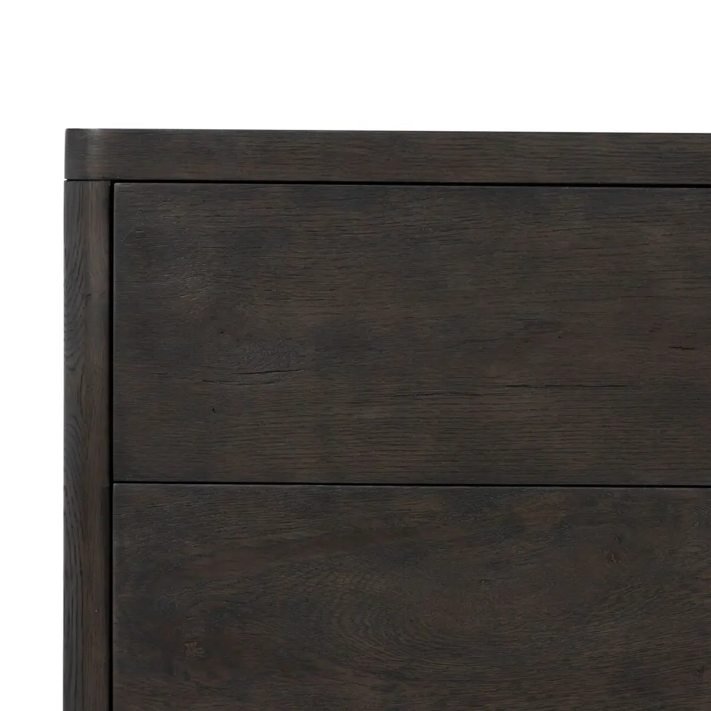 Topped with a thick plank of solid oak, this extra-wide nightstand blends modern lines and warm character with two roomy drawers, slightly curved corners, and solid square legs. Seamless drawer fronts have a push-latch mechanism, offering a sleek and functional design. Crafted with precision, this nightstand combines the durability of solid oak and veneer to create a timeless piece for any bedroom.