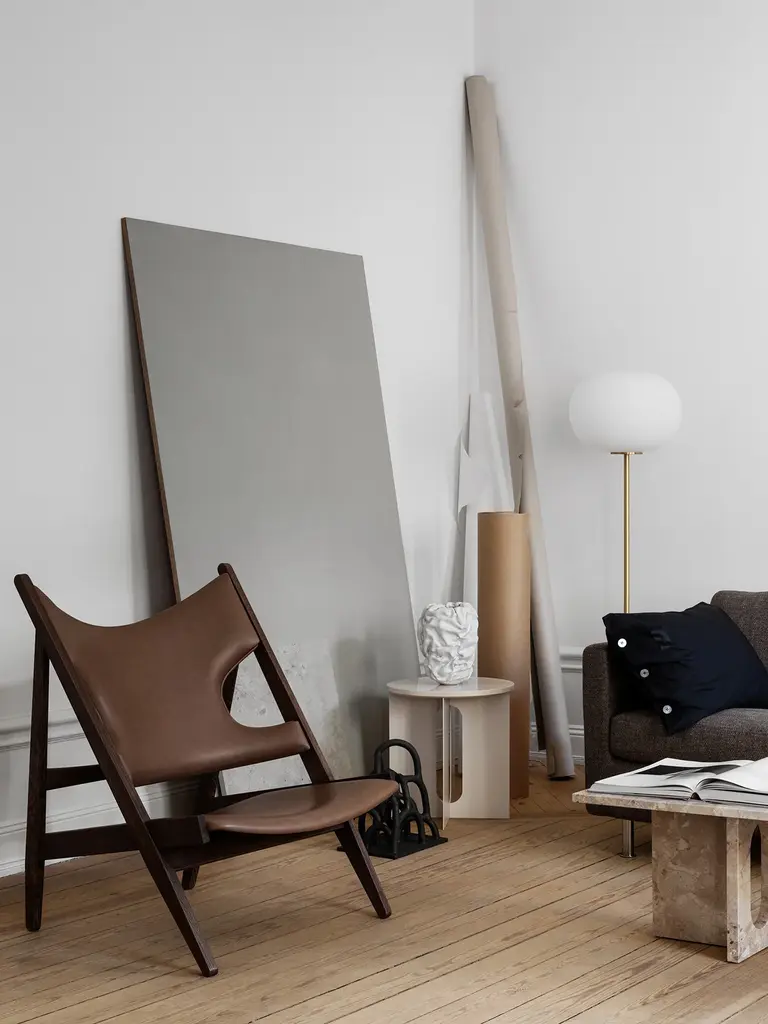Defined by an exposed, triangular construction, a gently curved seat and back ideally pitched for relaxation, and distinctive cut-outs for resting the elbows when reading (or, of course, knitting), the Knitting Chair affirmed Kofod-Larsen’s reputation as a master of proportion and unexpected, sculptural form. It was put into production, but only as a limited edition. Since then, the elegant, inventive design has become an increasingly valuable and sought-after collector’s item. The Knitting Chair is beautiful from every angle, making it easy to place anywhere in a room. Given the chair’s enveloping comfort, it has a relatively small footprint, which makes it an easy fit in compact interiors as well as in more spacious ones. The design also stands out on comfort, the result of Kofod-Larsen’s constant care to ensure ideal angles and lumbar support. The clean, sculptural lines, achieved through the designer’s close work with joiners, and the high-end, natural materials make for an unforgettable, conversation-sparking silhouette. The Knitting Chair is useful for everything from small restaurant spaces and bedsides to exhibition spaces. The shine of the honed marble surface against the matte steel results in a versatile visual identity that is both modernist and industrial.