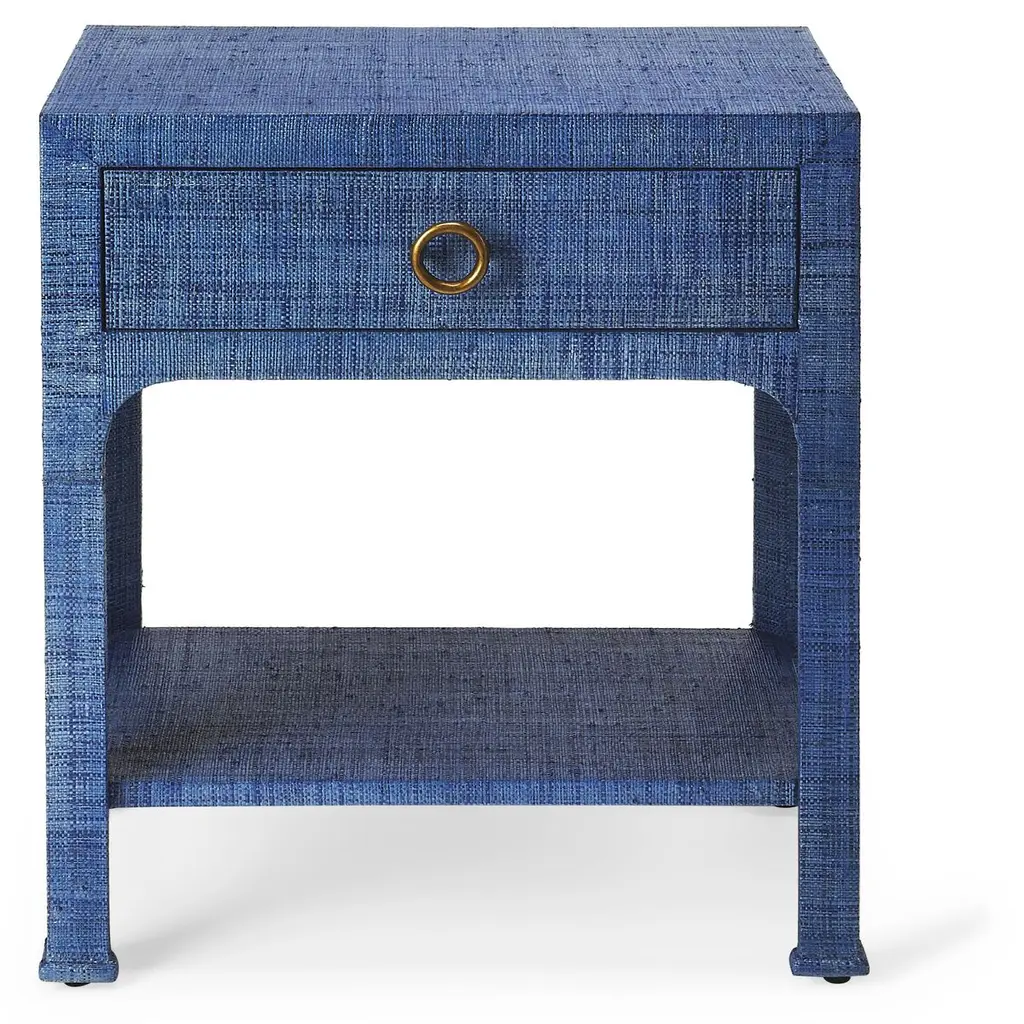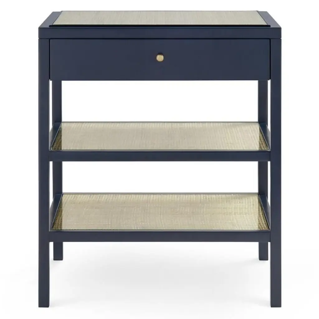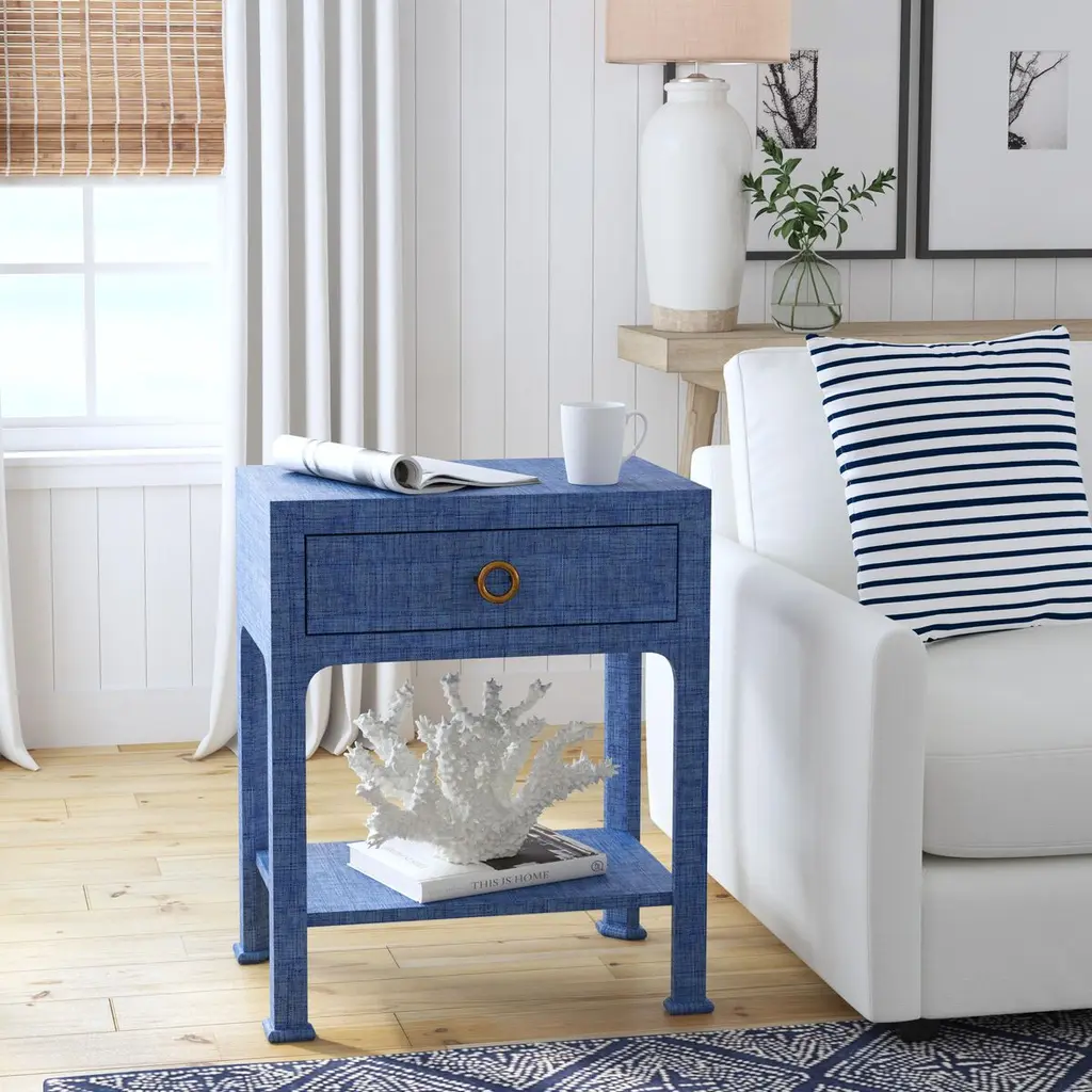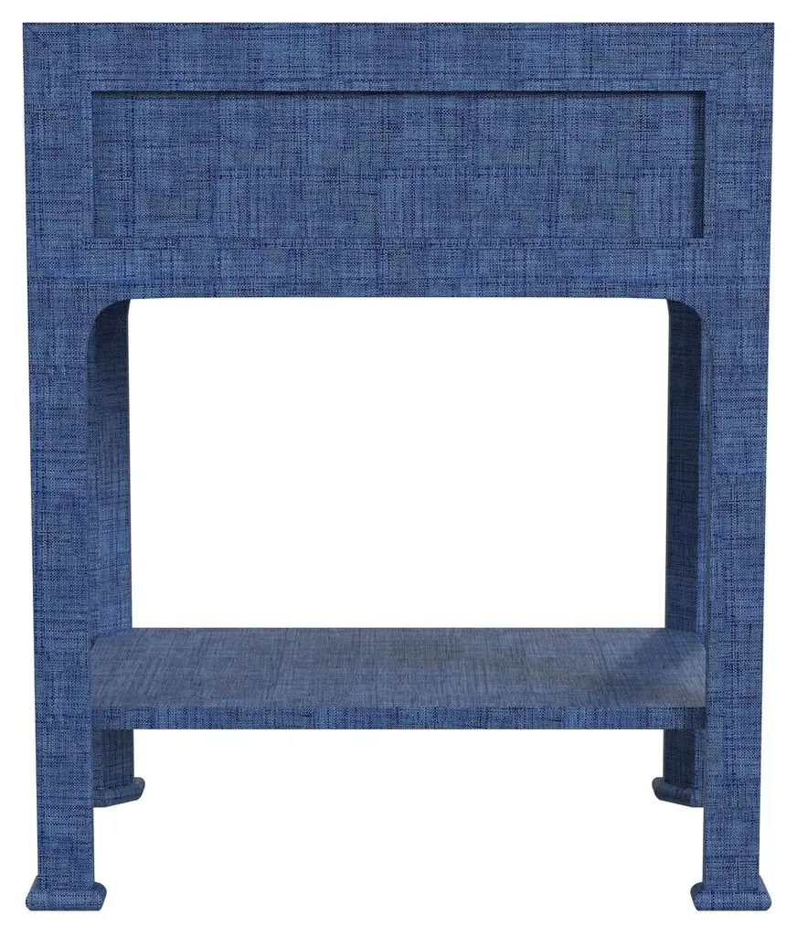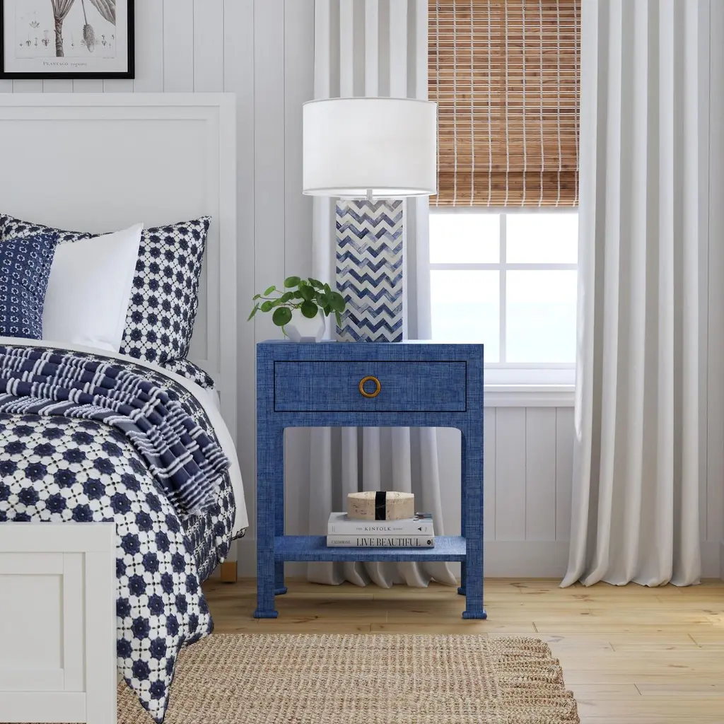 Designed by us and available only at One Kings Lane: This nightstand is finished in a layer of woven raffia. Detailed with a sliding drawer, 16 inches of surface depth, and an open lower shelf, it offers plenty of room for bedside storage. A single brass drawer pull ties the look together.