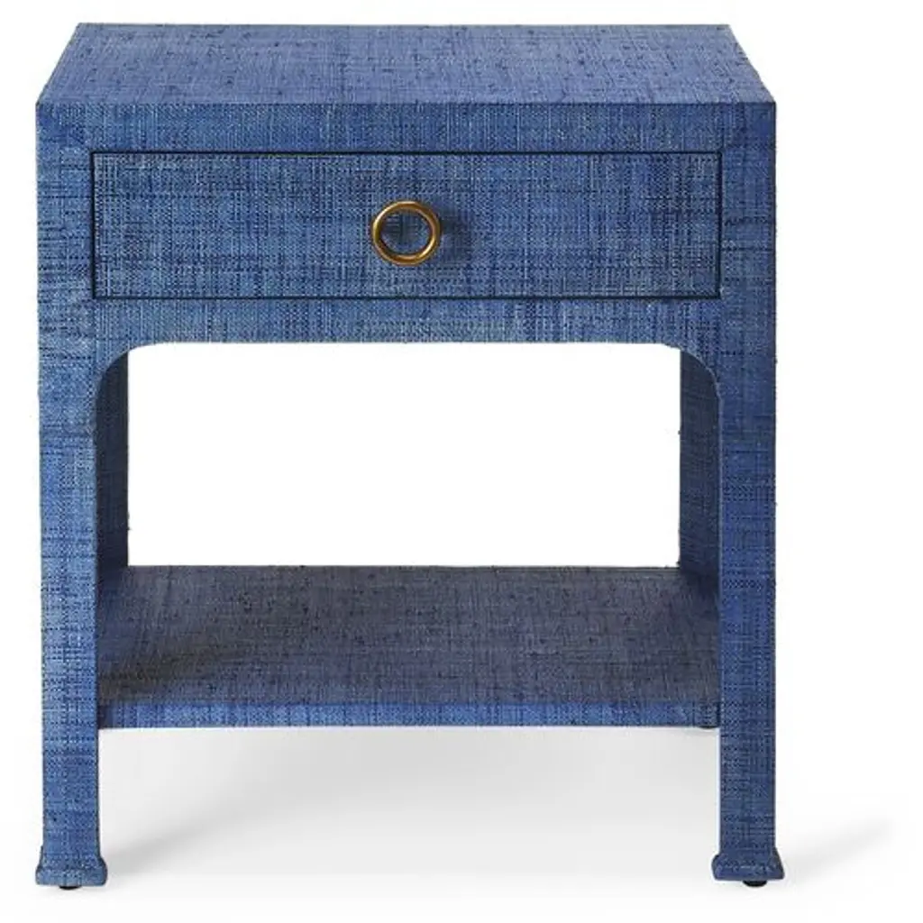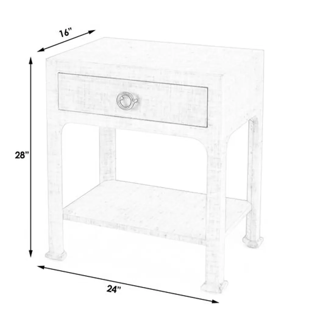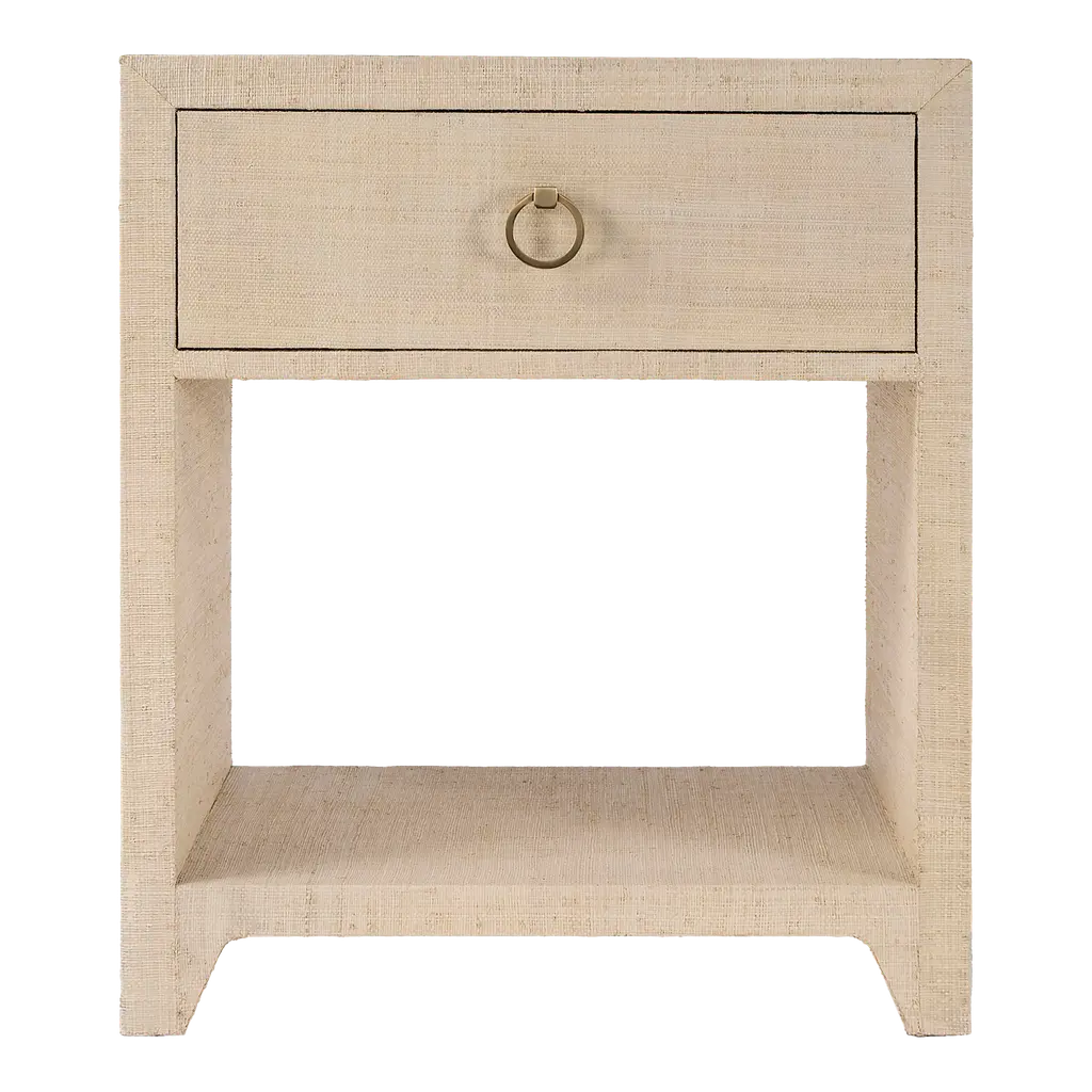 Designed by us and available only at One Kings Lane, this mahogany nightstand is finished in a layer of woven raffia for a look that feels both tactile and chic. Detailed with a sliding drawer, 16 inches of surface depth, and a lower shelf, it offers plenty of room for bedside storage. A single brass drawer pull ties the look together.