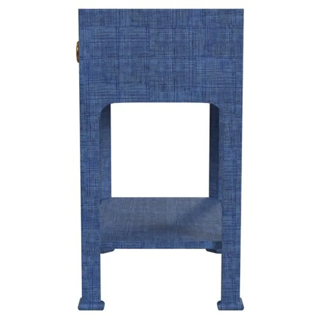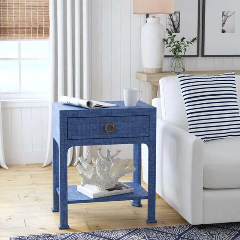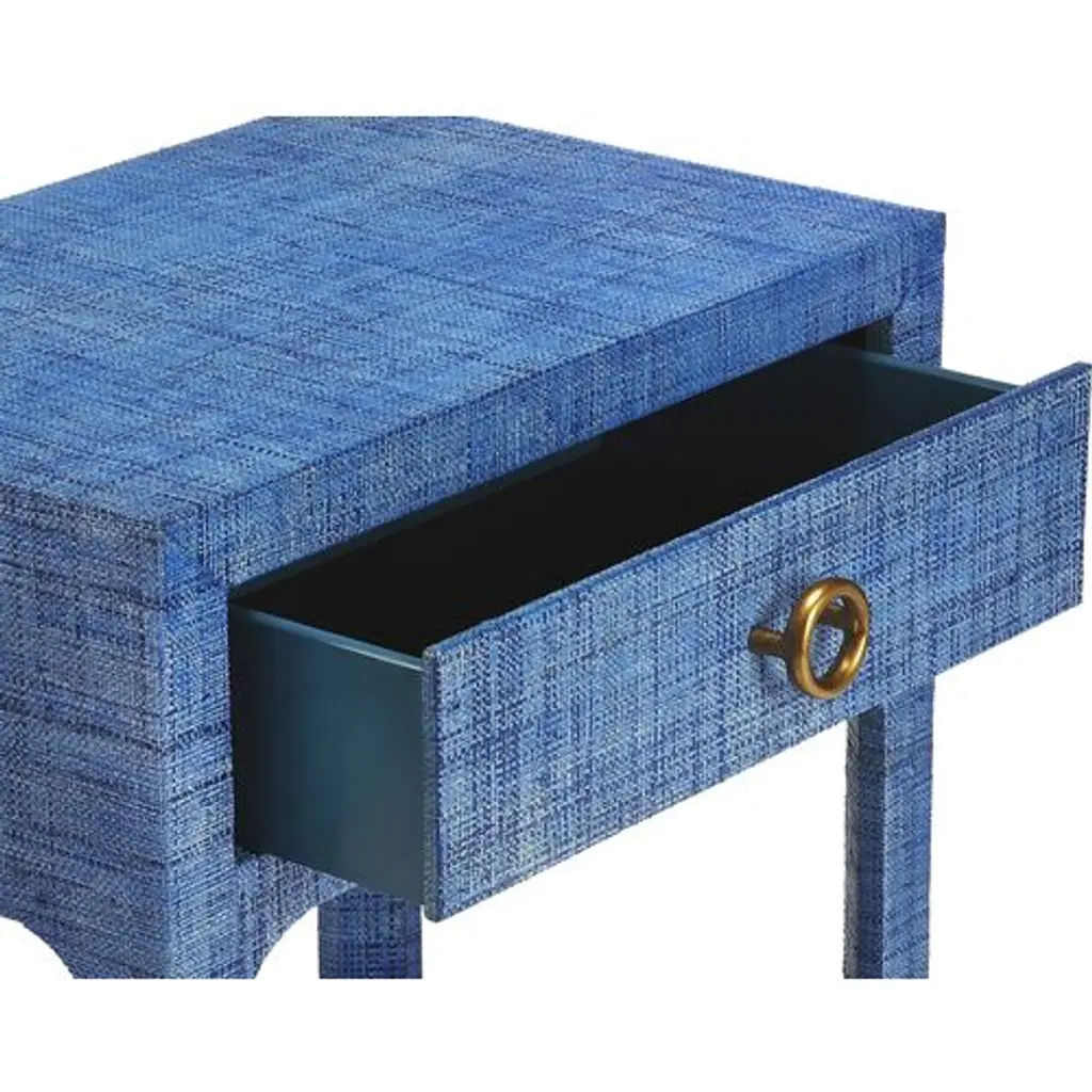 Designed by us and available only at One Kings Lane, this mahogany nightstand is finished in a layer of woven raffia for a look that feels both tactile and chic. Detailed with a sliding drawer, 16 inches of surface depth, and a lower shelf, it offers plenty of room for bedside storage. A single brass drawer pull ties the look together.