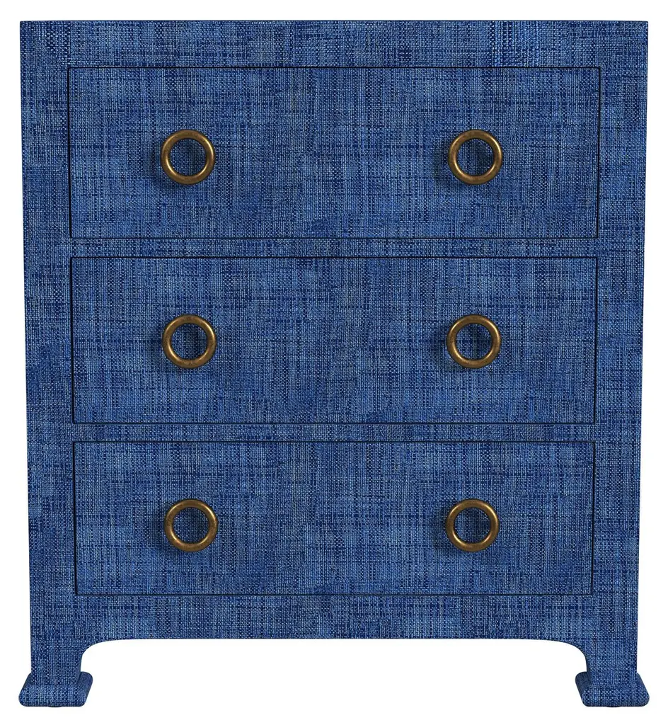 Designed by us and available only at One Kings Lane: This handsome nightstand is masterfully crafted and topped with a layer of woven raffia for a look that feels both tactile and chic. Its three roomy drawers are outfitted with ring-shaped brass pulls.