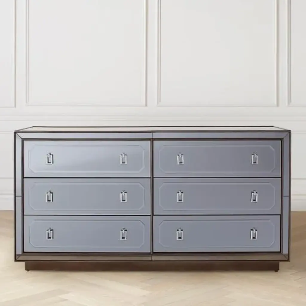 Add glamorous style to your interior with the stunning design of the Laken end table. Made in China, the Laken is comprised of a wood frame fitted with mirrored glass for a graceful aesthetic that adds beauty to any space. Three spacious drawers ornamented with intricately molded metal handles provide easy access to all your household essentials. Fully assembled, the end table features beveled edges and an antique bronze finished metal base for an added touch of glamour. An eye-catching design equipped with outstanding utility, the Laken end table is an exceptional addition to any space. Overall Dimensions: 26" High x 20" Wide x 14" Deep; Legs: 4.5"High; Drawers: 15.50" W x 11" D x 4.50" H