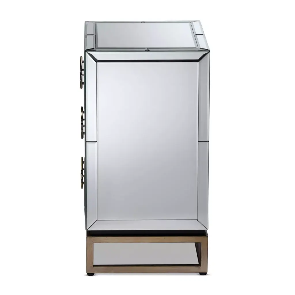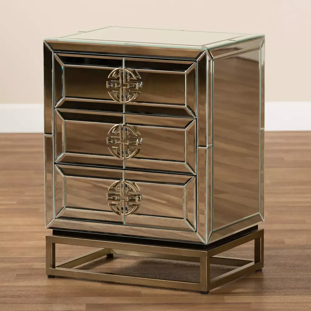 Laken 3 Drawers Mirrored Nightstand - Baxton Studio: Elegant Antique Bronze, Beveled Edges, No Assembly Required