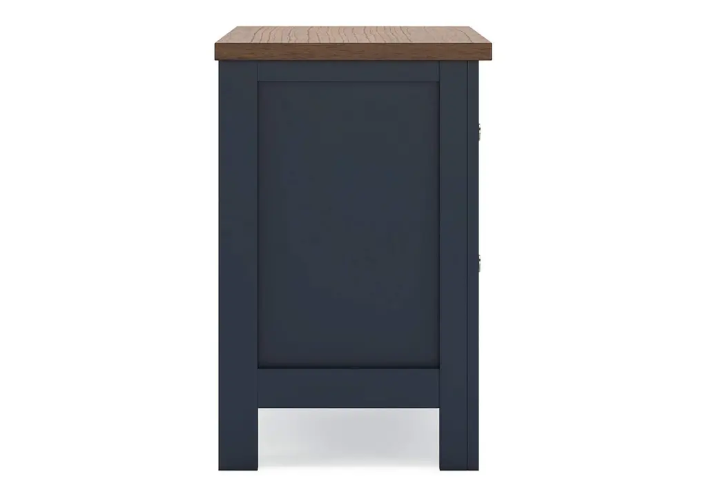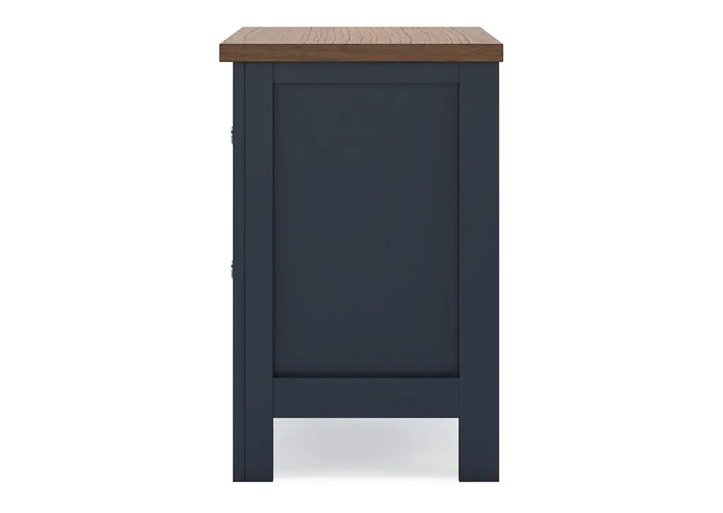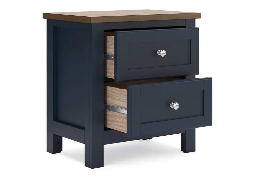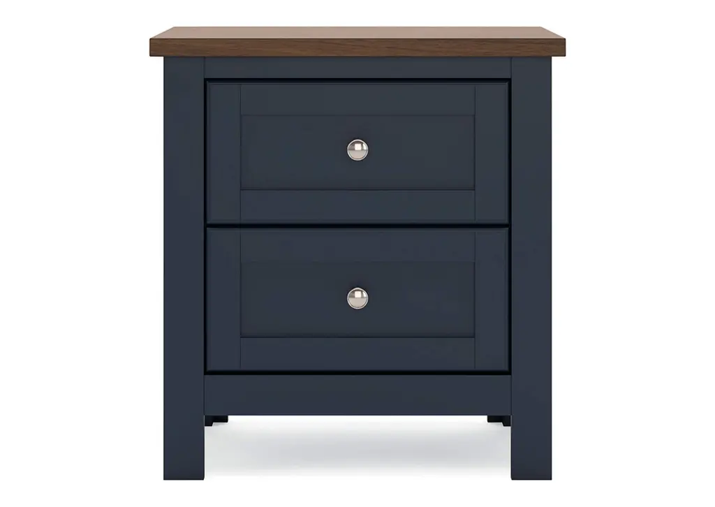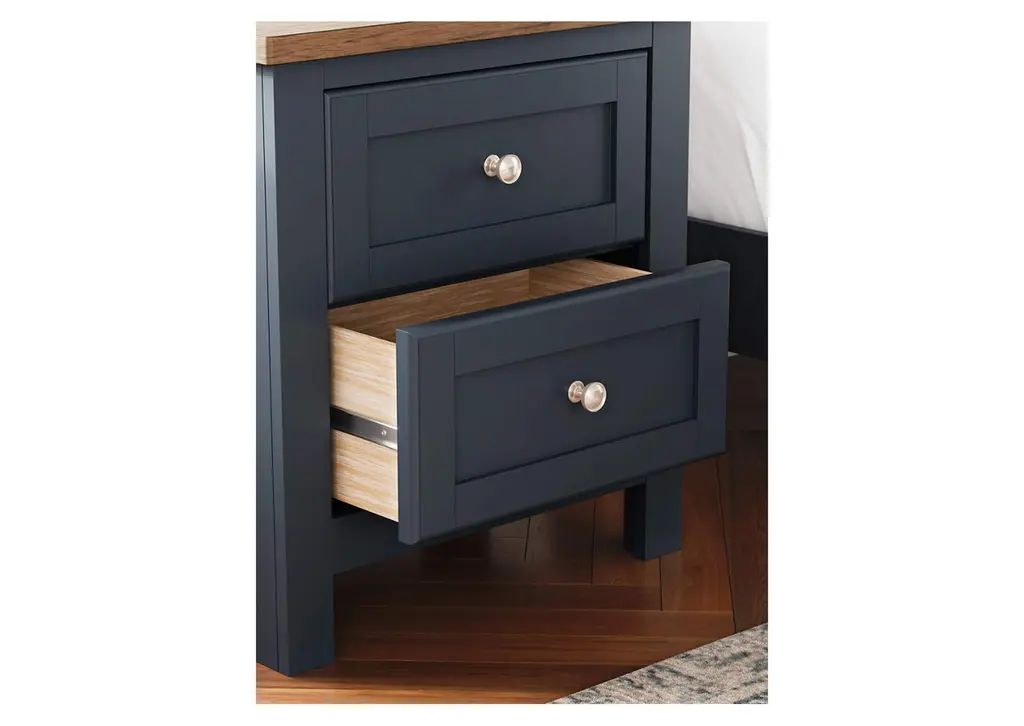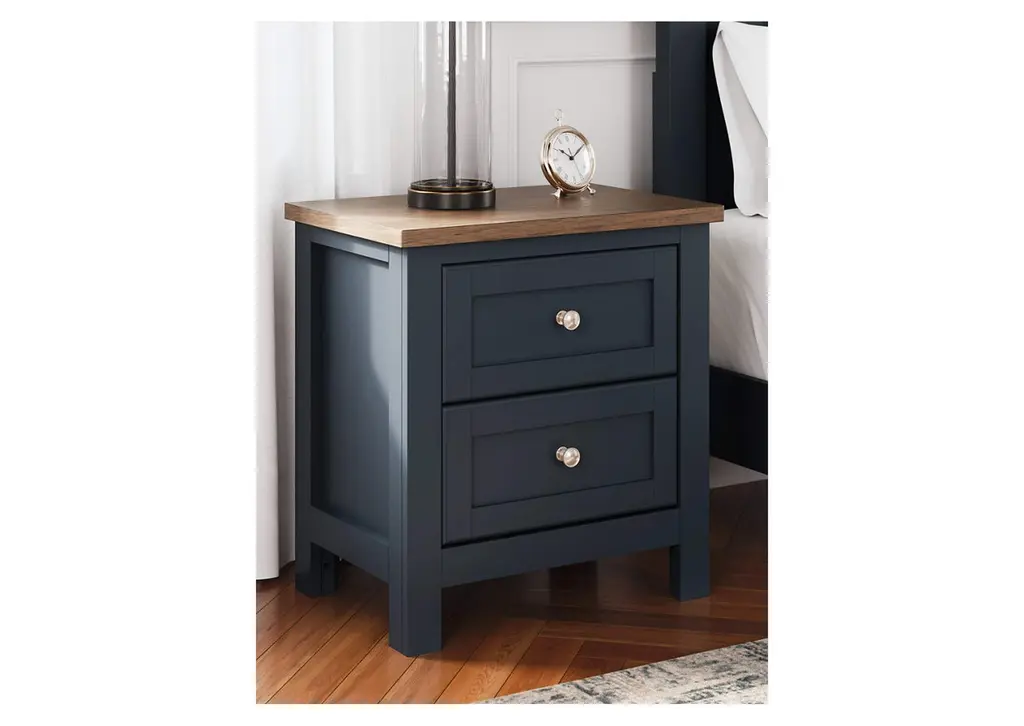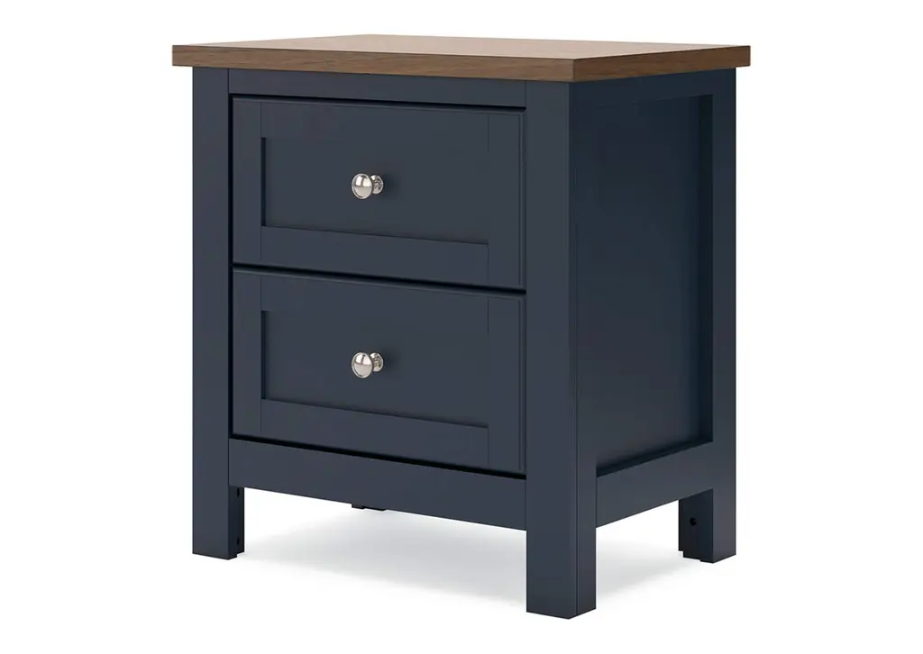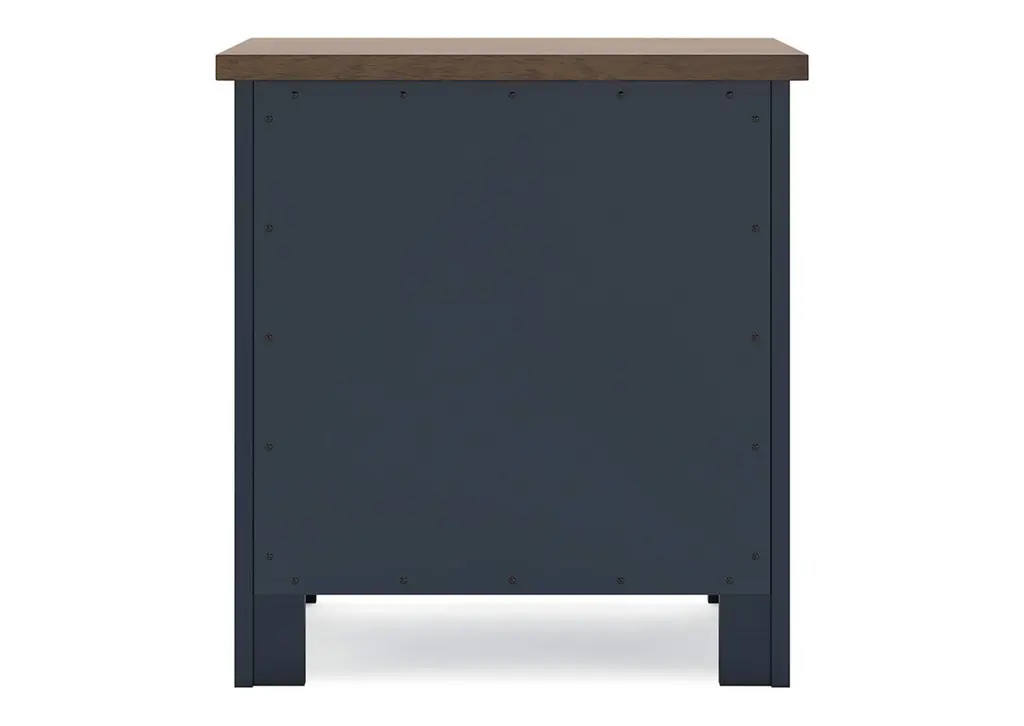 Add homespun charm to your restful retreat. A modern take on a timeless silhouette, the Landocken nightstand pairs a dark slate blue finish with a light brown top. Drawer fronts and legs in a classic Shaker style bring an air of beautiful simplicity to the bedroom. Whether it's part of a charmingly curated guest suite or a casually carefree kids room, this nightstand is a welcome addition. Weight 79.000 lbs. (35.55kgs.)