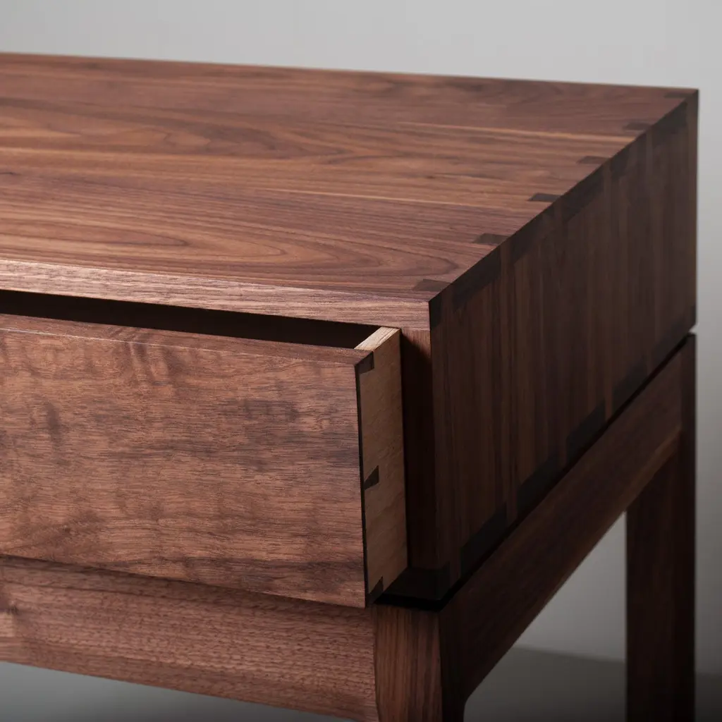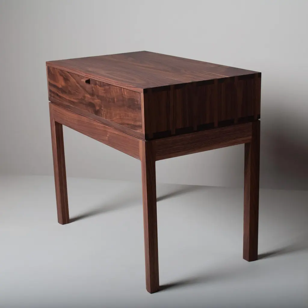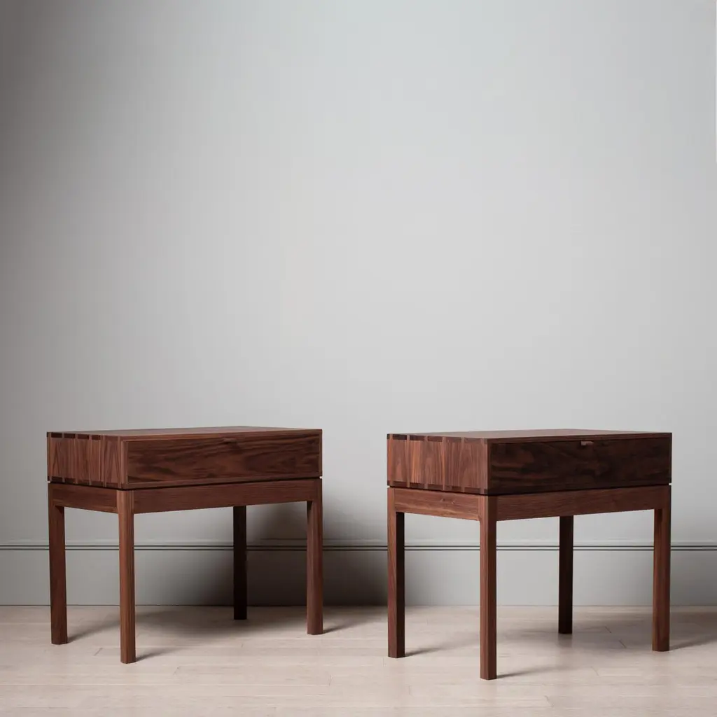 An alternative version, in much larger proportions, of our American black walnut handcrafted nightstands or end tables. These are constructed from the finest American black walnut with the inner dovetailed jointed traditional drawer carcass in prime English Oak. The main upper box is detailed with exposed hand-cut dovetail jointing and contains one drawer. A light curve design is cut into and around the legs and follows along the facia. Price per piece.Designed in London and handmade by our highly experienced craftspeople in England. Hand finished in durable oils. This is a contemporary modernist design with Scandinavian influences utilising traditional English furniture craftsmanship and fine timbers.These can be made to your custom dimensions or bespoke design if required.We design bold and distinctive pieces of furniture – our main objective is combining the design alongside the natural beauty and properties of the raw materials.These timbers and materials are very carefully chosen for each specific design - maintaining our focus on the benefits, visual impact and strengths of what we use. Our regular use of English Quartersawn Oak is one case in point. It has been the beloved timber of fine furniture makers across the world for centuries. It is costly to produce but gives huge benefits and rewards such as its striking medullary rays and superb stability qualities. By utilising these wonderful and naturally occurring features with our contemporary designs we aim to continue creating some very distinct, tactile and idiosyncratic pieces.These are all completely handmade, in very small numbers, by our skilled craftspeople in England.