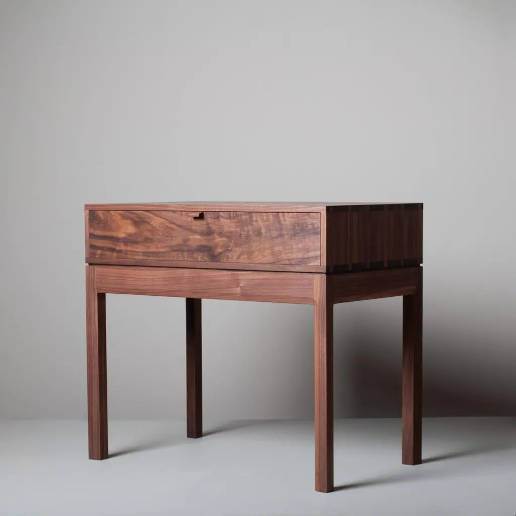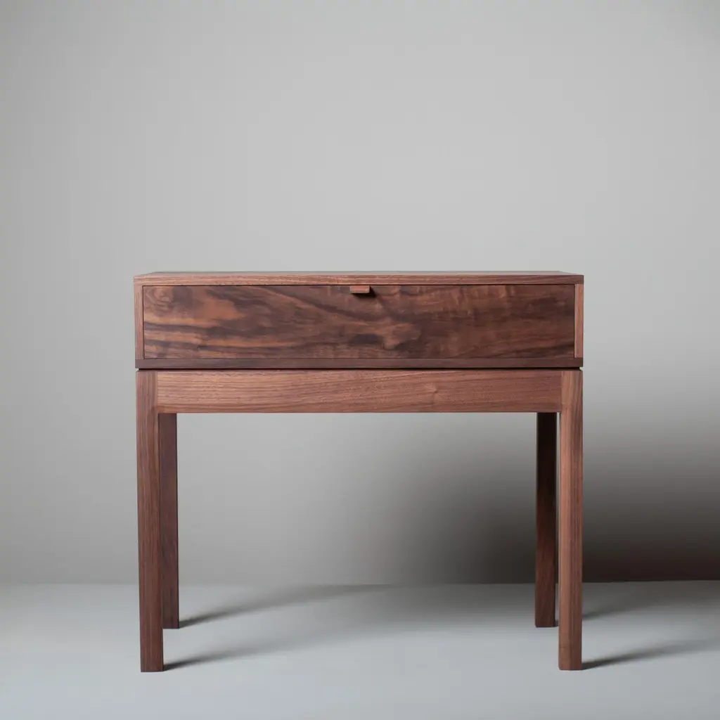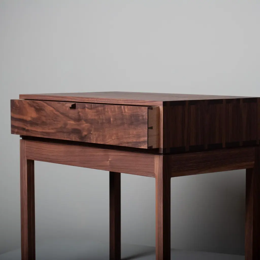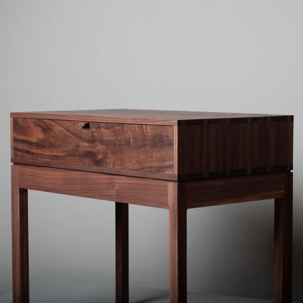 An alternative version, in much larger proportions, of our American black walnut handcrafted nightstands or end tables. These are constructed from the finest American black walnut with the inner dovetailed jointed traditional drawer carcass in prime English Oak. The main upper box is detailed with exposed hand-cut dovetail jointing and contains one drawer. A light curve design is cut into and around the legs and follows along the facia. Price per piece.Designed in London and handmade by our highly experienced craftspeople in England. Hand finished in durable oils. This is a contemporary modernist design with Scandinavian influences utilising traditional English furniture craftsmanship and fine timbers.These can be made to your custom dimensions or bespoke design if required.We design bold and distinctive pieces of furniture – our main objective is combining the design alongside the natural beauty and properties of the raw materials.These timbers and materials are very carefully chosen for each specific design - maintaining our focus on the benefits, visual impact and strengths of what we use. Our regular use of English Quartersawn Oak is one case in point. It has been the beloved timber of fine furniture makers across the world for centuries. It is costly to produce but gives huge benefits and rewards such as its striking medullary rays and superb stability qualities. By utilising these wonderful and naturally occurring features with our contemporary designs we aim to continue creating some very distinct, tactile and idiosyncratic pieces.These are all completely handmade, in very small numbers, by our skilled craftspeople in England.