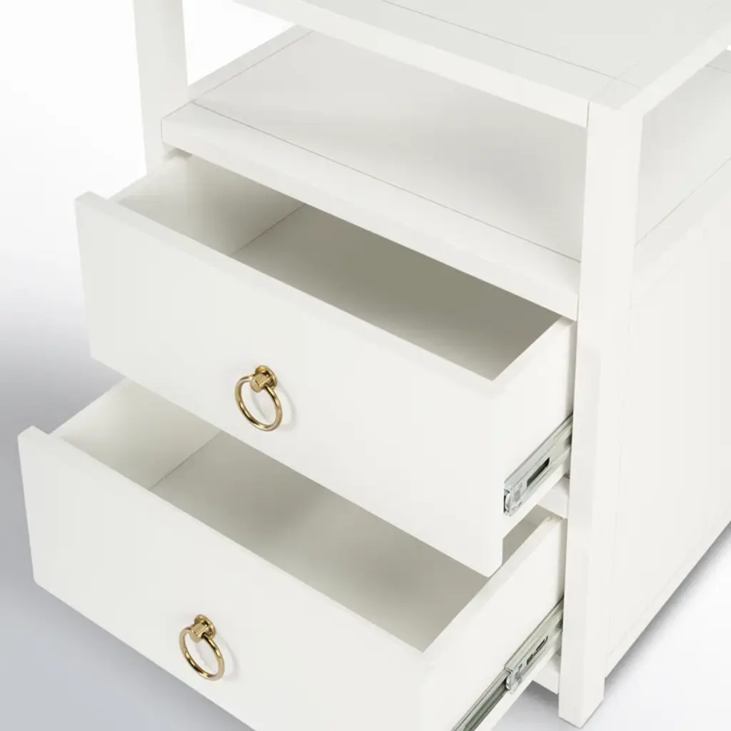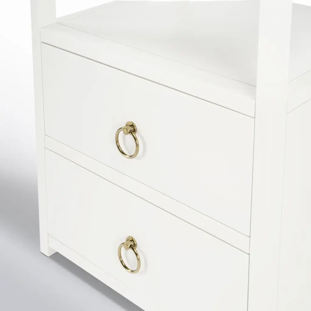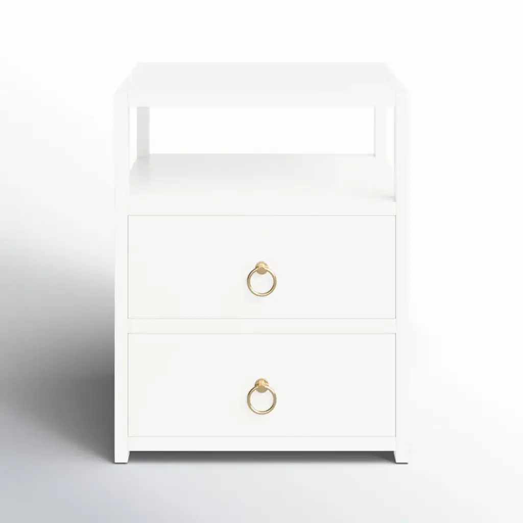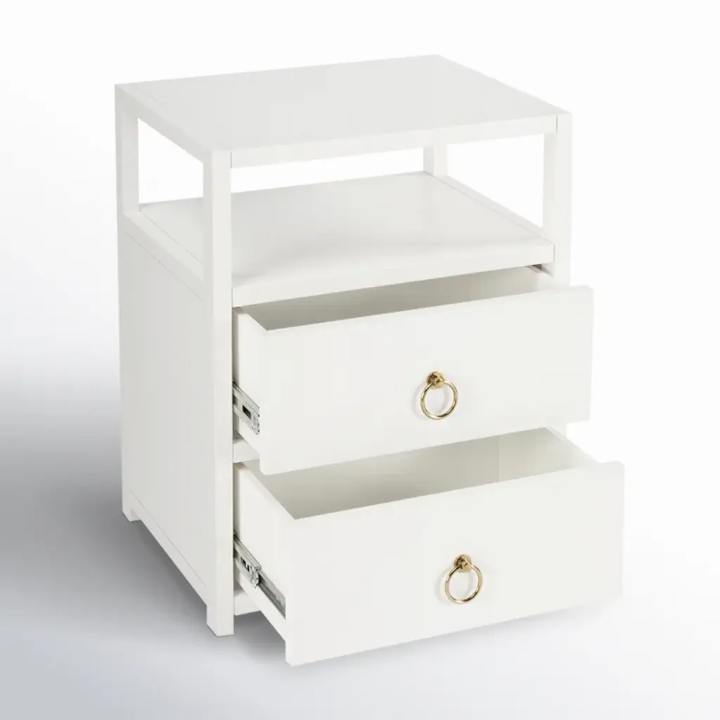 The minimalist design of this stylish nightstand makes it an ideal addition in any contemporary space. Crafted from acacia or pine wood solids and engineered wood products, it features two drawers with ring pulls, for a hint of glam, and ball bearing glides for easy opening and closing. Just beneath the top is an open shelf for keeping essentials organized and within reach, and it is a great spot to charge a phone or other device. It is suitable for use as an end table, and is available in white, navy, and a natural wire brush finishes.