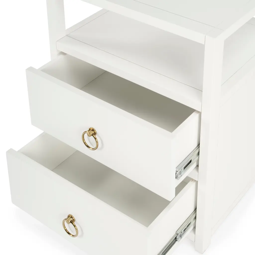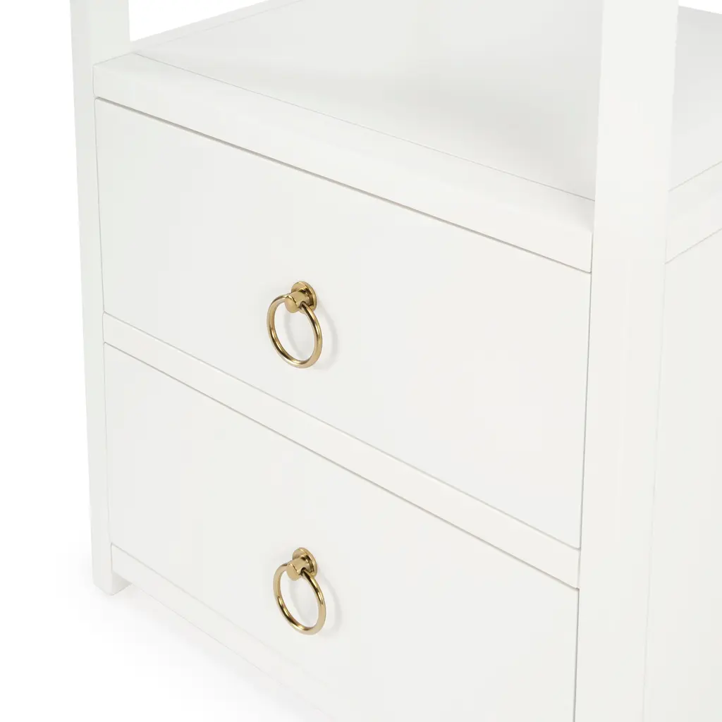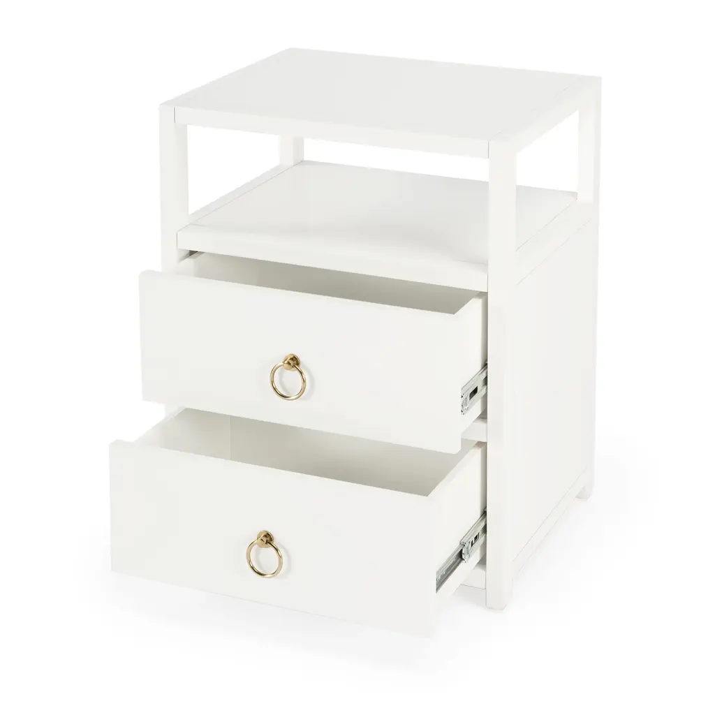 The minimalist design of this stylish nightstand makes it an ideal addition in any contemporary space. Crafted from acacia or pine Wood solids and engineered Wood products, it features two drawers with ring pulls, for a hint of glam, and ball bearing glides for easy opening and closing. Just beneath the top is an open shelf for keeping essentials organized and within reach, and it is a great spot to charge a phone or other device. It is suitable for use as an end table, and is available in white, navy, and a natural wire brush finishes. Durably Constructed With: Pine Wood Solids, MDF Product Construction Features: Metal Slide Product Assembled Measurement & Weight: 26.5" H x 21.0" W x 17.25" D -- 45.0 lbs. 200 lbs. Suggested weight capacity Item Arrives: Assembled Wood, like all natural materials, has inherent disparities in color and grain pattern. Variations in shade and markings are normal and can be expected with the natural materials used in the construction of this product. Photo may slightly differ from actual item in terms of color/finish due to the lighting during photo shoot or the monitor's display.