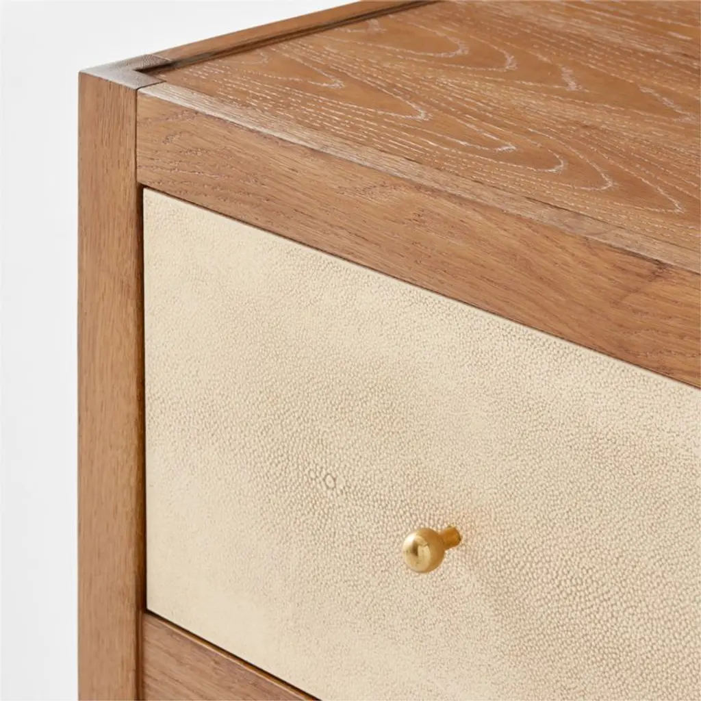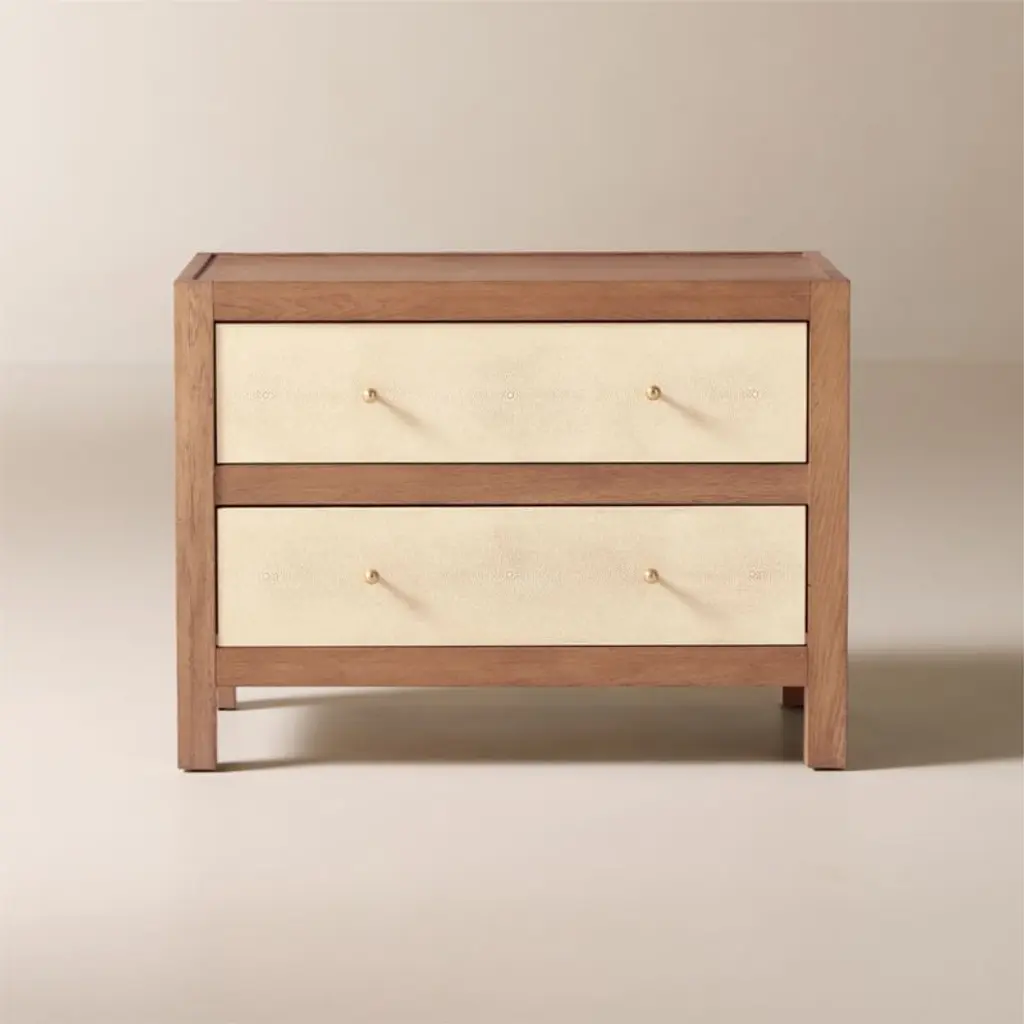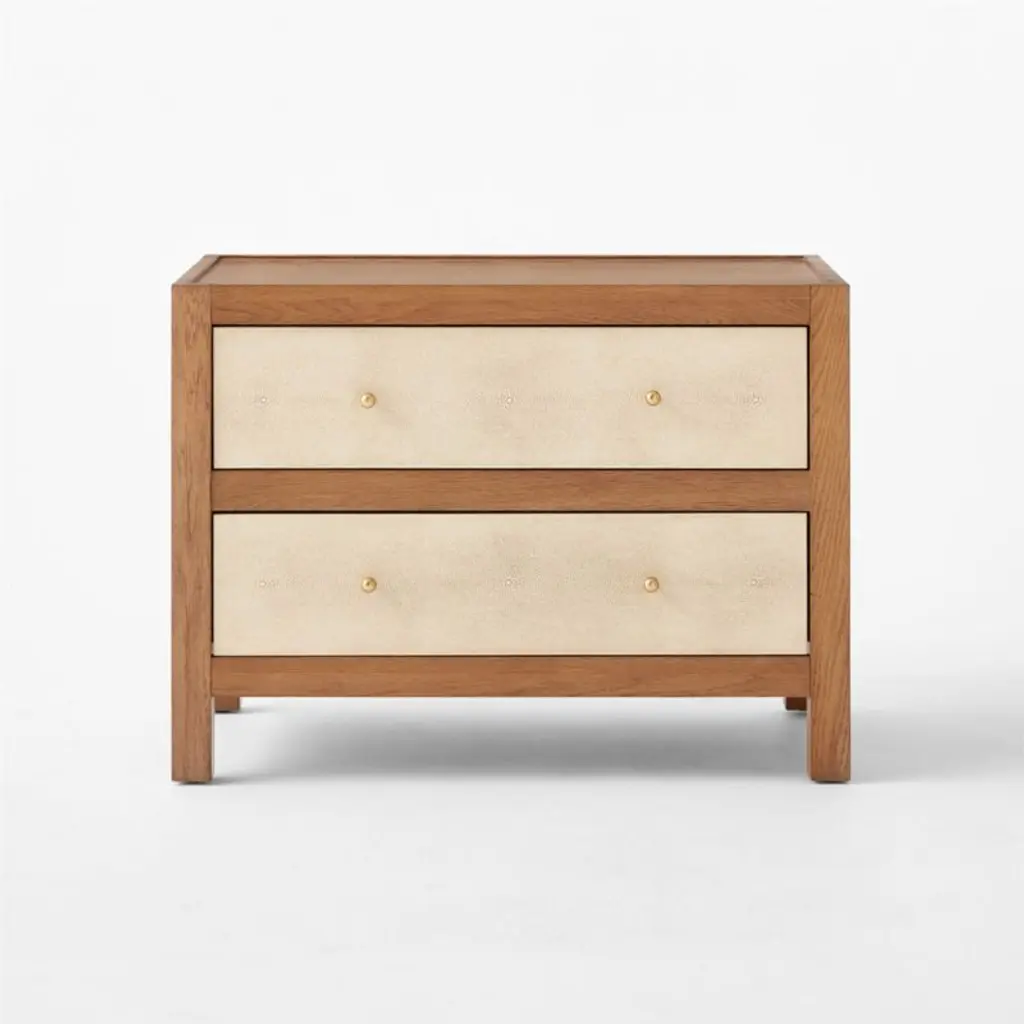 Two-drawer nightstand by Ceci Thompson of VUUE features a beautiful mix of materials. The classic design is constructed with white oak, certified sustainable by the Forest Stewardship Council , with a warm brown stain that emphasizes the beauty of the wood grain. Drawer fronts feature an aged, faux shagreen in a warm ivory shade. Spherical hardware is made of solid unlacquered brass that will develop a gorgeous, lived-in patina as the piece ages. CB2 exclusive.