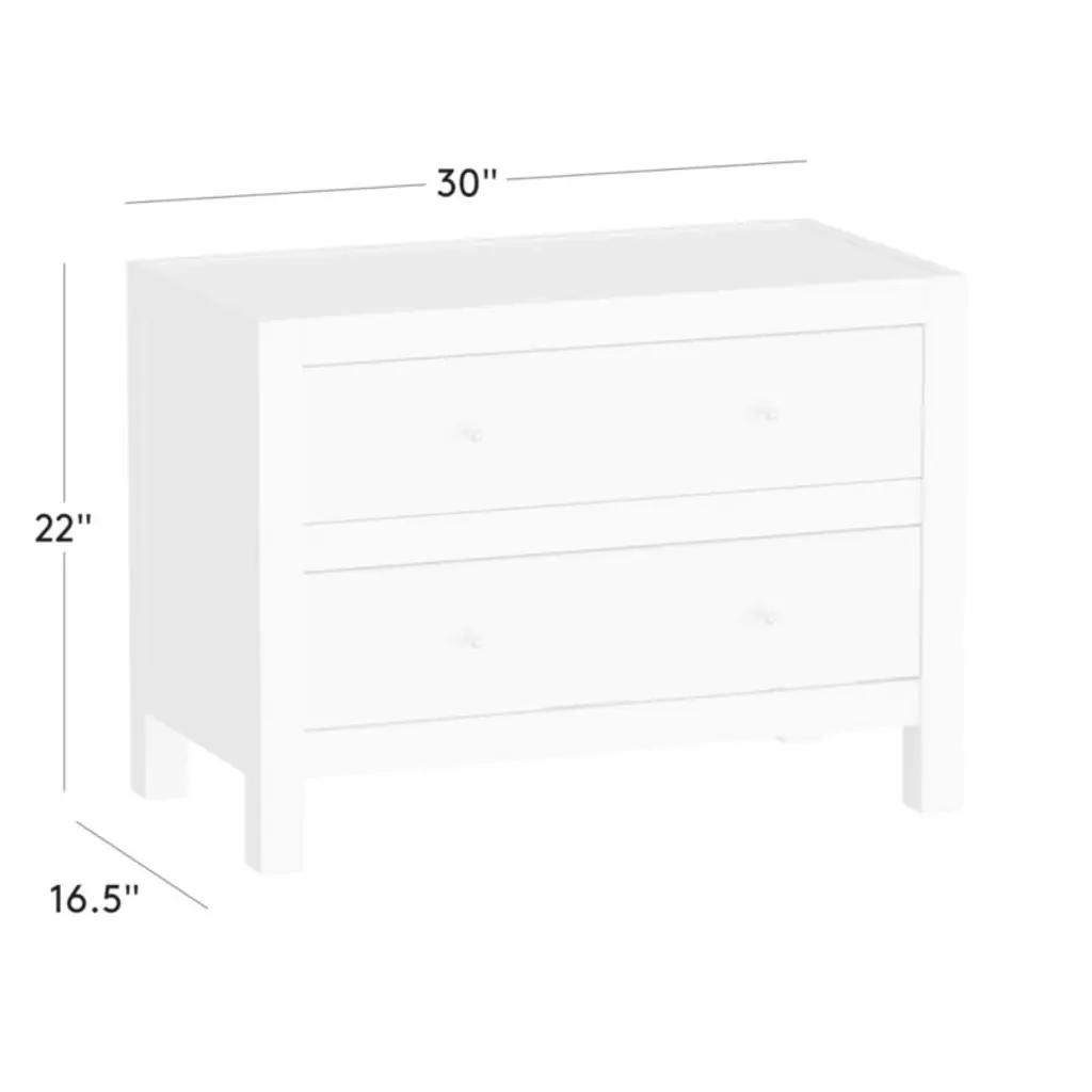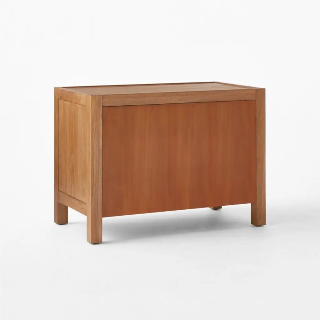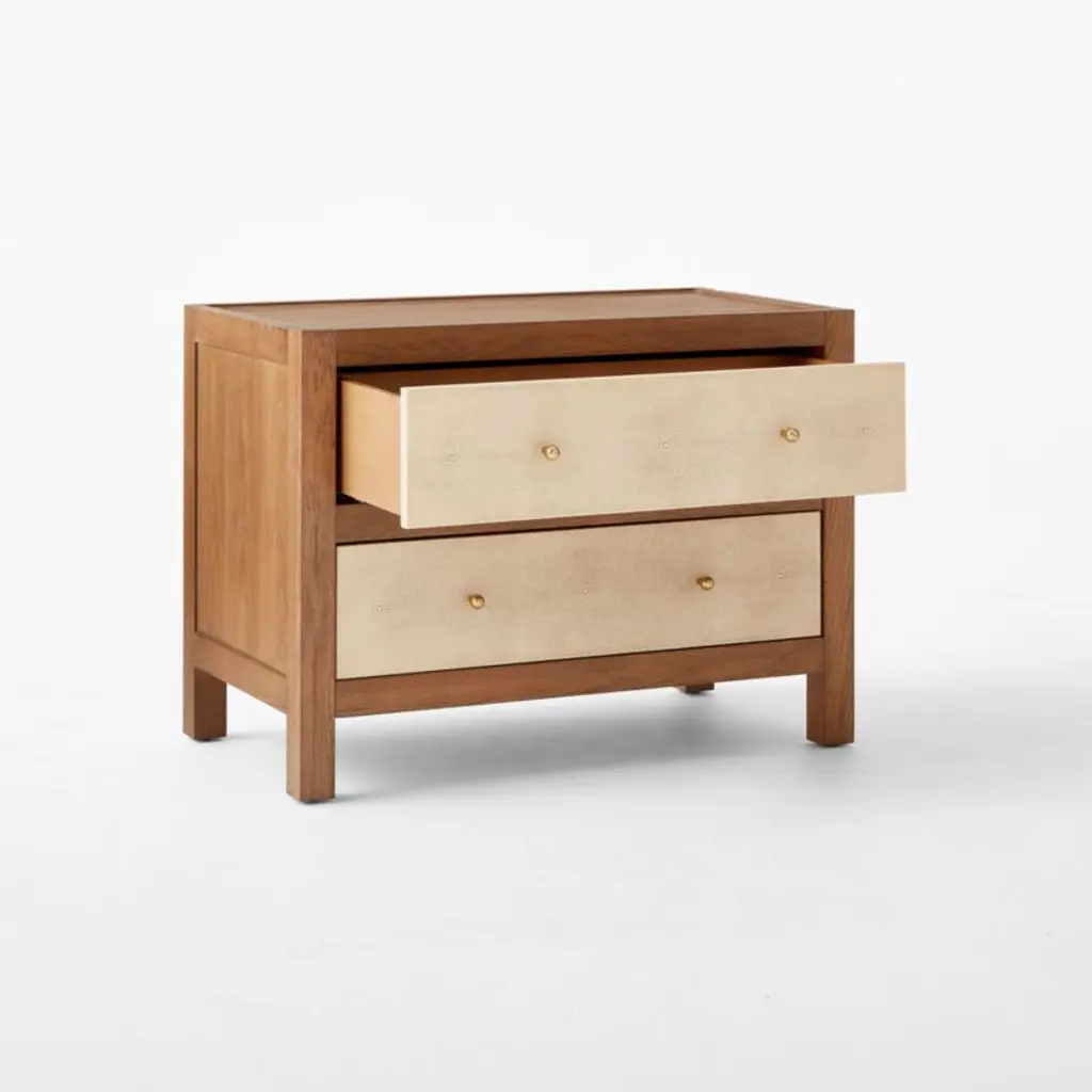 Two-drawer nightstand by Ceci Thompson of VUUE features a beautiful mix of materials. The classic design is constructed with white oak, certified sustainable by the Forest Stewardship Council , with a warm brown stain that emphasizes the beauty of the wood grain. Drawer fronts feature an aged, faux shagreen in a warm ivory shade. Spherical hardware is made of solid unlacquered brass that will develop a gorgeous, lived-in patina as the piece ages. CB2 exclusive.
