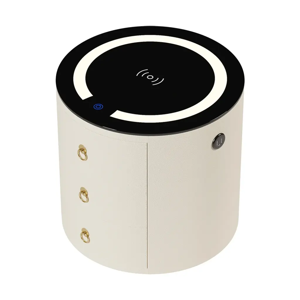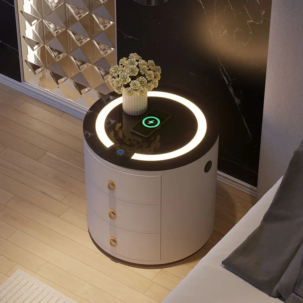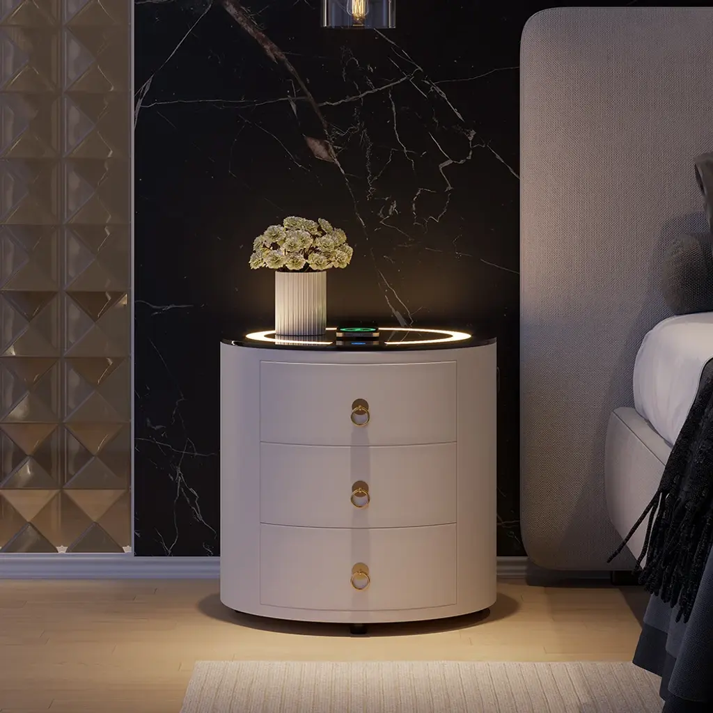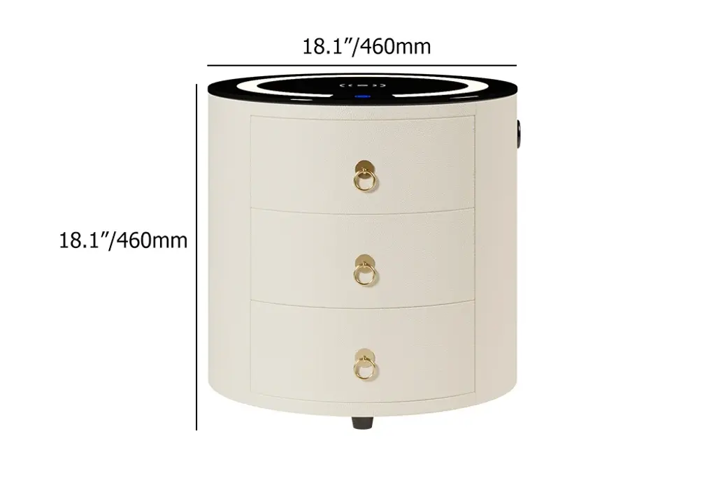 This modern round nightstand combines multiple smart features in a compact design. Integrated LED lighting, wireless charging, and Bluetooth speakers make it a multifunctional bedside hub. Three built-in drawers store essentials while the round silhouette adds a soft, contemporary touch.