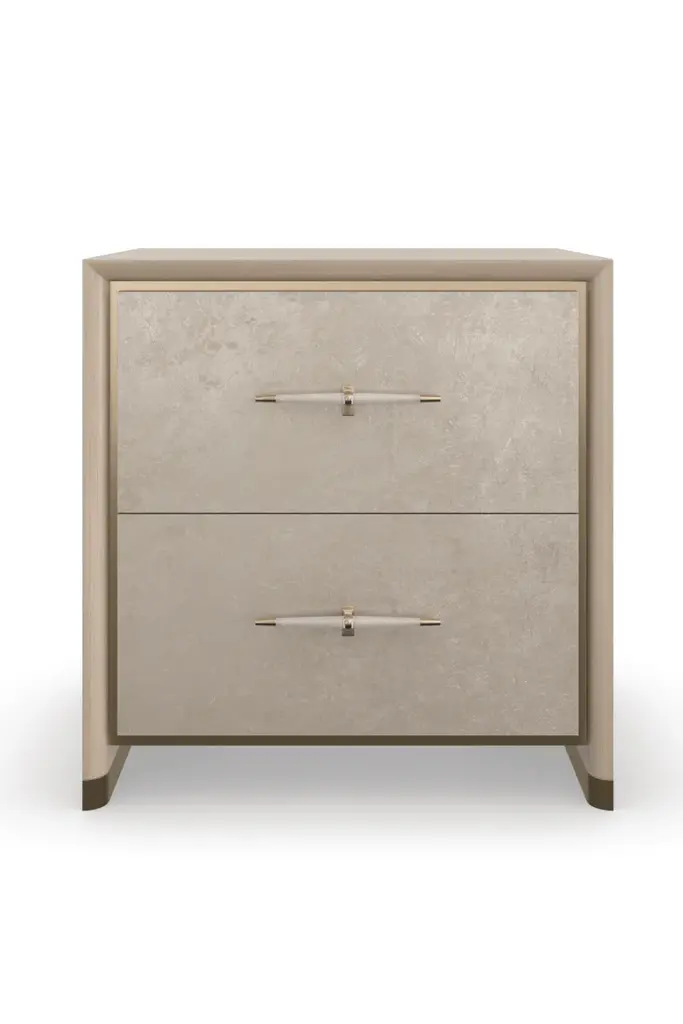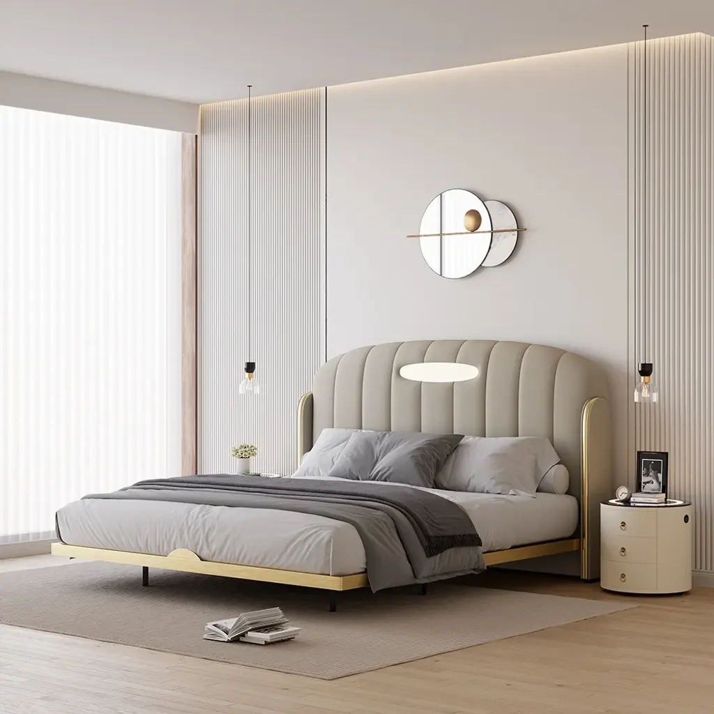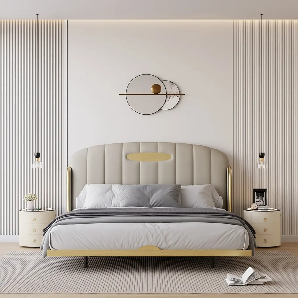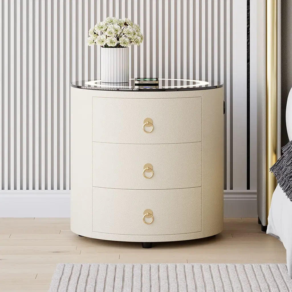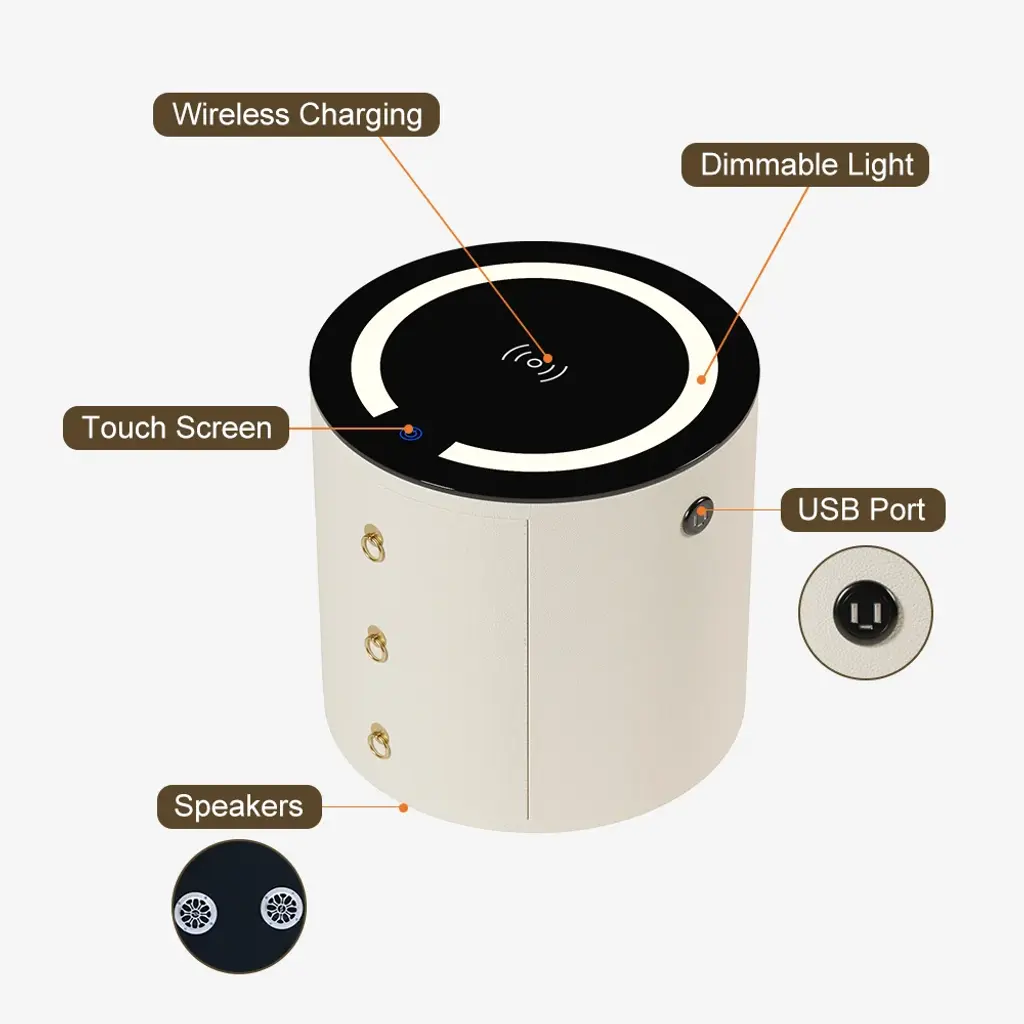 This modern round nightstand combines multiple smart features in a compact design. Integrated LED lighting, wireless charging, and Bluetooth speakers make it a multifunctional bedside hub. Three built-in drawers store essentials while the round silhouette adds a soft, contemporary touch.