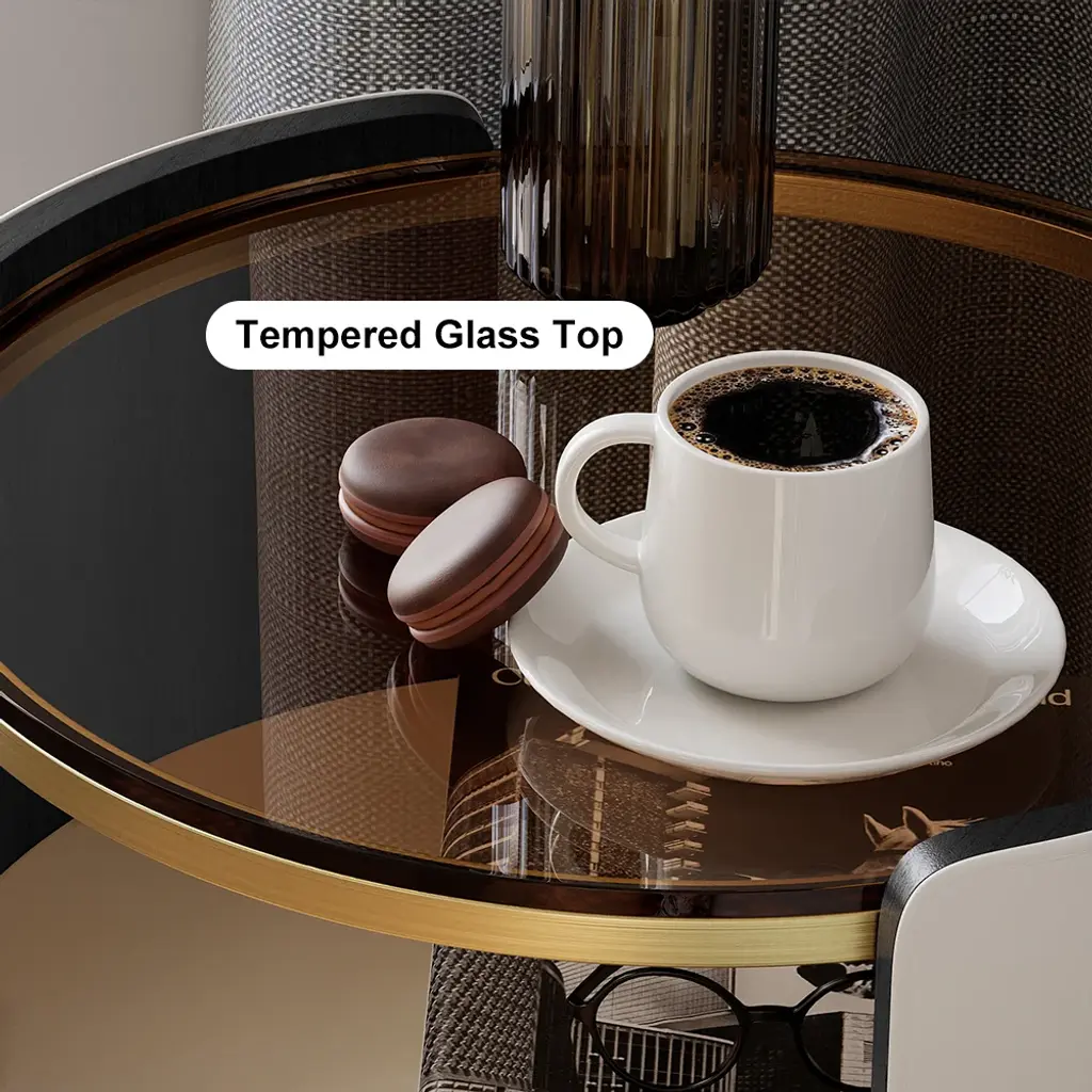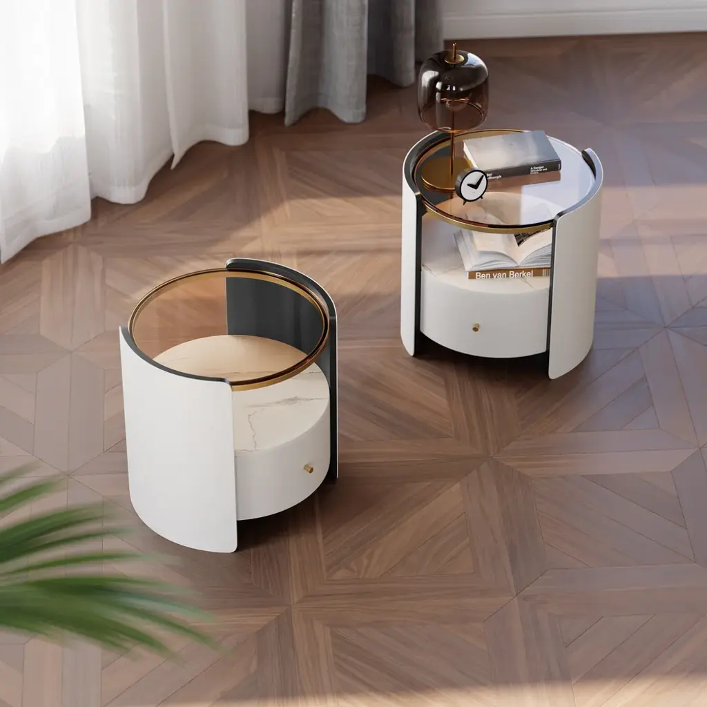 Leather & Sintered Stone Round Nightstand With Glass Top Set Of 2