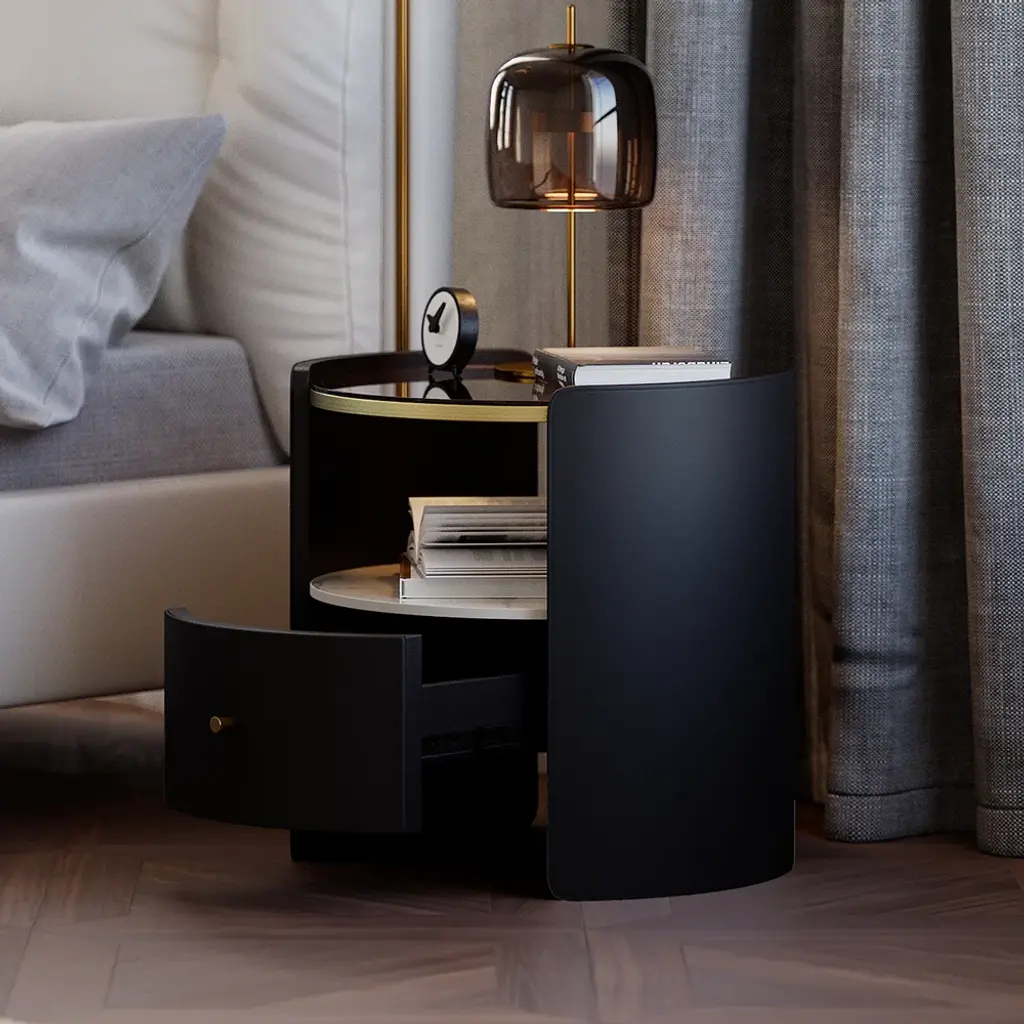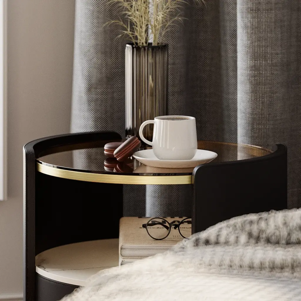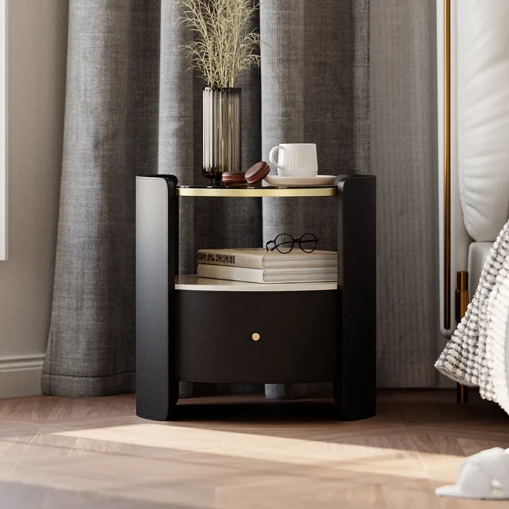 Immerse yourself in the allure of our captivating nightstand, where sophisticated modernity blends seamlessly with luxurious craftsmanship. This exceptional piece redefines elegance and elevates your living space to unprecedented heights of style and class. 【Innovative Material Fusion】The nightstand boasts an innovative material fusion that sets it apart from the ordinary. A sleek glass top exudes contemporary allure, while the sintered stone shelving lends a sense of natural beauty and durability. Luxurious leather accents complete the ensemble, elevating its appeal with a touch of opulence. 【Unmatched Functionality】Not just a sight to behold, this nightstand embraces functionality at its core. The spacious glass top provides a perfect spot for your bedtime essentials, while the sintered stone shelving offers robust support and stability. Store your treasured possessions in its discreet leather-covered drawer, keeping your space clutter-free and organized. 【Elegance Meets Durability】With its stable construction, the nightstand marries elegance with unwavering durability. Resistant to scratches, heat, and moisture, it ensures longevity without compromising on aesthetics. Its timeless design allows you to enjoy a piece of art that stands the test of time.