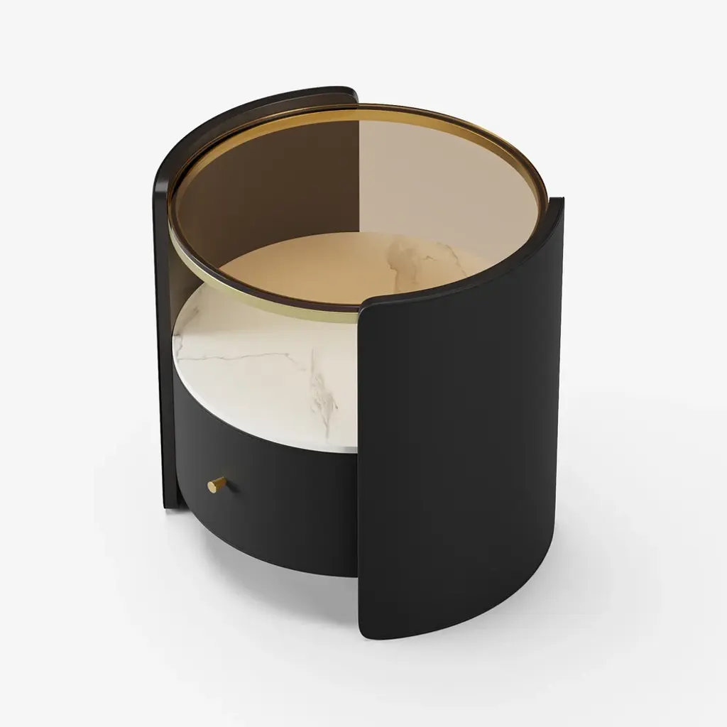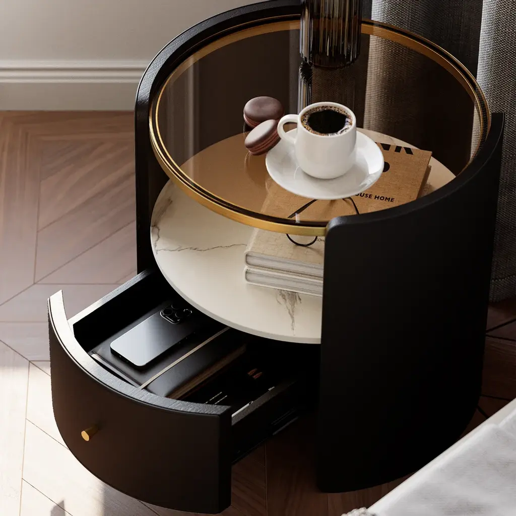 Leather & Sintered Stone Round Nightstand With Glass Top Set Of 2