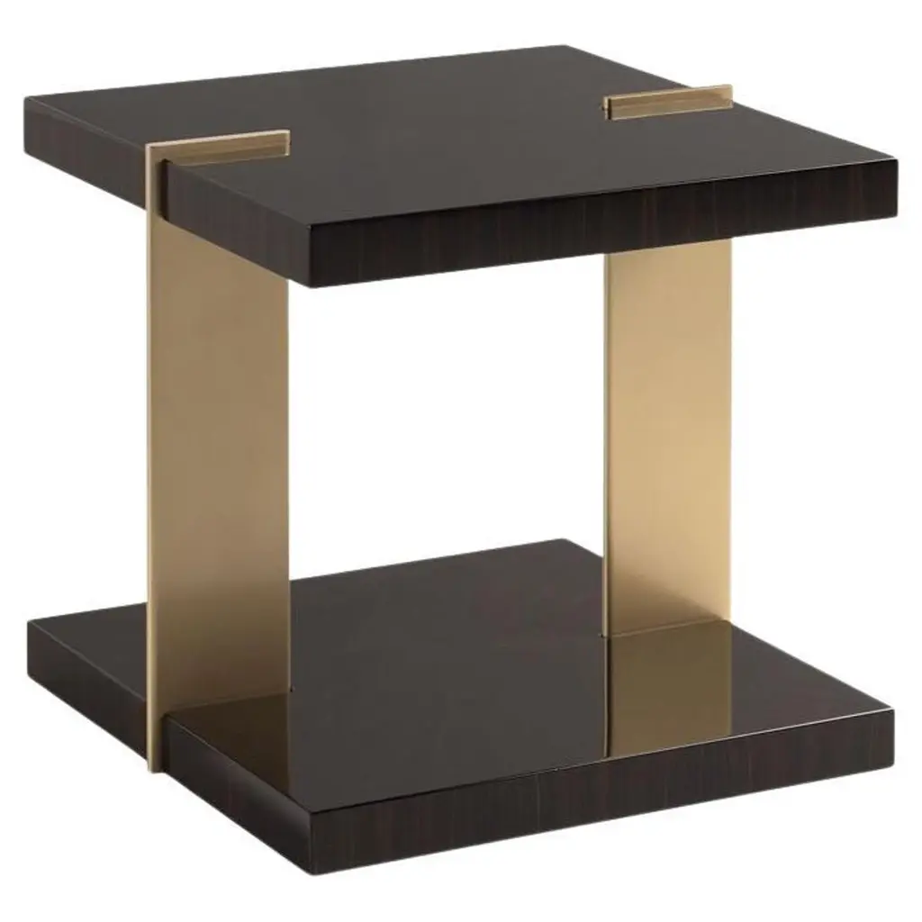 A rigorous and refined geometrical design characterizes this polished nightstand. Complemented by two thin brass-finished metal sheets functioning as legs, the upper structure of this piece has a dark brown wood finish and consists of two drawers with delicate metal details, boasting the same brass finish of the legs. Various finishing and lacquering options are available for this exclusive object of decor, please contact the Concierge for details.