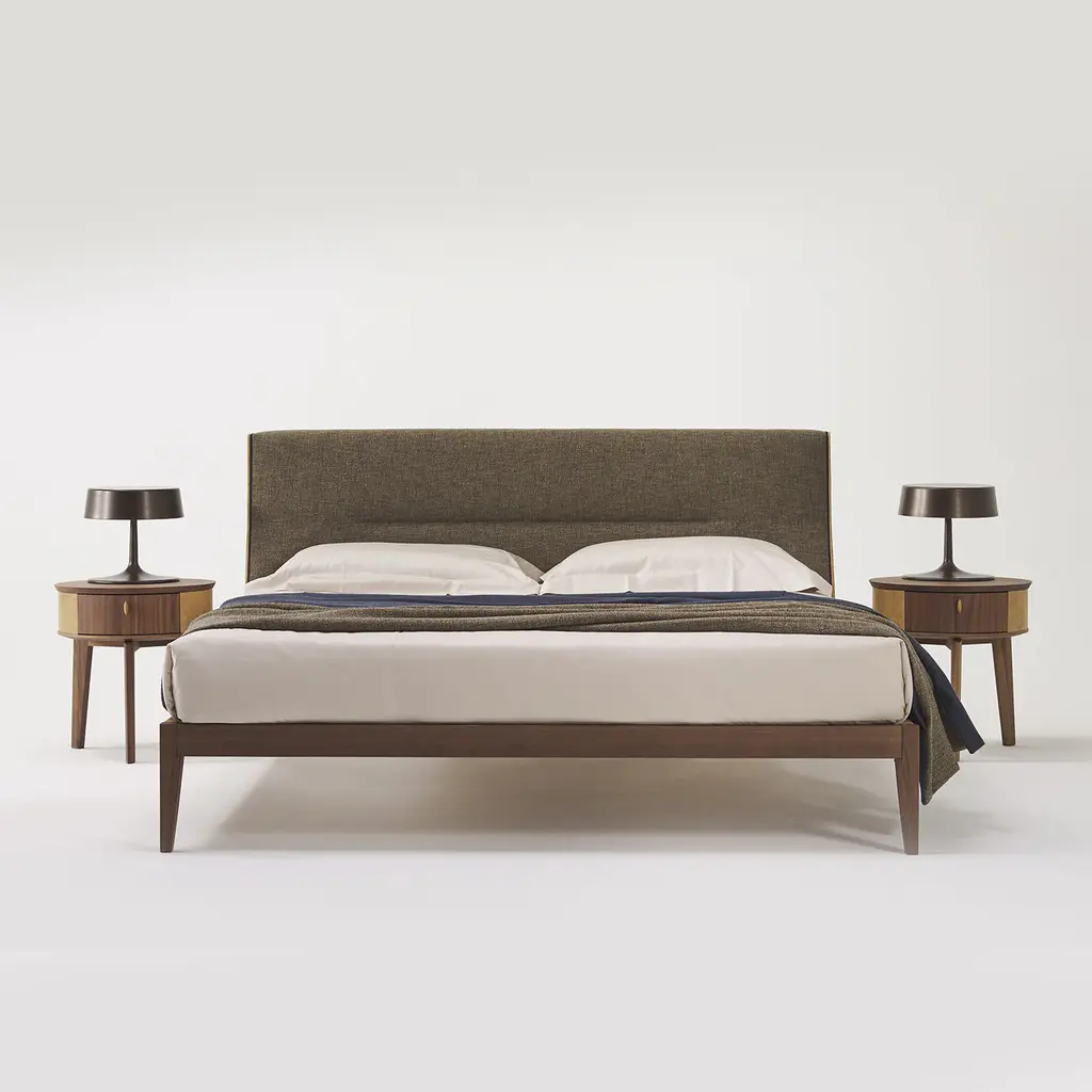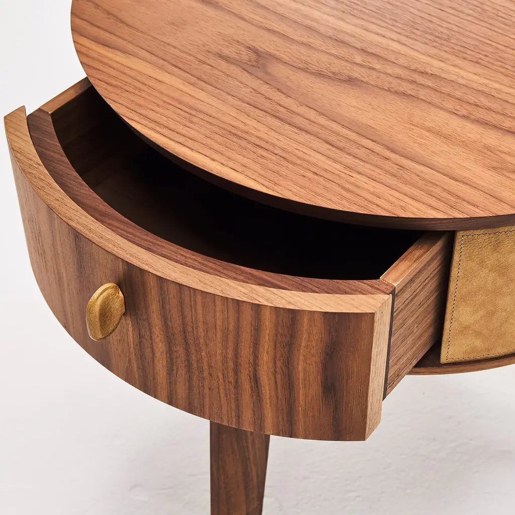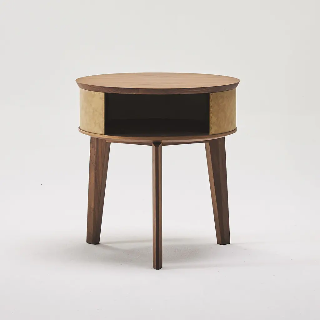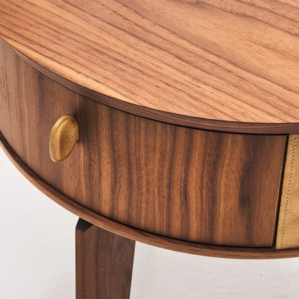 Modern and sophisticated in its sleek profiles and exclusive finishes, this nightstand exemplifies that commitment to precious details Casa Covre pursues in all of its products. Fine Canaletto walnut is the captivating finish selected to enrich the plywood frame, from the tripod base up to the round top with a slanted border. Sauvage leather embraces the cylindrical body lending the piece unmistakable sartorial allure.