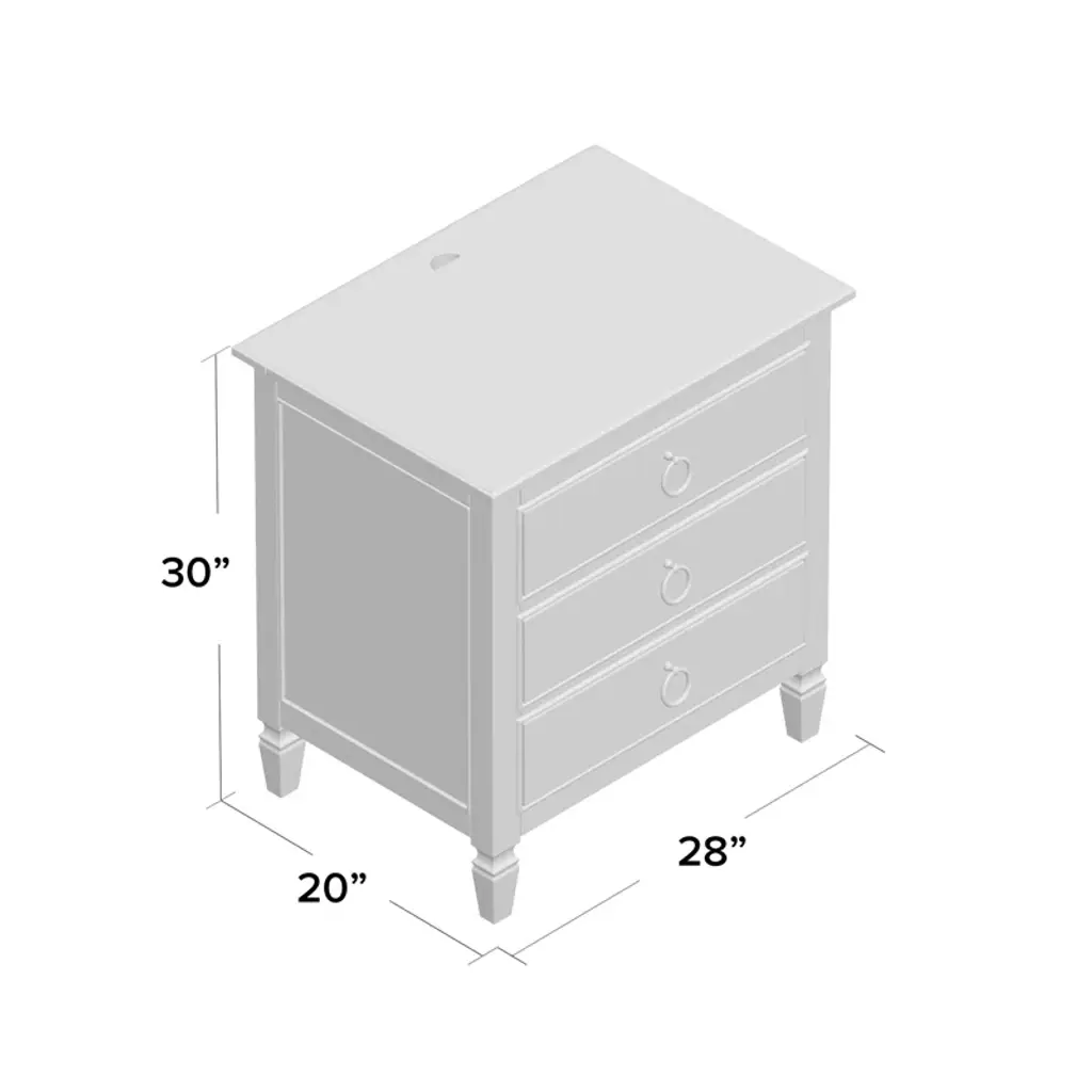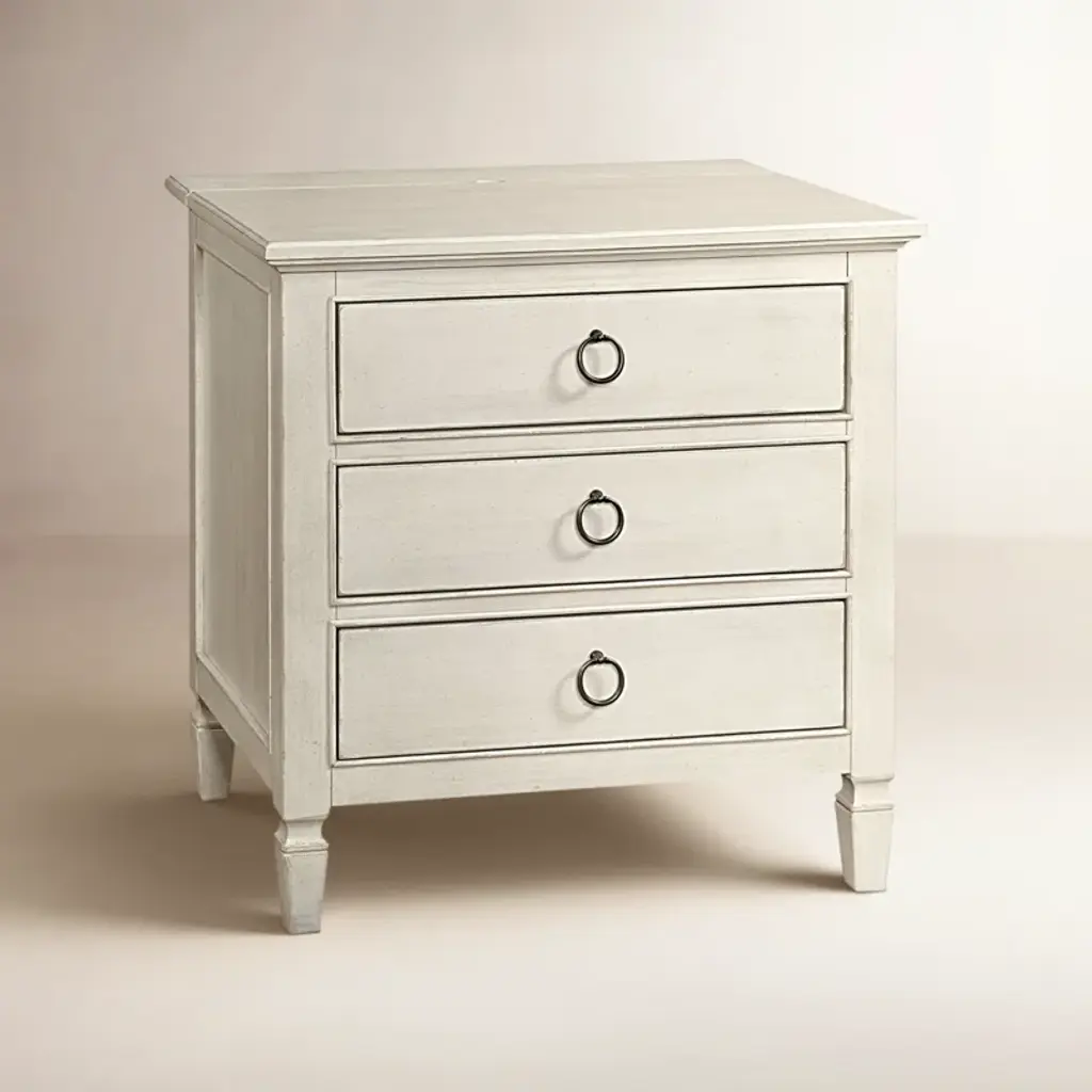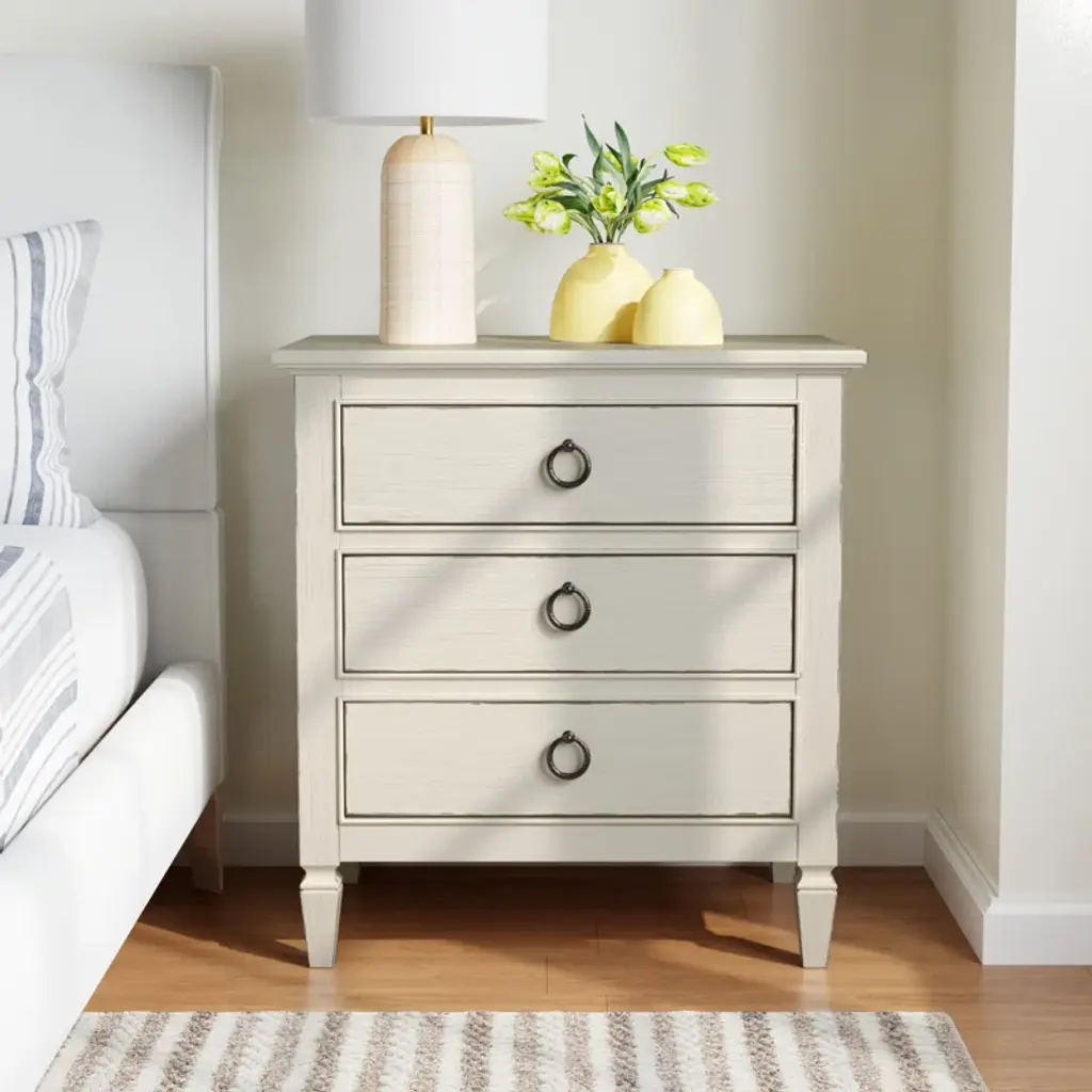 This 3-drawer nightstand is sure to help you welcome in some farmhouse charm and plenty of bedroom storage in one easy step. It's made of solid and engineered wood with vintage-inspired touches like bead molding, tapered feet, and removable ring pulls. It has an easy-to-match off-white finish that's rubbed through in spots for an antique feel. This bedside table has three drawers that give you space to store nighttime essentials. Best of all, it arrives fully assembled, with built-in outlets where you can charge your phone and plug in a reading lamp.