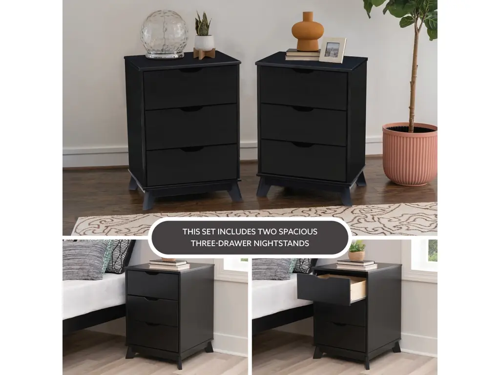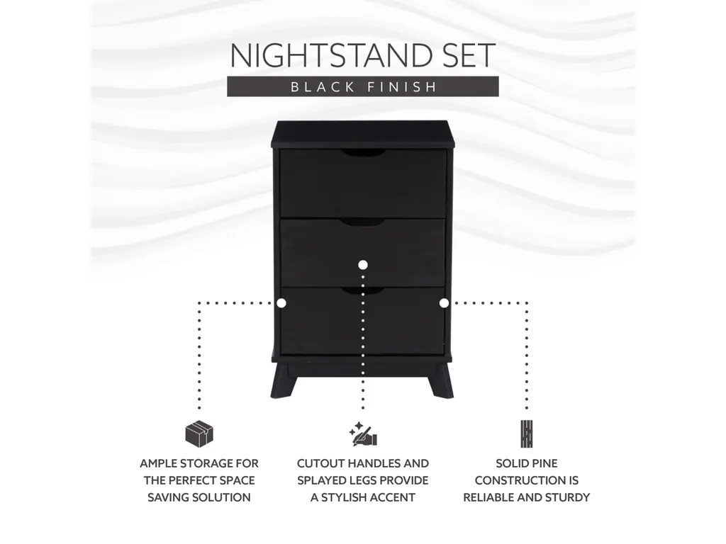 Introducing our Nightstand Duo in Black, where style meets functionality! Crafted from solid pine, each piece is kissed with a sleek black finish and topped with UV varnish. Compact yet spacious, these 3 drawer wonders carry a weight capacity of 50 lbs on top and 20 lbs in each drawer. Elevate your bedside with this chic pair that's not just eye candy but practical too!