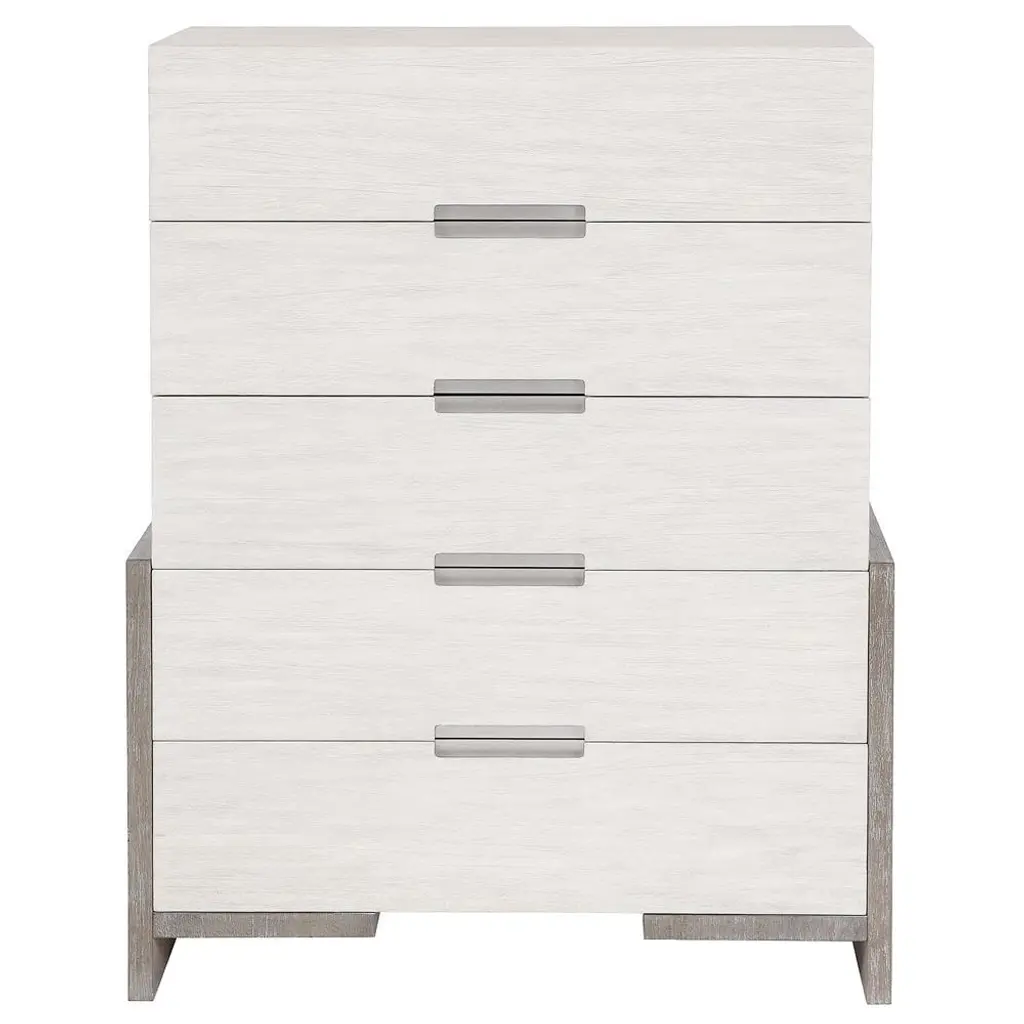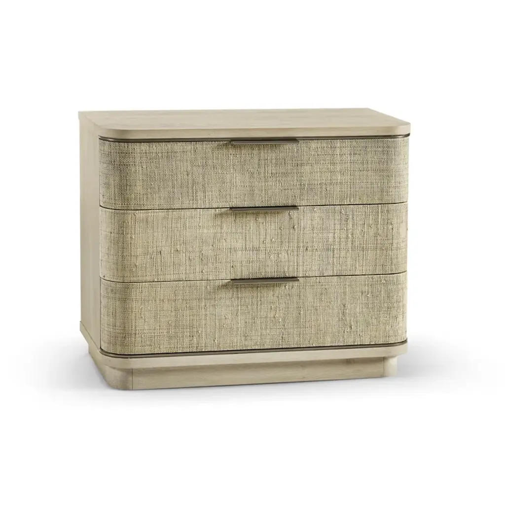 With a rustic weathered finish and clean modern lines, the nightstand features three self-closing drawers and a double USB charging post on the back, along with a cord clip. Crafted of Oak Veneers, it is accented with textured metal bar pulls for an organic touch.