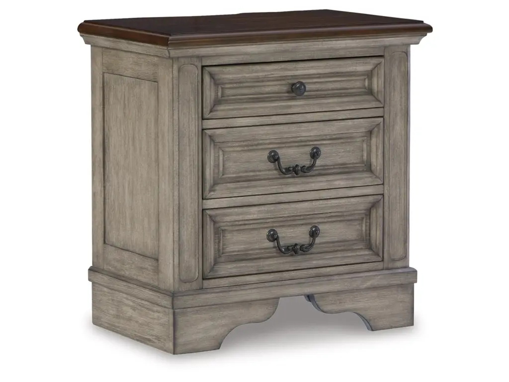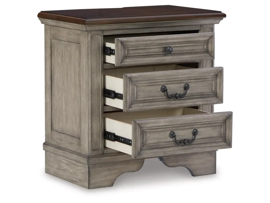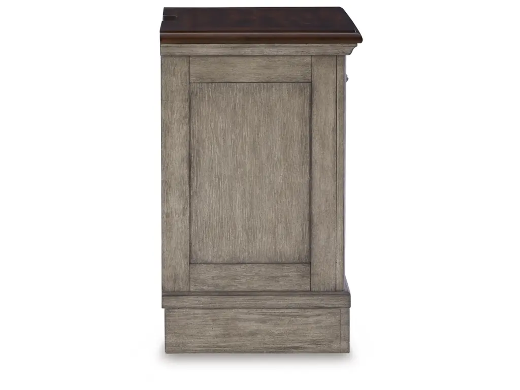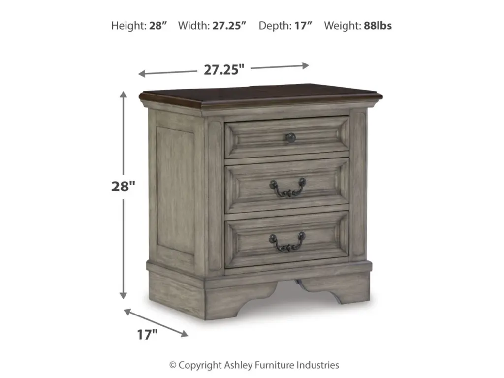 Cottage quaint styling and quality construction make the Lodenbay nightstand a dream come true. A two-tone finish provides rustic warmth, with an antiqued gray body and a rich, deep walnut on the top. The three smooth-gliding drawers’ framed fronts and dark bronze-tone hardware marry classic elegance and homey charm. Despite its vintage feel, this nightstand keeps up with your high-tech lifestyle with dual USB charging ports.