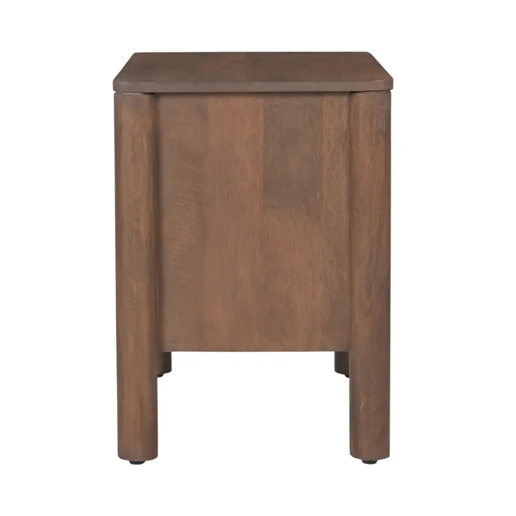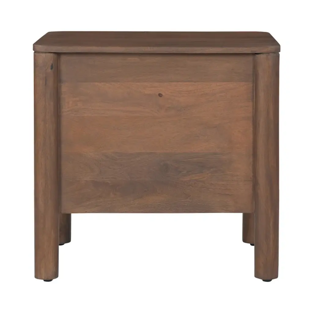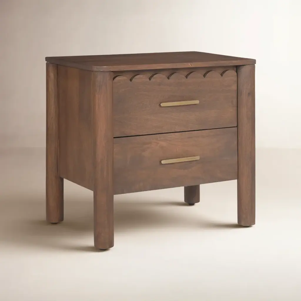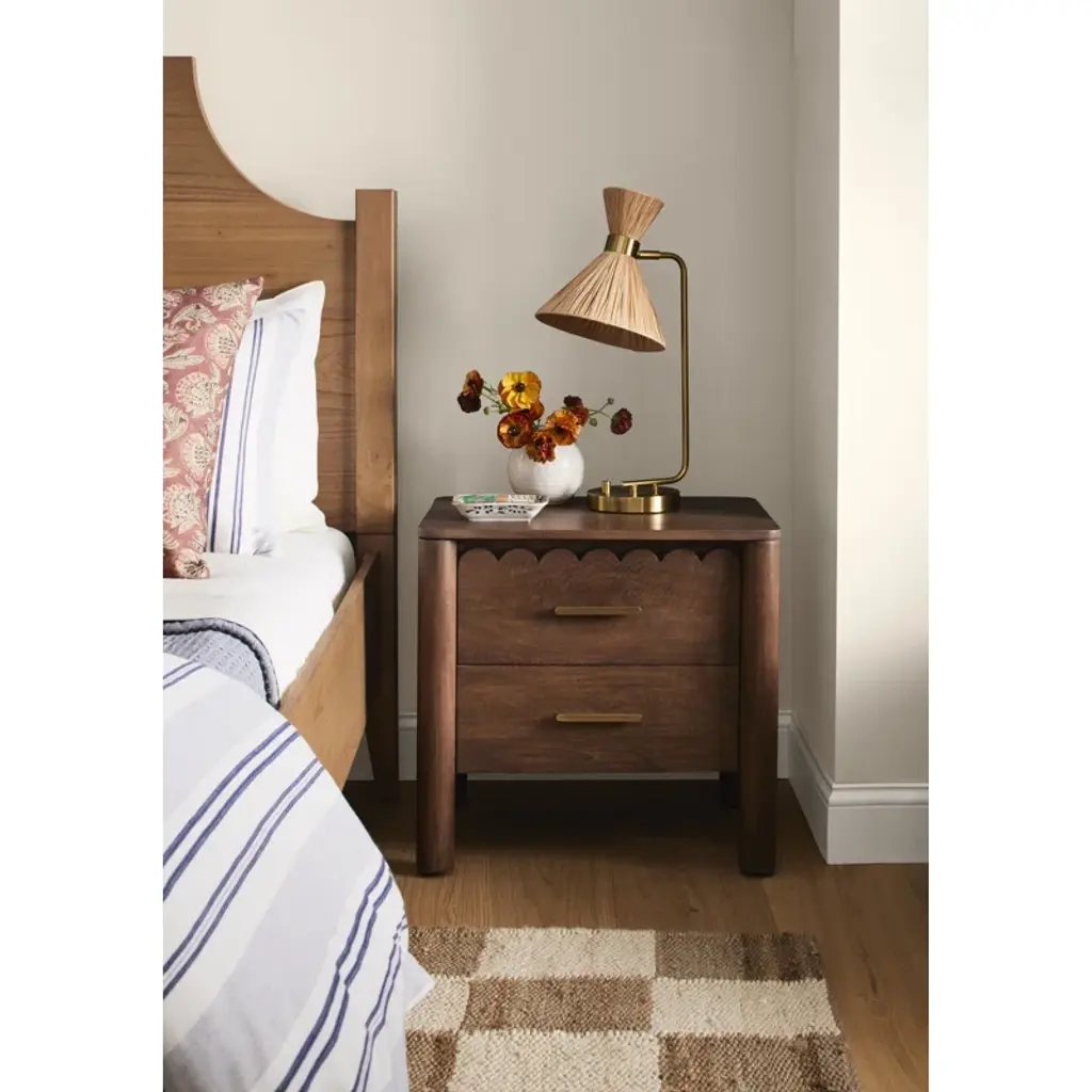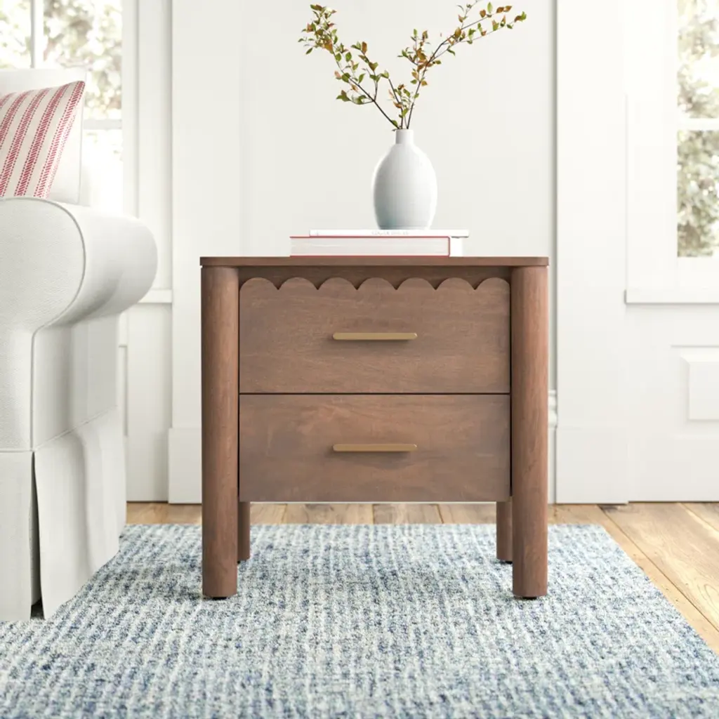 This warm and inviting nightstand, crafted from solid wood and wood veneer, offers a timeless charm that complements any bedroom. The intricate scalloped edge details and heavy brass handles pay homage to classical influences, while the natural wood grain color variation adds a touch of rustic appeal. Featuring two soft-close drawers, this nightstand provides ample storage for your bedside essentials. Plus, with its finished back and no assembly required, you can enjoy its classic beauty right away.