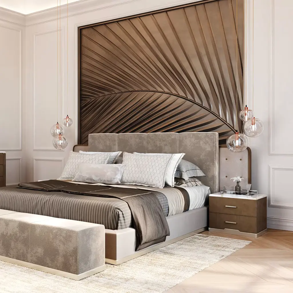 Bedside table with wooden structure, covered in Nabuk leather. It has a white Michelangelo marble top and metal handles in a champagne finish. For customization options please, contact the Concierge. This piece is part of the Secret Shapes Collection.