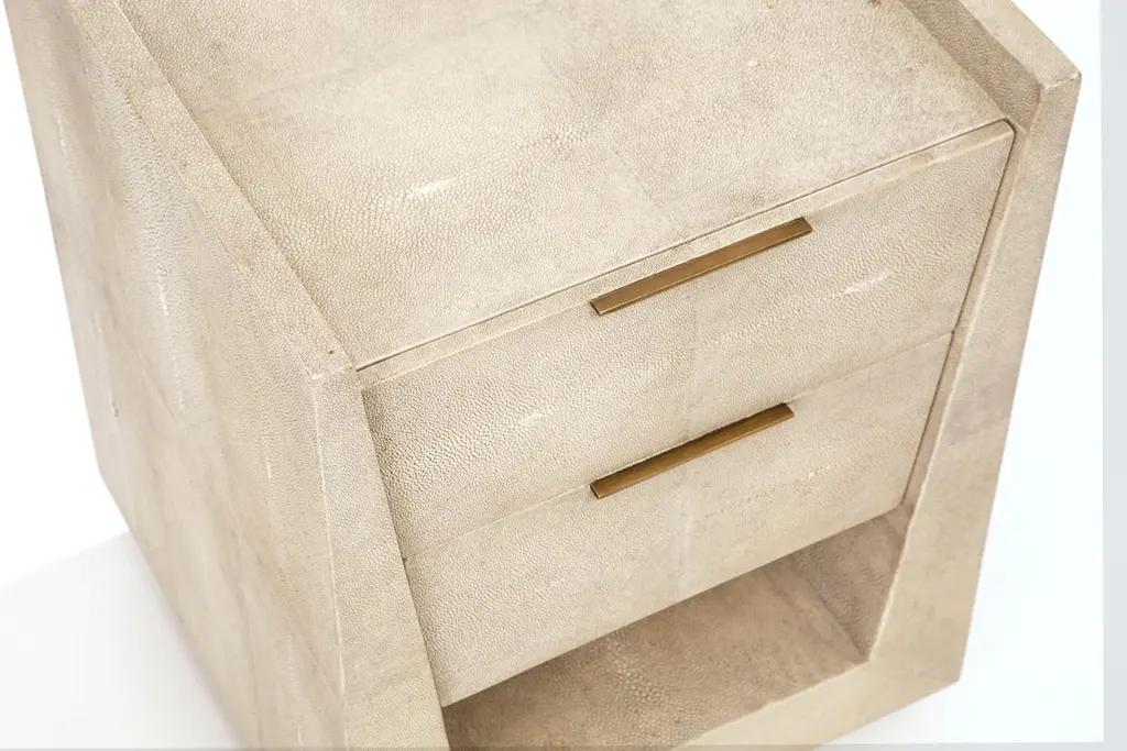 The Paris based label has distinguished themselves since their launch, with their iconic use of shagreen mixed with brass and other exotic materials. All furniture is handcrafted by skilled artisans, ultimately making each piece unique, designed in Paris and produced in the Philippines.The Lola Bedside by R&Y Augousti is an elegant piece with its subtle geometry. This bedside table is completely inlaid in cream shagreen with discreet bronze-patina brass flat handles for the drawers. The drawers are inlaid in gemelina wood. This bedside table includes two drawers and a lower open shelf. This piece is also available in a grey shagreen, image at end of slide. Custom color/sizing available on request.The finish of the shagreen is authentic as it is hand-dyed and the designer calls the finish look: "antique natural shagreen."The dimensions of this piece are 40 x 40 x 50 cm / 15.75" x 15.75 x 20"All R&Y Augousti pieces are handmade by artisans, ultimately making each piece unique.Wipe clean with soft dry cloth.Acclaimed design duo Ria & Yiouri Augousti have established themselves since the 1990s as pioneers of modern-vintage style through their luxurious Art Deco inspired collections.The Paris based label has distinguished themselves since their launch, with their iconic use of shagreen mixed with brass and other exotic materials. All furniture is handcrafted by skilled artisans, ultimately making each piece unique. All shagreen-covered items should be kept out of direct sunlight, color variants may occur on the stingray and other exotic finishes, but this showcases the Parisian label's commitment to creating authentic luxurious products using natural components.