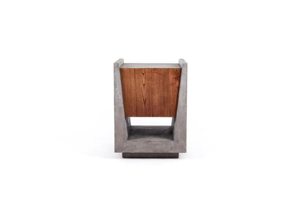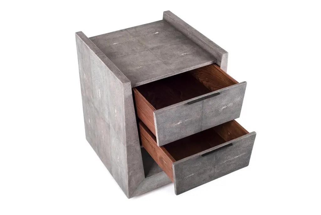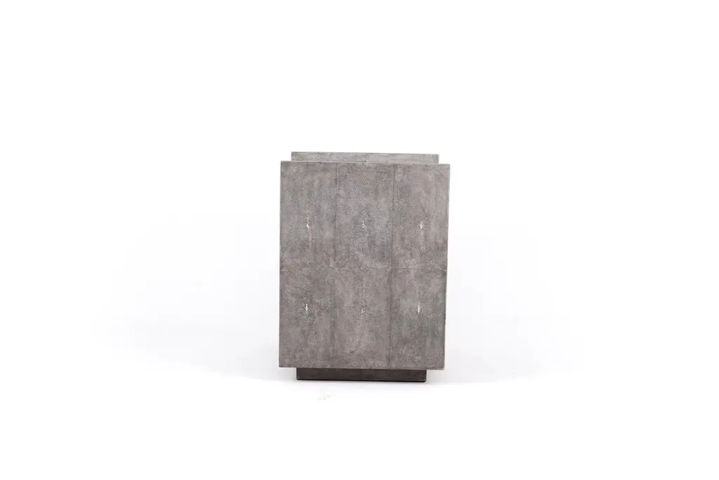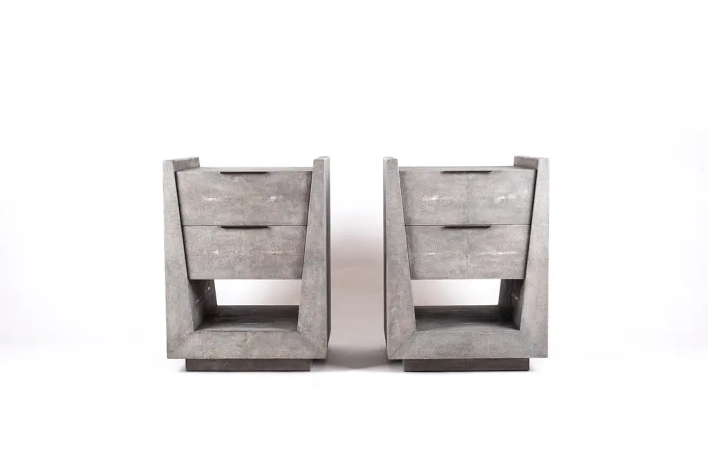 The Paris based label has distinguished themselves since their launch, with their iconic use of shagreen mixed with brass and other exotic materials. All furniture is handcrafted by skilled artisans, ultimately making each piece unique, designed in Paris and produced in the Philippines.The Lola Bedside by R&Y Augousti is an elegant piece with its subtle geometry. This bedside table is completely inlaid in grey shagreen with discreet bronze-patina brass flat handles for the drawers. The drawers are inlaid in gemelina wood. This bedside table includes two drawers and a lower open shelf. This piece is also available in a cream shagreen, image at end of slide. Custom color/sizing available on request.The finish of the shagreen is authentic as it is hand-dyed by our artisans The dimensions of this piece are 40 x 40 x 50 cm / 15.75" x 15.75 x 20"All R&Y Augousti pieces are handmade by artisans, ultimately making each piece unique. Wipe clean with soft dry cloth.Acclaimed design duo Ria & Yiouri Augousti have established themselves since the 1990s as pioneers of modern-vintage style through their luxurious Art Deco inspired collections.The Paris based label has distinguished themselves since their launch, with their iconic use of shagreen mixed with brass and other exotic materials. All furniture is handcrafted by skilled artisans, ultimately making each piece unique.All shagreen-covered items should be kept out of direct sunlight, color variants may occur on the stingray and other exotic finishes, but this showcases the Parisian label's commitment to creating authentic luxurious products using natural components.