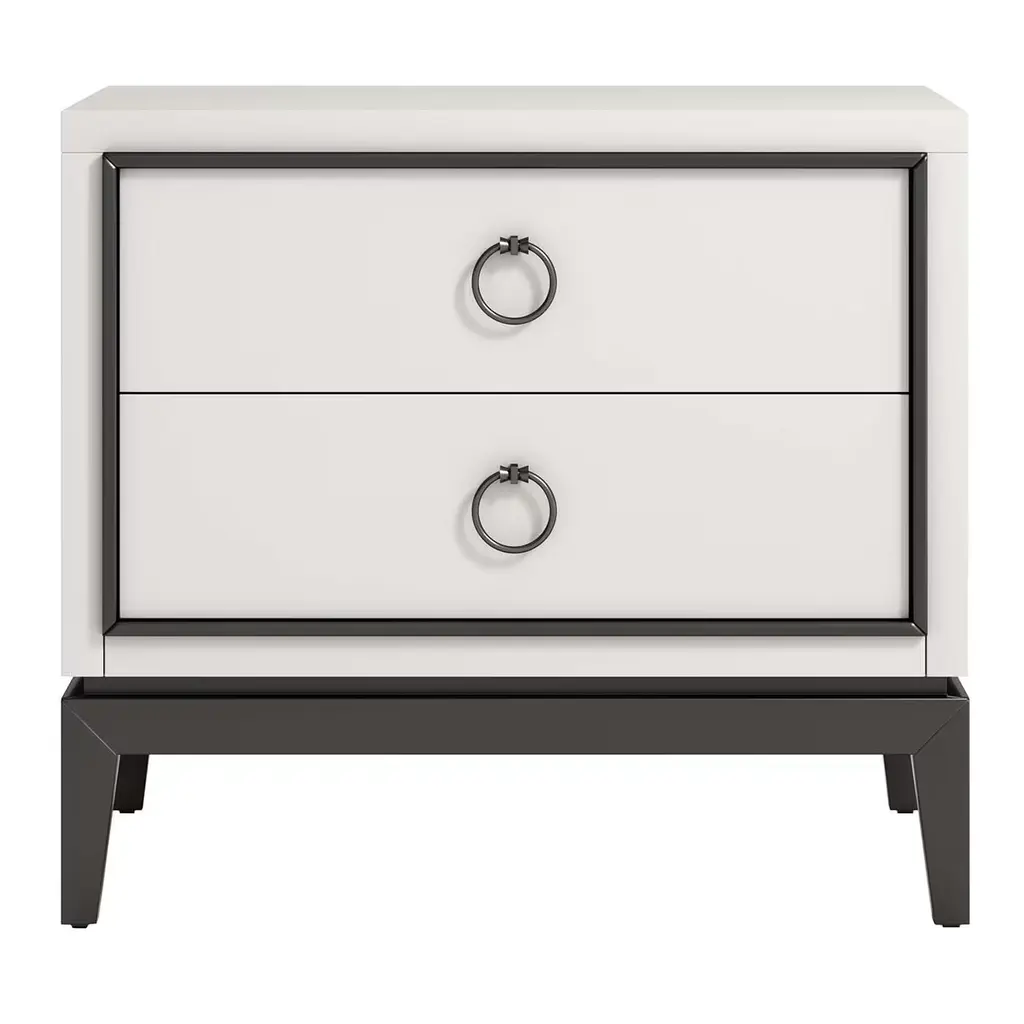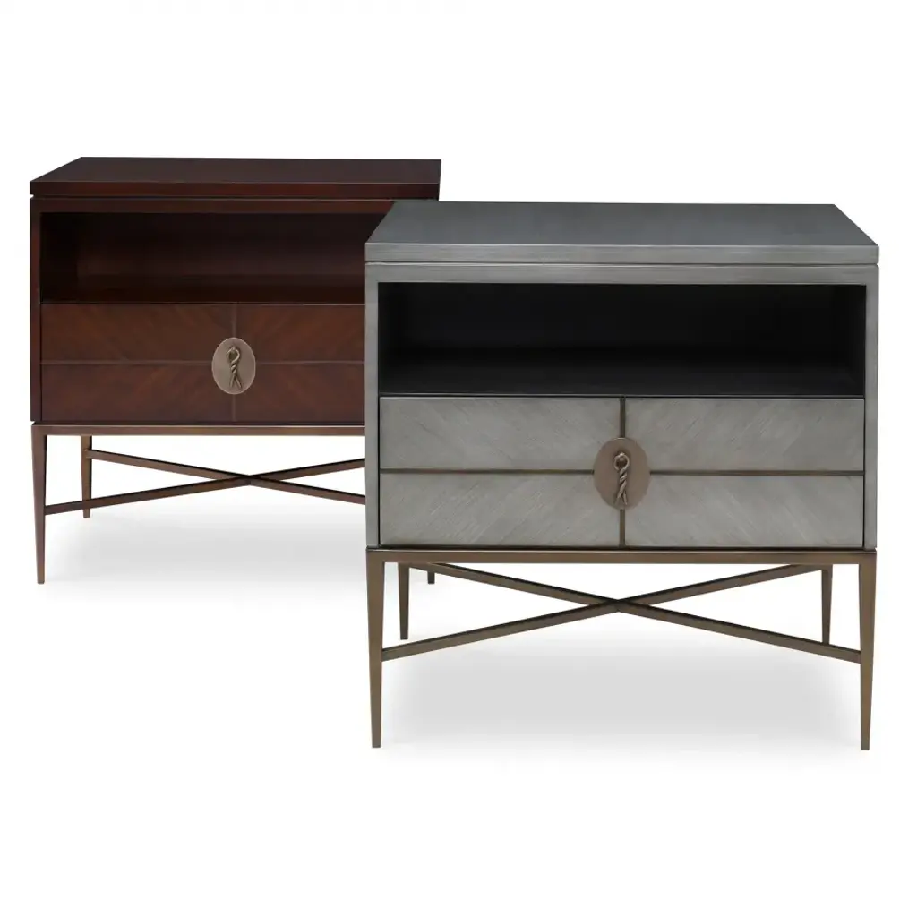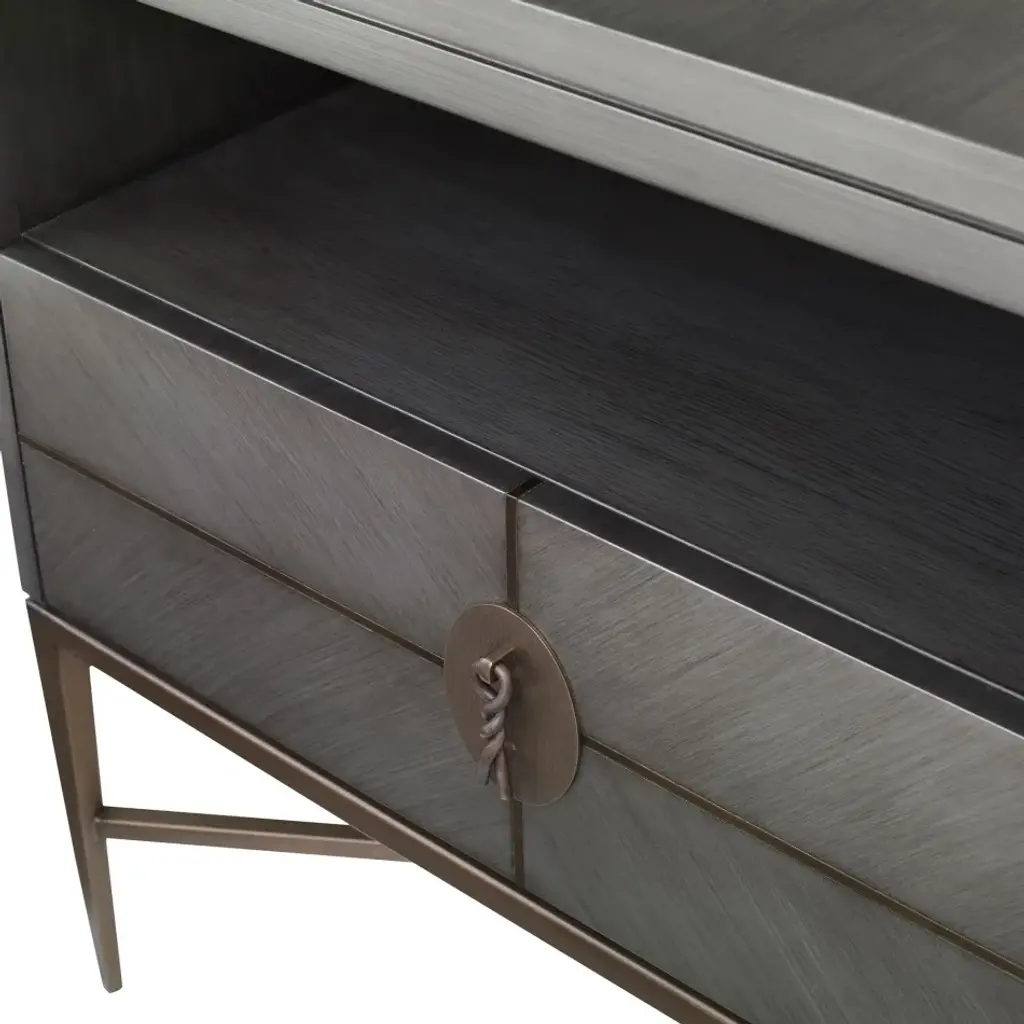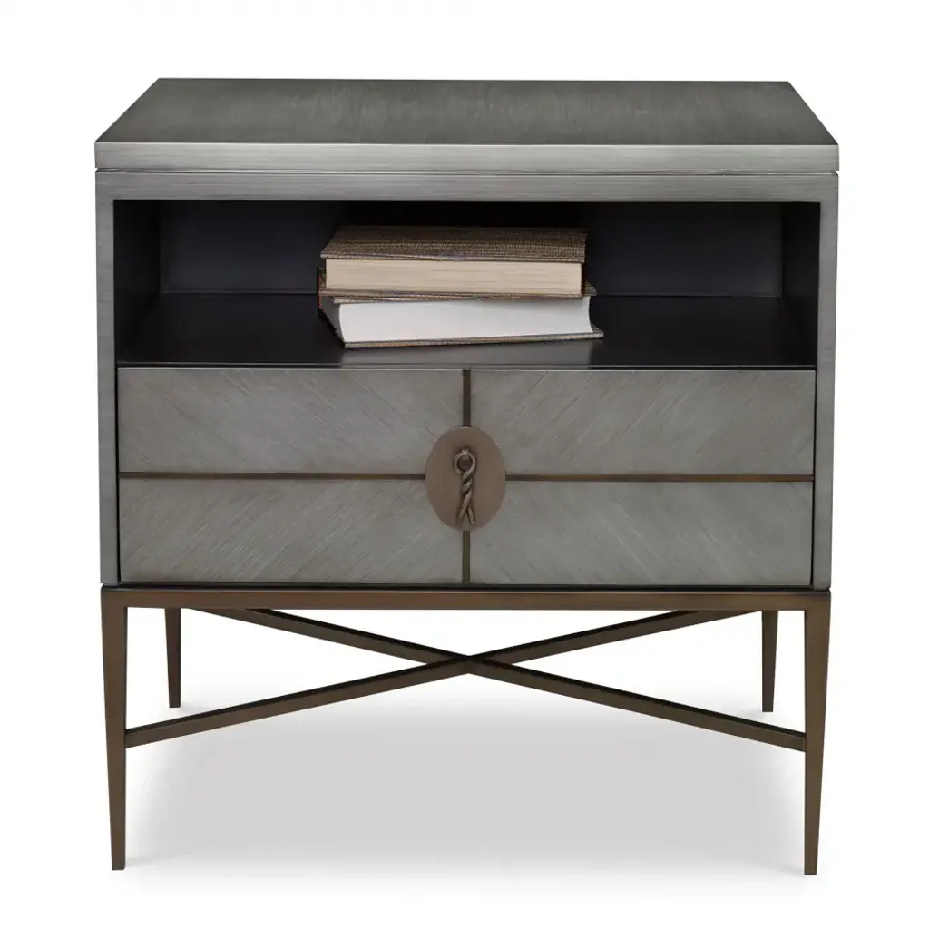 This nightstand features inverted diamond veneer with brass inlay. One drawer includes a twisted tassel pull mounted on an oval plate. The piece is raised on an antique brass finished base with tall tapering legs. Warm grey finish with antique brass accents.
