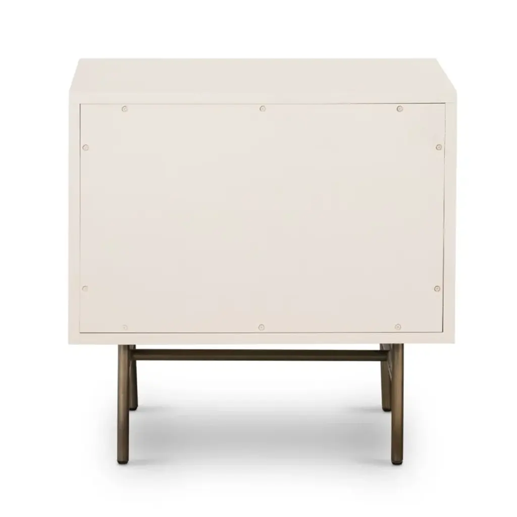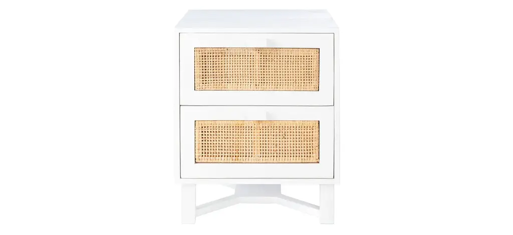 Bring a light look to bedroom styling. A two-drawer nightstand features woven cane panels and half-moon hardware finished in an aged brass.