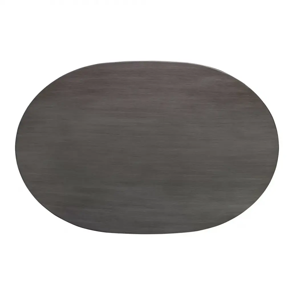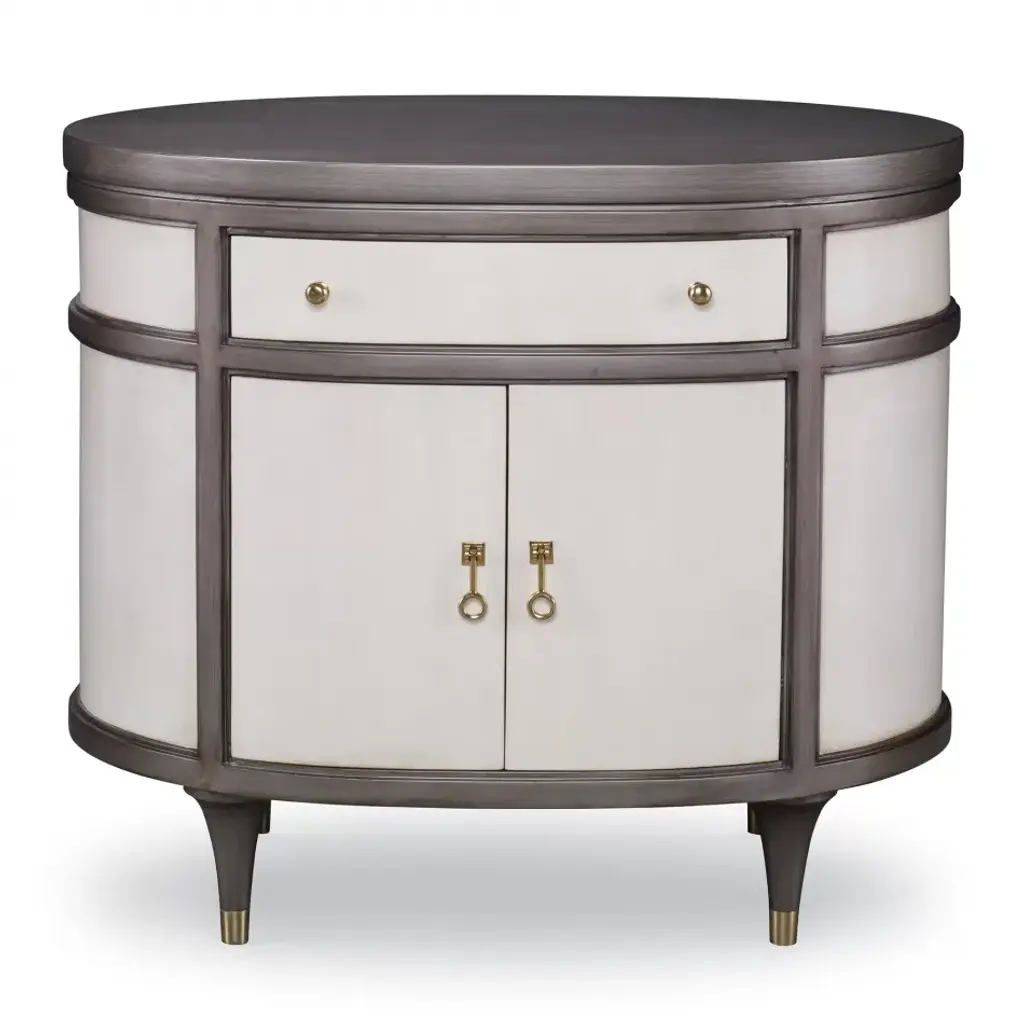 This oval shaped tabel consists of Mahogany solids and veneers. One drawer is raised over two doors enclosing an adjustable shelf. Turned wooden legs with brass ferrules support the piece. Steel grey with linen finish. Brass decorative hardware.